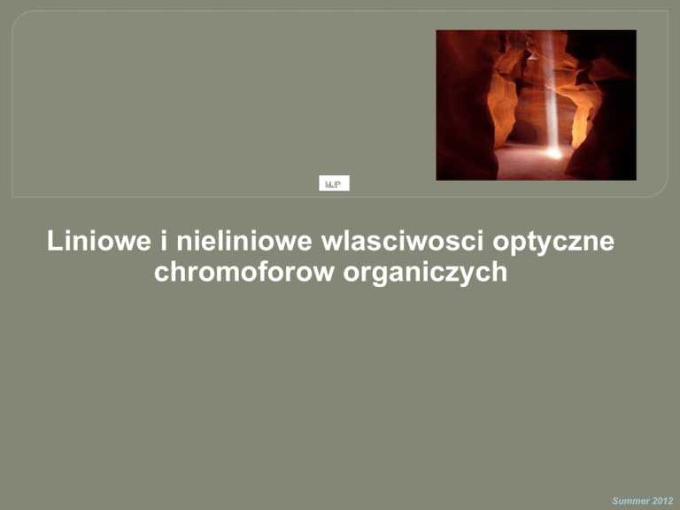 Liniowe i nieliniowe wlasciwosci optyczne chromoforow organiczych Summer 2012 Ar N nm 07 NH N NH N Zn Ar R R N N N Ar R 890 nm Davis, Pawlicki, Anderson 2008 N HN N HN 1185 nm Frampton et al. Org. Biomol. Chem. 2007, 1056 N N Ni N N N Ar N Ph Zn N NH Ox N Ph Ar Zn lmax = 1030 nm N N Ar N lmax = 1030 nm N N N Ni N Ar N N Ar Ar X Ar X Ar X = O, lmax = 1150 nm X = S, lmax = 1320 nm Sprutta et al. J. Am. Chem. Soc. 2005, 13108 Sprutta et al. J. Org. Chem. 2007, 9501 R ‘Porphocyanine’ Ar Ar N N N Ar Ni N N N Ni N N Ar Ar R = H, lmax = 1243 nm R = OMe, lmax = 1176 nm R = NO2, lmax = 1348 nm Ar HN O NH CO2Et lmax = 530 nm Em = 570 nm N N lmax = 550 nm Em = 570 nm Cy3 N N lmax = 650 nm Em = 670 nm Cy5 N N lmax = 750 nm, Em = 805 nm Cy7 F B F O F O O B F O lmax = 980 nm N F F B O O N Hales et al. J. Am. Chem. Soc. 2006, 11362 F O B F O lmax = 890 - 1050 nm Halik, Hartmann Chem. Eur. J. 1999, 2511 OR OR CN O HN N CN N NH POCl3 HN NH N O NC RO RO lmax = 725 nm OR CN N X N N X N X = BF2, lmax = 750 nm X = BPh2, lmax = 825 nm NC RO Fisher et al. Angew. Chem. Int. Ed. 2007, 3750 RO OR S CN CN Ph N N B N Ph Ph B Ph S N N N S Ph B Ph Ph B Ph N N S NC NC OR lmax = 894 nm Em = 912 nm OR N N lmax = 941 nm Em = 966 nm Fisher et al. Angew. Chem. Int. Ed. 2011, 1406 Absorpcja - docelowo NIR Zastosowania - ogniwa słoneczne - terapia fotodynamiczna - przewodniki organiczne (p lub n) - obrazowanie tkanek (fluorescencja) Wielkość układu p – zasięg efektywnej koniugacji Rodzaj połączenia – wpływ na koniugację Wpływ podstawników (donor vs. akceptor) Ładunek w układzie p Luminofor (ang. luminophore) A part of a molecular entity (or atom or group of atoms) in which electronic excitation associated with a given emission band is approximately localized. (Analogous to chromophore for absorption spectra) (IUPAC, 1997). Luminescence - spontaneous emission of radiation from an electronically or vibrationally excited species not in thermal equilibrium with its environment. N HO MeO N 1845 r. Sir J. F. W. Herschel ur. 1792 - Slough zm. 1871 Em = 450 nm A. Jabłoński ur. 1898 - Woskresnówka zm. 1980 - Warszawa Fluorescencja - sparowane spiny, stan singletowy (czas ~10 ns proces szybki) Fosforescencja - niesparowane spiny, stan trypletowy (1ms - 1s proces wolny) Absorpcja - S0 - Sn Populacja S1 Sn → S1 10-12s (wewnętrzna konwersja IC) S1 → S0 10-8s (deaktywacja promienista) IC - następuje również w obrębie stanu elektronowego pomiędzy stanami wibracyjnymi Postać widma emisyjnego jest niezależna od długości fali wzbudzenia (Kasha’s Rule – 1950 r.) Wydajność kwantowa emisji jest niezależna od długości fali wzbudzenia (Vavilov – 1926 r.) Przesunięcie Stokesa - emisja obserwowana jest zawsze przy niższej energii niż absorpcja Sir G. G. Stokes ur. 1819 zm. 1903 Widmo emisyjne (fluorescencja) jest zazwyczaj lustrzanym odbiciem absorpcji obserwowanej przy najniższej energii - absorpcji S0 → S1 wydajność kwantowa – ilość wyemitowanych fotonów w stosunku do liczby pochłoniętych F = G/(G+knr) czas życia – czas jaki spędza molekuła w stanie wzbudzonym pomniejszony o przejścia w obrębie stanów elektronowych tn = 1/(G+knr) tn = 1/G