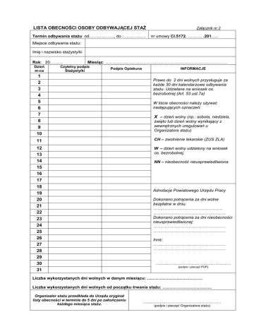 LISTA OBECNOŚCI OSOBY ODBYWAJĄCEJ STAŻ Termin odbywania stażu: od……..………., do ………….…. Załącznik nr 2 nr umowy CI.5172. ………. .201….. Miejsce odbywania stażu: Imię i nazwisko stażysty/ki Rok: 20……… Dzień m-ca Miesiąc: …………………….……………………………………………………. Czytelny podpis Stażysty/ki Podpis Opiekuna 1 2 3 4 5 6 7 8 9 10 11 12 13 14 15 16 INFORMACJE Prawo do 2 dni wolnych przysługuje za każde 30 dni kalendarzowe odbywania stażu. Udzielane na wniosek os. bezrobotnej (Art. 53 ust.7a) W liście obecności należy używać następujących oznaczeń: X – dzień wolny (np.: sobota, niedziela, święto lub dzień wolny wynikający z wewnętrznych uregulowań u Organizatora stażu) CH – zwolnienie lekarskie (ZUS ZLA) W – dzień wolny udzielony na wniosek os. bezrobotnej, NN – nieobecność nieusprawiedliwiona 17 18 19 20 21 22 23 24 25 26 27 28 29 30 31 Adnotacje Powiatowego Urzędu Pracy Dokonano potrącenia za dni wolne bezpłatne w dniu: …….…………………………………… …………………………………………… Dokonano potrącenia za dni nieobecności nieusprawiedliwionej: …………………………………………… …………………………………………… Inne: …………………………………………… …………………………………………… ………………………………………… (podpis i pieczęć PUP) Liczba wykorzystanych dni wolnych w danym miesiącu: ………………………………… Liczba wykorzystanych dni wolnych od początku trwania stażu: …………………………….. Organizator stażu przedkłada do Urzędu oryginał listy obecności w terminie do 5 dni po zakończeniu każdego miesiąca stażu. ...................………………………………… (podpis i pieczęć Organizatora stażu) UWAGA : 1. Każdy podpis Uczestnika należy potwierdzić podpisem Opiekuna lub Organizatora stażu. W przypadku braku podpisu Opiekuna stypendium za dany dzień nie zostanie naliczone. 2. Listę obecności – oryginał, należy złożyć do 5 dni po zakończeniu każdego miesiąca 3. 4. 5. 6. 7. stażu. w Powiatowym Urzędzie Pracy - pokój nr 8 (kancelaria podawcza). W przypadku, gdy termin dostarczenia listy obecności wypada w dni wolne od pracy, listę należy złożyć w pierwszym dniu roboczym przypadającym po tym terminie Dni wolnych udziela się na podstawie wniosku osoby bezrobotnej odbywającej staż kierowanego do Organizatora stażu. Wniosek zatwierdzony przez Organizatora stażu jest podstawą do udzielenia dnia wolnego. Obowiązek kontroli liczby udzielonych dni wolnych spoczywa na Organizatorze stażu. Wnioski należy dołączyć do listy obecności. W przypadku braku takiego wniosku za dane dni stypendium nie zostanie naliczone. po każdych kolejnych 30 dniach kalendarzowych odbywania stażu należą się 2 dni wolne, za które przysługuje stypendium (tj. dni przepracowane, dni ustawowo wolne oraz zwolnienia lekarskie). W przypadku pobrania dnia wolnego przed upływem 30 dni, stypendium za te dni nie zostanie naliczone. Za ostatni miesiąc odbywania stażu Organizator stażu jest obowiązany udzielić dni wolnych przed upływem terminu zakończenia stażu. W przypadku, gdy u Organizatora stażu dni wolne od pracy wynikają np.: z charakteru wykonywanej działalności, zmianowości i innych uregulowań wewnętrznych, a zatem nie są to soboty, niedziele lub święta, należy ten fakt uzasadnić w informacji pisemnej dołączonej do listy obecności. Listy obecności niepoprawnie wypełnione, bez wpisów, pieczątek, nie mogą stanowić podstawy do wypłaty stypendium.