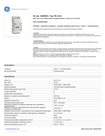 Nr kat. 665909 | Typ TR+S15 Opis: TR+S 15 transformator bezpieczeństwa; 2 mod; 12-12-24V AC EAN 5413656659099 Produkty > Aparatura modułowa > Aparaty modułowe pomocnicze > Seria T - Transformatory Transformatory bezpieczeństwa Transformatory dzwonkowe. Brzęczki i dzwonki Reprezentatywny obraz • Funkcja: Obniżanie napięcia do niskiej (bezpiecznej) wartości przy zasilaniu obwodów sterowniczych w celu wyeliminowania ryzyka przebicia. Stosowane główniew miejscach o niekorzystnych warunkach otoczenia (np. podwyższona wilgotność). • Zastosowanie: Zasilanie obwodów kontrolnych np. przekaźników impulsowych, styczników sterujących oświetleniem lub ogrzewaniem także zasilanie obwodów sygnałów dźwiękowych. • Zalety: Wszystkie transformatory dzwonkowe i bezpieczeństwa posiadają zabezpieczenie przeciwzwarciowe obwodów wtórnych dzięki zastosowaniu zintegrowanego elementu PTC lub systemu bezpiecznego (tzw. fail-safe). Uzwojenie pierwotne jest odseparowane galwanicznie od uzwojenia wtórnego. Wyróżniają się bardzo cichą pracą. Napięcia wtórne 4, 8, 12, 24 i 48V. Zaciski posiadają stopień ochrony IP20. Możliwość podłączenia do uzwojenia wtórnego dwóch urządzeń. Dla transformatorów o mocy powyżej 25 VA dostępne są osłony zacisków z możliwością plombowania. Deskryptory Category Seria T - Transformatory Seria produktów Transformator Specyfikacje Seria (2) Seria TS+ Moc (VA) 15 VA Napięcie (V) 230V 50Hz / 240V 60Hz Rodzaj produktu Transformator bezpieczeństwa Maksymalny pobór mocy (VA) 15 VA Liczba modułów 2 Opakowanie standardowe 1 Napięcie uzwojenia pierwotnego (V) 230 Vac Normy IEC 61558-1-2-6 Napięcie izolacji (kV) 4 kV Ochrona przeciwzwarciowa Minimalne napięcie uzwojenia wtórnego przy obciążeniu znamionowym Napięcie uzwojenia wtórnego przy znamionowym napięciu uzwojenia pierwotnego Napięcie znamionowe i częstotliwość (Hz) uzwojenia pierwotnego PTC i “Fail Safe” Maksymalne napięcie uzwojenia wtórnego bez obciążenia 1.3 x Un sec Protection Degree IP20 Zaciski śrubowe Płaski i PH1 Przekrój przewodów maksymalny (mm²) 1 x 4 mm² / 2 x 2.5 mm² Przekrój przewodów minimalny (mm²) 1 x 0.5 mm² Zakres temperatury pracy (°C) -20°C / +40°C pl.geindustrial.com Nr kat. 665909 | Typ TR+S15 0.95 x Un sek. 12/12/24 V 230V 50Hz / 240V 60Hz Data utworzenia: 08/03/2017 Page No. 1 Klasyfikacje Uznania CE ETIM 5.0 EC002486 ETIM 6.0 EC002486 Wymiary Ciężar pl.geindustrial.com Nr kat. 665909 | Typ TR+S15 0.380 kg Data utworzenia: 08/03/2017 Page No. 2