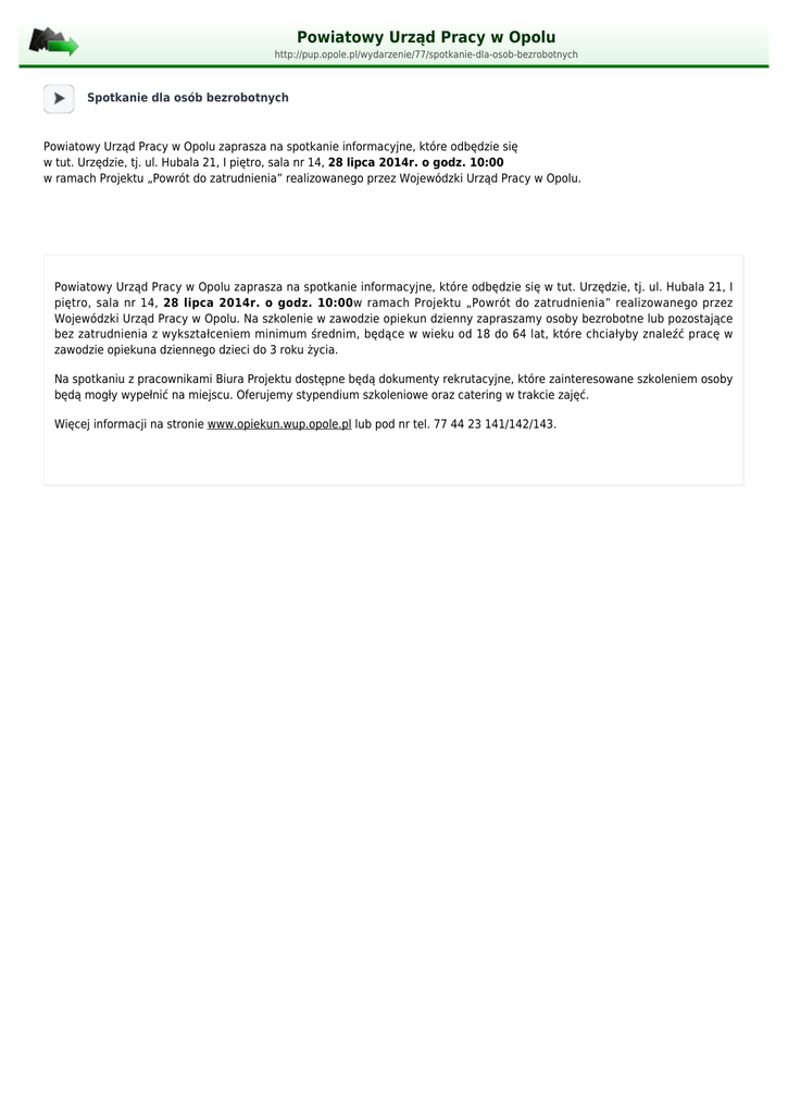 Powiatowy Urząd Pracy w Opolu http://pup.opole.pl/wydarzenie/77/spotkanie-dla-osob-bezrobotnych Spotkanie dla osób bezrobotnych Powiatowy Urząd Pracy w Opolu zaprasza na spotkanie informacyjne, które odbędzie się w tut. Urzędzie, tj. ul. Hubala 21, I piętro, sala nr 14, 28 lipca 2014r. o godz. 10:00 w ramach Projektu „Powrót do zatrudnienia” realizowanego przez Wojewódzki Urząd Pracy w Opolu. Powiatowy Urząd Pracy w Opolu zaprasza na spotkanie informacyjne, które odbędzie się w tut. Urzędzie, tj. ul. Hubala 21, I piętro, sala nr 14, 28 lipca 2014r. o godz. 10:00w ramach Projektu „Powrót do zatrudnienia” realizowanego przez Wojewódzki Urząd Pracy w Opolu. Na szkolenie w zawodzie opiekun dzienny zapraszamy osoby bezrobotne lub pozostające bez zatrudnienia z wykształceniem minimum średnim, będące w wieku od 18 do 64 lat, które chciałyby znaleźć pracę w zawodzie opiekuna dziennego dzieci do 3 roku życia. Na spotkaniu z pracownikami Biura Projektu dostępne będą dokumenty rekrutacyjne, które zainteresowane szkoleniem osoby będą mogły wypełnić na miejscu. Oferujemy stypendium szkoleniowe oraz catering w trakcie zajęć. Więcej informacji na stronie www.opiekun.wup.opole.pl lub pod nr tel. 77 44 23 141/142/143.
