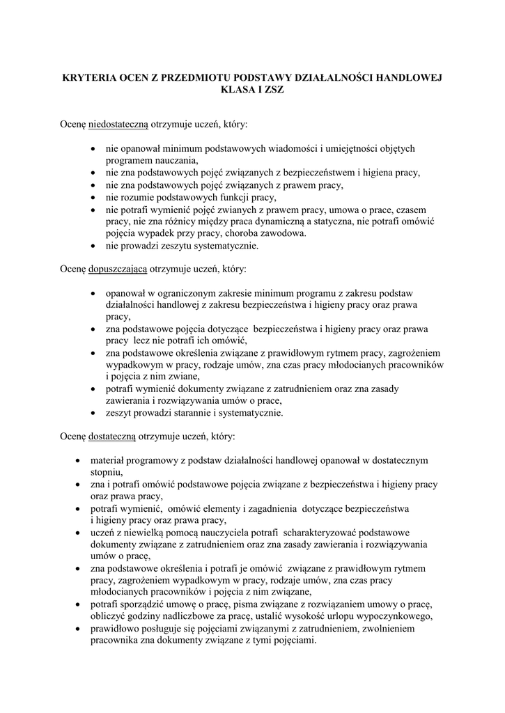 KRYTERIA OCEN Z PRZEDMIOTU PODSTAWY DZIAŁALNOŚCI HANDLOWEJ KLASA I ZSZ Ocenę niedostateczną otrzymuje uczeń, który: nie opanował minimum podstawowych wiadomości i umiejętności objętych programem nauczania, nie zna podstawowych pojęć związanych z bezpieczeństwem i higiena pracy, nie zna podstawowych pojęć związanych z prawem pracy, nie rozumie podstawowych funkcji pracy, nie potrafi wymienić pojęć zwianych z prawem pracy, umowa o prace, czasem pracy, nie zna różnicy między praca dynamiczną a statyczna, nie potrafi omówić pojęcia wypadek przy pracy, choroba zawodowa. nie prowadzi zeszytu systematycznie. Ocenę dopuszczającą otrzymuje uczeń, który: opanował w ograniczonym zakresie minimum programu z zakresu podstaw działalności handlowej z zakresu bezpieczeństwa i higieny pracy oraz prawa pracy, zna podstawowe pojęcia dotyczące bezpieczeństwa i higieny pracy oraz prawa pracy lecz nie potrafi ich omówić, zna podstawowe określenia związane z prawidłowym rytmem pracy, zagrożeniem wypadkowym w pracy, rodzaje umów, zna czas pracy młodocianych pracowników i pojęcia z nim zwiane, potrafi wymienić dokumenty związane z zatrudnieniem oraz zna zasady zawierania i rozwiązywania umów o prace, zeszyt prowadzi starannie i systematycznie. Ocenę dostateczną otrzymuje uczeń, który: materiał programowy z podstaw działalności handlowej opanował w dostatecznym stopniu, zna i potrafi omówić podstawowe pojęcia związane z bezpieczeństwa i higieny pracy oraz prawa pracy, potrafi wymienić, omówić elementy i zagadnienia dotyczące bezpieczeństwa i higieny pracy oraz prawa pracy, uczeń z niewielką pomocą nauczyciela potrafi scharakteryzować podstawowe dokumenty związane z zatrudnieniem oraz zna zasady zawierania i rozwiązywania umów o pracę, zna podstawowe określenia i potrafi je omówić związane z prawidłowym rytmem pracy, zagrożeniem wypadkowym w pracy, rodzaje umów, zna czas pracy młodocianych pracowników i pojęcia z nim związane, potrafi sporządzić umowę o pracę, pisma związane z rozwiązaniem umowy o pracę, obliczyć godziny nadliczbowe za pracę, ustalić wysokość urlopu wypoczynkowego, prawidłowo posługuje się pojęciami związanymi z zatrudnieniem, zwolnieniem pracownika zna dokumenty związane z tymi pojęciami. Ocenę dobrą otrzymuje uczeń który: uczeń opanował wiadomości w dużym stopniu z zakresu przewidzianego w programie nauczania z podstaw działalności handlowej, zna pojęcia związane z prawem pracy i działalnością handlowa oraz potrafi scharakteryzować ich zadania, cele, poprawnie stosuje wiadomości do samodzielnego rozwiązywania problemów z zakresu działalności handlowej – prawa pracy i przepisów BHP, prawidłowo klasyfikuje zagadnienia związane z bezpieczeństwem i higiena pracy oraz elementami prawa pracy, potrafi interpretować prawa oraz obowiązki pracowników oraz pracodawcy na podstawie Kodeksu pracy, potrafi określać przykłady naruszania prawa pracy na podstawie różnych źródeł informacji, potrafi sporządzić umowę o prace, pisma związane z rozwiązaniem umowy o pracę, obliczyć godziny nadliczbowe za prace, ustalić wysokość urlopu wypoczynkowego, umie określać typowe objawy różnych chorób zawodowych, występujących u pracowników handlu Ocenę bardzo dobrą otrzymuje uczeń który: opanował pełny zakres wiedzy i umiejętności objętych programem nauczania, precyzyjnie posługuje się pojęciami z zakresu z bezpieczeństwa i higieny pracy oraz prawa pracy, pojęcia związane z bezpieczeństwa i higieny pracy oraz prawa pracy, zna i potrafi je omówić, rozumie i potrafi sklasyfikować zakres działania prawa pracy oraz przepisów BHP, rozumie zagadnienia związane z kadrą pracowniczą i polityką personalną w firmie, potrafi udzielić pierwszej pomocy osobom poszkodowanym w wypadkach przy pracy – symulacja, potrafi omówić i sporządzić umowę o pracę, pisma związane z rozwiązaniem umowy o pracę, obliczyć godziny nadliczbowe za pracę, ustalić wysokość urlopu wypoczynkowego, określić zasadę kompletowania i gromadzenia akt osobowych pracownika, dobierać środki ochrony indywidualnej do rodzaju wykonywanej pracy. Ocenę celującą otrzymuje uczeń który: opanował zakres wiedzy wykraczający poza program nauczania i poszerzył go, korzystając z literatury fachowej, fachowym językiem omawia zagadnienia związane z bezpieczeństwem i higieną pracy oraz prawa pracy, biegle posługuje się zdobytymi wiadomościami i potrafi omówić ich zastosowanie w praktyce, rozumie całokształt funkcjonowania przedsiębiorstwa i biegle interpretuje zagadnienia związane z prowadzeniem działalności gospodarczej, zna przepisy i akty prawne dotyczące prawa pracy i przepisów BHP.