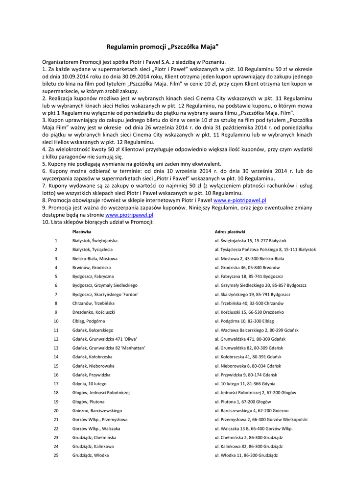 Regulamin promocji „Pszczółka Maja” Organizatorem Promocji jest spółka Piotr i Paweł S.A. z siedzibą w Poznaniu. 1. Za każde wydane w supermarketach sieci „Piotr i Paweł” wskazanych w pkt. 10 Regulaminu 50 zł w okresie od dnia 10.09.2014 roku do dnia 30.09.2014 roku, Klient otrzyma jeden kupon uprawniający do zakupu jednego biletu do kina na film pod tytułem „Pszczółka Maja. Film” w cenie 10 zł, przy czym Klient otrzyma ten kupon w supermarkecie, w którym zrobił zakupy. 2. Realizacja kuponów możliwa jest w wybranych kinach sieci Cinema City wskazanych w pkt. 11 Regulaminu lub w wybranych kinach sieci Helios wskazanych w pkt. 12 Regulaminu, na podstawie kuponu, o którym mowa w pkt 1 Regulaminu wyłącznie od poniedziałku do piątku na wybrany seans filmu „Pszczółka Maja. Film”. 3. Kupon uprawniający do zakupu jednego biletu do kina w cenie 10 zł za sztukę na film pod tytułem „Pszczółka Maja Film” ważny jest w okresie od dnia 26 września 2014 r. do dnia 31 października 2014 r. od poniedziałku do piątku w wybranych kinach sieci Cinema City wskazanych w pkt. 11 Regulaminu lub w wybranych kinach sieci Helios wskazanych w pkt. 12 Regulaminu. 4. Za wielokrotność kwoty 50 zł Klientowi przysługuje odpowiednio większa ilość kuponów, przy czym wydatki z kilku paragonów nie sumują się. 5. Kupony nie podlegają wymianie na gotówkę ani żaden inny ekwiwalent. 6. Kupony można odbierać w terminie: od dnia 10 września 2014 r. do dnia 30 września 2014 r. lub do wyczerpania zapasów w supermarketach sieci „Piotr i Paweł” wskazanych w pkt. 10 Regulaminu. 7. Kupony wydawane są za zakupy o wartości co najmniej 50 zł (z wyłączeniem płatności rachunków i usług lotto) we wszystkich sklepach sieci Piotr i Paweł wskazanych w pkt. 10 Regulaminu. 8. Promocja obowiązuje również w sklepie internetowym Piotr i Paweł www.e-piotripawel.pl 9. Promocja jest ważna do wyczerpania zapasów kuponów. Niniejszy Regulamin, oraz jego ewentualne zmiany dostępne będą na stronie www.piotripawel.pl 10. Lista sklepów biorących udział w Promocji: Placówka Adres placówki 1 Białystok, Świętojańska ul. Świętojańska 15, 15-277 Białystok 2 Białystok, Tysiąclecia al. Tysiąclecia Państwa Polskiego 8, 15-111 Białystok 3 Bielsko-Biała, Mostowa ul. Mostowa 2, 43-300 Bielsko-Biała 4 Brwinów, Grodziska ul. Grodziska 46, 05-840 Brwinów 5 Bydgoszcz, Fabryczna ul. Fabryczna 1B, 85-741 Bydgoszcz 6 Bydgoszcz, Grzymały Siedleckiego ul. Grzymały Siedleckiego 20, 85-857 Bydgoszcz 7 Bydgoszcz, Skarżyńskiego 'Fordon' ul. Skarżyńskiego 19, 85-791 Bydgoszcz 8 Chrzanów, Trzebińska ul. Trzebińska 40, 32-500 Chrzanów 9 Drezdenko, Kościuszki ul. Kościuszki 15, 66-530 Drezdenko 10 Elbląg, Podgórna ul. Podgórna 10, 82-300 Elbląg 11 Gdańsk, Balcerskiego ul. Wacława Balcerskiego 2, 80-299 Gdańsk 12 Gdańsk, Grunwaldzka 471 'Oliwa' al. Grunwaldzka 471, 80-309 Gdańsk 13 Gdańsk, Grunwaldzka 82 'Manhattan' al. Grunwaldzka 82, 80-309 Gdańsk 14 Gdańsk, Kołobrzeska ul. Kołobrzeska 41, 80-391 Gdańsk 15 Gdańsk, Nieborowska ul. Nieborowska 8, 80-034 Gdańsk 16 Gdańsk, Przywidzka ul. Przywidzka 9, 80-174 Gdańsk 17 Gdynia, 10 lutego ul. 10 lutego 11, 81-366 Gdynia 18 Głogów, Jedności Robotniczej ul. Jedności Robotniczej 2, 67-200 Głogów 19 Głogów, Plutona ul. Plutona 1, 67-200 Głogów 20 Gniezno, Barciszewskiego ul. Barciszewskiego 4, 62-200 Gniezno 21 Gorzów Wlkp., Przemysłowa ul. Przemysłowa 2, 66-400 Gorzów Wielkopolski 22 Gorzów Wlkp., Walczaka ul. Walczaka 13 B, 66-400 Gorzów Wlkp. 23 Grudziądz, Chełmińska ul. Chełmińska 2, 86-300 Grudziądz 24 Grudziądz, Kalinkowa ul. Kalinkowa 82, 86-300 Grudziądz 25 Grudziądz, Włodka ul. Włodka 11, 86-300 Grudziądz 26 Inowrocław, 800-lecia Inowrocławia ul. 800-lecia Inowrocławia 27, 88-100 Inowrocław 27 Janki, Ogrodowa ul. Ogrodowa 31/35, 00-893 Warszawa 28 Jarocin, Wrocławska ul. Wrocławska 58B, 63-200 Jarocin 29 Józefosław, Geodetów ul. Geodetów 23, 05-509 Józefosław 30 Kalisz, Polna ul. Polna 14, 62-800 Kalisz 31 Katowice, Bażantów ul. Bażantów 4, 40-668 Katowice ul. Gawronów 2 32 Katowice, Gawronów 40-555 Katowice ul. Wincentego Witosa 4 33 Kędzierzyn-Koźle 47-223 Kędzierzyn-Koźle 34 Kielce, Warszawska ul. Warszawska 26, 25-312 Kielce 35 Konin, Spółdzielców ul. Spółdzielców 6a, 62-510 Konin 36 Konstancin Jeziorna, Warszawska ul. Warszawska 171, 05-520 Konstancin Jeziorna 37 Koszalin, Okrzei ul. Okrzei 3, 75-203 Koszalin 38 Koźmin, Klasztorna ul. Klasztorna 12, 63-720 Koźmin Wlkp. 39 Legnica, NMP ul. Najświętszej Marii Panny 9, 59-220 Legnica 40 Leszno, Konstytucji 3-go Maja al. Konstytucji 3 Maja 5, 64-100 Leszno 41 Leszno, Narutowicza ul. Narutowicza 84, 64-100 Leszno 42 Lubin, Zwierzyckiego ul. prof. J. Zwierzyckiego 3, 59-300 Lubin 43 Lublin, Wolska ul. Wolska 11, 20-411 Lublin 44 Luboń, Żabikowska ul. Żabikowska 66, 62-032 Luboń 45 Łódź, Pabianicka ul. Pabianicka 245, 93-457 Łódź 46 Łódź, Św. Teresy 'Włókniarzy' ul. Św. Teresy od Dzieciątka Jezus 100, 91-341 Łódź ul. Targowa 10 47 Niepołomice, Targowa 32-005 Niepołomice 48 Oborniki Wlkp., Czarnkowska ul. Czarnkowska 42, 64-600 Oborniki Wlkp. 49 Pabianice, Zamkowa ul. Zamkowa 31, 95-200 Pabianice 50 Piła, Ogińskiego ul. Ogińskiego 33, 64-920 Piła 51 Piła, Powstańców Wlkp. al. Powstańców Wlkp. 162, 64-920 Piła 52 Piotrków Trybunalski, Wojska Polskiego ul. Wojska Polskiego 137/139, 97-300 Piotrków Trybunalski 53 Plewiska, Grunwaldzka ul. Grunwaldzka 519 abc, 62-064 Plewiska 54 Płock, Tysiąclecia ul. Tysiąclecia 2, 09-400 Płock 55 Płock, Wyszogrodzka 127 'Mazovia' ul. Wyszogrodzka 127, 09-410 Płock 56 Płock, Wyszogrodzka 144 'Wisła' ul. Wyszogrodzka 144, 09-400 Płock 57 Pniewy, Międzychodzka ul. Międzychodzka 22C, 62-045 Pniewy 58 Poznań, Druskienicka ul. Druskienicka 12a, 60-476 Poznań ul. Drużbickiego 2 59 Poznań, Drużbickiego 61-693