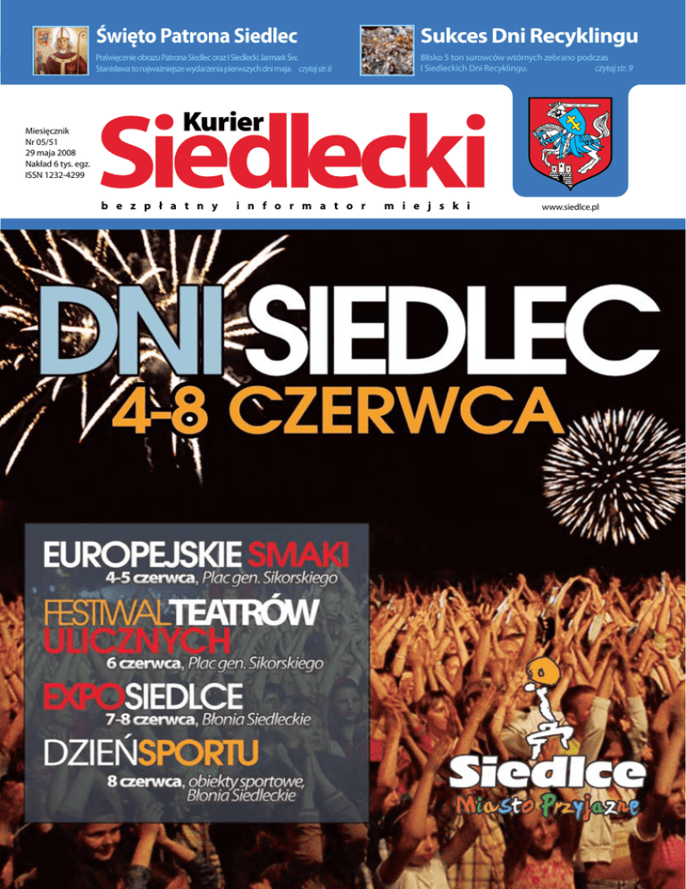 Miesięcznik Nr 05/51 29 maja 2008 Nakład 6 tys. egz. ISSN 1232-4299 Święto Patrona Siedlec Sukces Dni Recyklingu Poświęcenie obrazu Patrona Siedlec oraz I Siedlecki Jarmark Św. Stanisława to najważniejsze wydarzenia pierwszych dni maja. czytaj str. 6 Blisko 5 ton surowców wtórnych zebrano podczas I Siedleckich Dni Recyklingu. czytaj str. 9 Kurier b e z p ł a t n y www.siedlce.pl i n f o r m a t o r m i e j s k i www.siedlce.pl Kurier Siedlecki Maj/Czerwiec 2008 1 2 Kurier Siedlecki Maj/Czerwiec 2008 www.siedlce.pl DNI SIEDLEC 4 - 8 czerwca 4 CZERWCA - środa „EUROPEJSKIE SMAKI”, cz. I Seminarium Miast Partnerskich „WE ARE THE EUROPE”: Siedlce i Berdyczów dla Europy Sala Konferencyjna Urzędu Miasta 10.00 Turniej piłki nożnej szkół ponadgimnazjalnych boisko ZSP nr 1, ul. Konarskiego 11.00 Uroczyste Otwarcie Memoriału Henryka Guta w lekkiej atletyce Stadion OSiR, ul. B. Prusa 12.00 Mecze otwarcia Mini Mistrzostw Europy Miast Partnerskich EUROTOWN-FOOTBALL 2008 12.15-13.00 Grupa A: Siedlce - Berdyczów 13.15-14.00 Grupa B: Pescantina - Wilno boisko ZSP nr 1, ul. Konarskiego 16.00-18.00 Podsumowanie Konkursu organizowanego przez Tygodnik Siedlecki „MAŁA MISS i MAŁY MISTER REGIONU SIEDLECKIEGO” Dworek Panderosa, ul. Partyzantów 18.00 SIEDLCE KLASYCZNIE, koncert w wykonaniu uczniów i pedagogów Zespołu Szkół Muzycznych w Siedlcach Sala Biała MOK 16.00-20.00 „EUROPEJSKIE SMAKI, czyli… przez żołądek do serca” kuchnia i prezentacje artystyczne: Siedlce i Berdyczów Plac gen. Sikorskiego 16.15 „UKRAIŃSKIE ROZMAITOŚCI, czyli… Pisz Pan na Berdyczów” - Koncert Miasta Berdyczów Plac gen. Sikorskiego 20.30 KONCERT „MADE IN SIEDLCE” Plac gen. Sikorskiego PATRONAT HONOROWY: 9.30-10.45 KS. BP ZBIGNIEW KIERNIKOWSKI Ordynariusz Diecezji Siedleckiej ADAM STRUZIK Marszałek Województwa Mazowieckiego WOJCIECH KUDELSKI Prezydent Miasta Siedlce MARIUSZ DOBIJAŃSKI Przewodniczący Rady Miasta Siedlce ORGANIZATORZY: 5 CZERWCA - czwartek „EUROPEJSKIE SMAKI”, cz. II Wieczór DJ-ów FILMOWY WEHIKUŁ CZASU 9.30-10.45 Seminarium Miast Partnerskich „WE ARE THE EUROPE”: Pescantina, Rejon Wileński i Sabinov dla Europy, Kirów i Wołkowysk - ku przyjaźni Sala Senatu Akademii Podlaskiej, Pałac Ogińskich 10.00-13.00 STROFY O SIEDLCACH - VI Konkurs Recytatorski Sala Widowiskowa CKiS 10.00-13.00 FESTIWAL SPORTOWO-REKREACYJNY SZKÓŁ PONADGIMNAZJALNYCH Stadion OSiR, ul. B. Prusa 14.00 Mecze w ramach Mini Mistrzostw Europy Miast Partnerskich EUROTOWN-FOOTBALL 2008 14.00-14.45 Grupa B: Siedlce Oldboye - Pescantina 15.00-15.45 Grupa A: Sabinov - Siedlce boisko ZSP nr 1, ul. Konarskiego 16.00-20.00 „EUROPEJSKIE SMAKI, czyli… przez żołądek do serca” kuchnia i prezentacje artystyczne: Pescantina, Rejon Wileński i Sabinov Plac gen. Sikorskiego 19.00 KONCERT „EUROPA DŹWIĘKU” Wieczór DJ-ów Plac gen. Sikorskiego 21.00 SIEDLECKI FILMOWY WEHIKUŁ CZASU • Koncert „Kinematografia serc” - przeboje muzyki filmowej - Maciej Turkowski i zaproszeni goście • „Anatomia miasta” - projekcja filmu o Siedlcach w reżyserii Stanisława Manturzewskiego • Teatr „Wehikuł Czasu” - projekcja filmu „Nosferatu symfonia grozy” z 1979 r. - muzyka na żywo z udźwiękowieniem - gitara, bas, klawesyn, saksofon, perkusja, akordeon Plac przy Fontannie www.siedlce.pl WSPÓŁORGANIZATORZY: Kuria Diecezjalna w Siedlcach, Muzeum Regionalne, TKKF Siedlce, PSZS w Siedlcach, UKS „Rawa”, UKS „12”, UKS „7”, UKS „8”, OSiR, WLKS Siedlce - Iganie Nowe, CKP w Siedlcach, ZSP nr 4, ZSP nr 1, ZS nr 1, ZS nr 2, PG nr 1, SP 12, ZSP nr 2, I LO oraz pozostałe placówki oświatowe. Bezpieczeństwo zapewniają: Policja, Straż Miejska, Meditrans, Agencja Ochrony Skorpion. Kurier Siedlecki Maj/Czerwiec 2008 3 DNI SIEDLEC 4 - 8 czerwca WYDARZENIA OKOLICZNOŚCIOWE 7 CZERWCA godz. 18.00 Uroczyste Nieszpory. VI Rocznica Ingresu Ordynariusza Siedleckiego Księdza Biskupa Zbigniewa Kiernikowskiego Katedra Siedlecka 10 CZERWCA IX ROCZNICA WIZYTY APOSTOLSKIEJ OJCA ŚWIETEGO JANA PAWŁA II w SIEDLCACH godz. 10.00-12.30 Seminarium otwarte z udziałem dr WANDY PÓŁTAWSKIEJ Honorowej Obywatelki Miasta Siedlce godz. 10.00-11.30 Projekcja Filmu „DUŚKA” reż. Wanda Różycka Aula Instytutu Biologii ul. B. Prusa 12 godz. 11.45-12.30 Spotkanie z dr Wandą Półtawską, bohaterką filmu „DUŚKA” Aula Instytutu Biologii ul. B. Prusa 12 godz. 18.00 Msza Św. pod przewodnictwem Jego Ekscelencji Księdza Biskupa Ordynariusza Siedleckiego Zbigniewa Kiernikowskiego, upamiętniająca IX Rocznicę Wizyty Ojca Świętego Jana Pawła II w Siedlcach Katedra Siedlecka godz. 19.15 - 20.30 „WIERNOŚĆ POWOŁANIU W ŻYCIU I NAUCZANIU OJCA ŚWIĘTEGO JANA PAWŁA II” wykład dr Wandy Półtawskiej Honorowej Obywatelki Miasta Siedlce Katedra Siedlecka Linie specjalne MPK Miejskie Przedsiębiorstwo Komunikacyjne 7 i 8 czerwca zwiększy ilość kursujących autobusów. I tak linie Nr 3 i 4 w tych dniach dniach, w czasie trwania imprez będą kursowały co 30 minut, z tym że autobusy tych linii ostatnie kursy wykonają około godziny 23.00 z przystanków przy ulicy Poniatowskiego. Dodatkowe 3 autobusy MPK podstawi na ul. Północnej, które po zakończeniu uroczystości odjadą następującymi trasami: 1. Północna – Dąbrowskiego – Chrobrego – Sokołowska – Piłsudskiego – Warszawska – Monte Casino – Kurpiowska. 2. Północna - Dąbrowskiego - Chrobrego - Sokołowska - Świętojańska Partyzantów - Rozkosz 3. Północna – Poniatowskiego – Prusa – Kazimierzowska – Wyszyńskiego – Floriańska – Składowa – Kurpiowska. Dodatkowe autobusy będą odpowiednio oznakowane. MPK Siedlce informuje jednocześnie, że w okolice Błoni Siedleckich można dojechać autobusami linii 3, 4, 9 i 15. 4 Kurier Siedlecki Maj/Czerwiec 2008 6 CZERWCA - piątek ŚWIĘTO 1. SIEDLECKIEGO BATALIONU ROZPOZNAWCZEGO FESTIWAL TEATRÓW ULICZNYCH „POD NIEBEM” WIECZÓR GALOWY MIAST