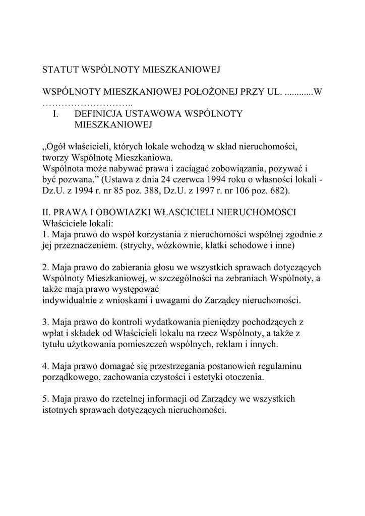 STATUT WSPÓLNOTY MIESZKANIOWEJ WSPÓLNOTY MIESZKANIOWEJ POŁOśONEJ PRZY UL. ............W ……………………….. I. DEFINICJA USTAWOWA WSPÓLNOTY MIESZKANIOWEJ „Ogół właścicieli, których lokale wchodzą w skład nieruchomości, tworzy Wspólnotę Mieszkaniowa. Wspólnota moŜe nabywać prawa i zaciągać zobowiązania, pozywać i być pozwana.” (Ustawa z dnia 24 czerwca 1994 roku o własności lokali Dz.U. z 1994 r. nr 85 poz. 388, Dz.U. z 1997 r. nr 106 poz. 682). II. PRAWA I OBOWIAZKI WŁASCICIELI NIERUCHOMOSCI Właściciele lokali: 1. Maja prawo do współ korzystania z nieruchomości wspólnej zgodnie z jej przeznaczeniem. (strychy, wózkownie, klatki schodowe i inne) 2. Maja prawo do zabierania głosu we wszystkich sprawach dotyczących Wspólnoty Mieszkaniowej, w szczególności na zebraniach Wspólnoty, a takŜe maja prawo występować indywidualnie z wnioskami i uwagami do Zarządcy nieruchomości. 3. Maja prawo do kontroli wydatkowania pieniędzy pochodzących z wpłat i składek od Właścicieli lokalu na rzecz Wspólnoty, a takŜe z tytułu uŜytkowania pomieszczeń wspólnych, reklam i innych. 4. Maja prawo domagać się przestrzegania postanowień regulaminu porządkowego, zachowania czystości i estetyki otoczenia. 5. Maja prawo do rzetelnej informacji od Zarządcy we wszystkich istotnych sprawach dotyczących nieruchomości. 6. Maja obowiązek ponosić wydatki związane z utrzymaniem lokali, a takŜe utrzymaniem nieruchomości wspólnej. Wydatki te i ich zmiany określone są przez Zarządcę na piśmie. 7. Maja obowiązek przestrzegania terminu wpłat (do 10-tego kaŜdego miesiąca) na rachunek bankowy wskazany przez Zarządcę, zaś w wypadku przekroczenia terminu płacić odsetki. 8. Maja obowiązek zgłaszając do Zarządcy wszelkie zmiany w liczbie osób zamieszkujących lokale, mające istotny wpływ na wysokość opłat i prowadzona ewidencje meldunkowa. Obowiązek ten ciąŜy takŜe na właścicielu, który zamierza sprzedać lokal. Za zobowiązania dotyczące nieruchomości wspólnej odpowiada Wspólnota bez ograniczeń, a kaŜdy właściciel lokalu - w części odpowiadającej jego udziałowi w tej nieruchomości. III. NAJWYśSZA WŁADZA WSPÓLNOTY JEST JEJ WALNE ZEBRANIE 1. Zebranie Wspólnoty ma prawo podejmować wszelkie uchwały dotyczące nieruchomości. Uchwały te wiąŜą członków Wspólnoty oraz Zarządcę. Uchwały, których treść sprzeczna jest z prawem są niewaŜne, a Zarządcą moŜe odmówić ich realizacji. 2. Zebrania Wspólnoty zwołuje Zarządca co najmniej raz w roku, w pierwszym kwartale kaŜdego roku, a jego celem jest: - sprawozdanie z działalności za ubiegły rok z wykonania gospodarczego planu rzeczowego i finansowego, łącznie z analiza kosztów prowadzenia nieruchomości - uchwalenie rocznego planu gospodarczego na rok bieŜący dot. nieruchomości wspólnej oraz wysokości opłat na pokrycie kosztów zarządzania, a takŜe bieŜącej składki remontowej - ocena wyników działalności Zarządcy wraz z podjęciem stosownej uchwały dotyczącej absolutorium W razie potrzeby zebranie Wspólnoty moŜe być zwołane przez Zarządcę - kaŜdorazowo lub na wniosek co najmniej 1/10 ogółu właścicieli. 3. Uchwały właścicieli podejmowane są na zebraniu poprzez indywidualne głosowanie. Uchwała moŜe być podjęta takŜe w wyniku częściowego głosowania na zebraniu i częściowego indywidualnego zbierania głosów. O treści tak powstałej uchwały właściciele powinni być poinformowani na piśmie. 4. Uchwały zapadają w głosowaniu większością głosów właścicieli, liczona wg udziałów, chyba, Ŝe w uchwale podjętej w tym trybie postanowiono, Ŝe w określonej sprawie na kaŜdego właściciela przypada jeden głos. 5. Właściciele mogą uczestniczyć w głosowaniu przez pełnomocnika. Pełnomocnictwo moŜe być udzielone wyłącznie na piśmie. 6. Miejsce, termin i porządek zebrania podaje Zarządca na piśmie z dwutygodniowym wyprzedzeniem. 7. Zebrania Wspólnoty są protokołowane. W protokole naleŜy stwierdzić prawidłowość zwołania zebrania, dołączyć listę obecności, odnotować treść podjętych uchwał i wyniki głosowania. Protokół podpisują: przewodniczący zebrania i protokolant. IV. ZARZADZANIE NIERUCHOMOSCIA 1. Obowiązkiem Wspólnoty jest podjąć stosowna uchwałę określającą sposób zarządzania nieruchomością Zarządzanie moŜe odbywać się poprzez wybór ze swego grona jednolub kilku-osobowego Zarządu. Zarządzanie moŜe być powierzone osobie prawnej lub fizycznej zw. Zarządca, z którym zawiera się odpowiednią umowę-zlecenie. 2. W wypadku powierzenia zarządzania osobie prawnej lub fizycznej, Wspólnota wybiera ze swego grona przedstawicieli zwanych Rada Wspólnoty, w liczbie osób ustalonej przez Wspólnotę. Rada działa w okresach pomiędzy zebraniami Wspólnoty i reprezentuje ja we współpracy z Zarządcą – kadencja Rady trwa trzy lata. Członek Rady moŜe być w kaŜdym czasie przez Wspólnotę odwołany. Wygaśnięcie mandatu członka Rady następuje takŜe na skutek zrzeczenia się mandatu lub upływu kadencji. 3. Rada spełnia funkcje doradcze, a takŜe, z upowaŜnienia Wspólnoty, funkcje kontrolne w stosunku do Zarządcy. W wypadku powierzenia zarządzania, Wspólnota zobowiązana jest podjąć uchwałę upowaŜniającą Rade Wspólnoty do podpisania w jej imieniu stosownej umowy. 4. Powołanie Rady Wspólnoty nie ogranicza w Ŝadnym przypadku prawa właścicieli do indywidualnego występowania do Zarządcy. 5. Zarządca kieruje sprawami Wspólnoty i reprezentuje jej interesy na zewnątrz oraz w stosunkach miedzy Wspólnota a poszczególnymi właścicielami. 6. Umowa zawierana z Zarządca winna określić zakres czynności, które w ramach zarządu zwykłego, moŜe on podejmować samodzielnie. 7. Do podjęcia przez Zarządcę czynności przekraczających zakres zwykłego zarządu, wymienionych w art. 22 pkt. 2 do 7 ustawy, wymagane jest udziel