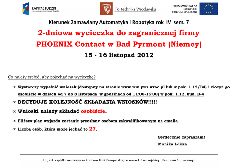Kierunek Zamawiany Automatyka i Robotyka rok IV sem. 7 2-dniowa wycieczka do zagranicznej firmy PHOENIX Contact w Bad Pyrmont (Niemcy) 15 - 16 listopad 2012 Co należy zrobić, aby pojechać na wycieczkę? • Wystarczy wypełnić wniosek (dostępny na stronie www.wm.pwr.wroc.pl lub w pok. 1.12/B4) i złożyć go osobiście w dniach od 7 do 8 listopada (w godzinach od 11:00-15:00) w pok. 1.12, bud. B-4 • DECYDUJE KOLEJNOŚĆ SKŁADANIA WNIOSKÓW!!!!! • Wnioski należy składać osobiście. • Bliższy plan wyjazdu zostanie przesłany osobom zakwalifikowanym na emaila. • Liczba osób, która może jechać to 27. Serdecznie zapraszam! Monika Lekka