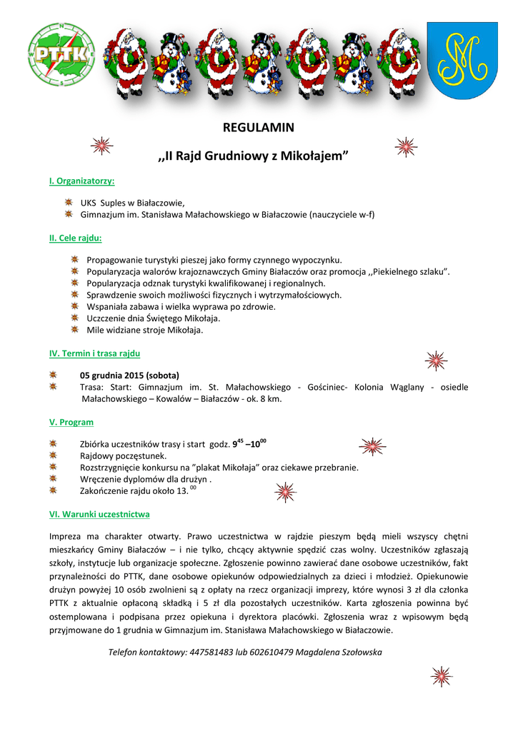 REGULAMIN ,,II Rajd Grudniowy z Mikołajem” I. Organizatorzy: UKS Suples w Białaczowie, Gimnazjum im. Stanisława Małachowskiego w Białaczowie (nauczyciele w-f) II. Cele rajdu: Propagowanie turystyki pieszej jako formy czynnego wypoczynku. Popularyzacja walorów krajoznawczych Gminy Białaczów oraz promocja ,,Piekielnego szlaku”. Popularyzacja odznak turystyki kwalifikowanej i regionalnych. Sprawdzenie swoich możliwości fizycznych i wytrzymałościowych. Wspaniała zabawa i wielka wyprawa po zdrowie. Uczczenie dnia Świętego Mikołaja. Mile widziane stroje Mikołaja. IV. Termin i trasa rajdu 05 grudnia 2015 (sobota) Trasa: Start: Gimnazjum im. St. Małachowskiego - Gościniec- Kolonia Wąglany - osiedle Małachowskiego – Kowalów – Białaczów - ok. 8 km. V. Program Zbiórka uczestników trasy i start godz. 945 –1000 Rajdowy poczęstunek. Rozstrzygnięcie konkursu na ”plakat Mikołaja” oraz ciekawe przebranie. Wręczenie dyplomów dla drużyn . Zakończenie rajdu około 13. 00 VI. Warunki uczestnictwa Impreza ma charakter otwarty. Prawo uczestnictwa w rajdzie pieszym będą mieli wszyscy chętni mieszkańcy Gminy Białaczów – i nie tylko, chcący aktywnie spędzić czas wolny. Uczestników zgłaszają szkoły, instytucje lub organizacje społeczne. Zgłoszenie powinno zawierać dane osobowe uczestników, fakt przynależności do PTTK, dane osobowe opiekunów odpowiedzialnych za dzieci i młodzież. Opiekunowie drużyn powyżej 10 osób zwolnieni są z opłaty na rzecz organizacji imprezy, które wynosi 3 zł dla członka PTTK z aktualnie opłaconą składką i 5 zł dla pozostałych uczestników. Karta zgłoszenia powinna być ostemplowana i podpisana przez opiekuna i dyrektora placówki. Zgłoszenia wraz z wpisowym będą przyjmowane do 1 grudnia w Gimnazjum im. Stanisława Małachowskiego w Białaczowie. Telefon kontaktowy: 447581483 lub 602610479 Magdalena Szołowska VII. Świadczenia organizatorów: Pamiątkowy znaczek rajdowy Dyplom dla drużyny Poświadczenie punktów na OTP Opieka przewodnicka na trasie rajdu Poczęstunek rajdowy Upominek dla każdego uczestnika. VIII. Obowiązki uczestników: Grupowe przejście trasy rajdu. Ubiór dostosowany do warunków atmosferycznych. Posiadanie legitymacji z opłaconą składką za 2015 r. (dotyczy członków PTTK). Zachowanie zgodne z przepisami ruchu drogowego, ppoż., bhp i regulaminem rajdu. Stosowanie się do postanowień organizatorów. Posiadanie dobrego humoru, zdrowia i cierpliwości. IX. Uwagi końcowe Impreza nie ma charakteru sportowego i nie będzie prowadzona klasyfikacja za zajęte miejsca i czasy uzyskane na mecie, a ukończenie rajdu ma znaczenie honorowe. Rajd odbędzie się bez względu na warunki atmosferyczne. W wypadku nie przybycia na rajd uczestnik traci prawo do świadczeń, opłaty na rzecz organizacji imprezy zwracane nie będzie. Zgłoszenia po terminie nie będą przyjmowane ze względu na brak możliwości zabezpieczenia świadczeń. Za rzeczy zagubione lub pozostawione przez uczestników imprezy Organizator nie ponosi odpowiedzialności. Uczestnicy biorą udział w rajdzie na własną odpowiedzialność i ryzyko, co potwierdzają swoim czytelnym podpisem na karcie zgłoszeń. Zalecamy ubezpieczenie we własnym zakresie. Organizatorzy nie ponoszą odpowiedzialności za zdarzenia losowe zaistniałe podczas imprezy. Członkowie PTTK oraz uczniowie posiadają ubezpieczenie. Impreza nie ma charakteru komercyjnego, organizowana jest siłami wolontariatu( non profit). Do zobaczenia na rajdzie!