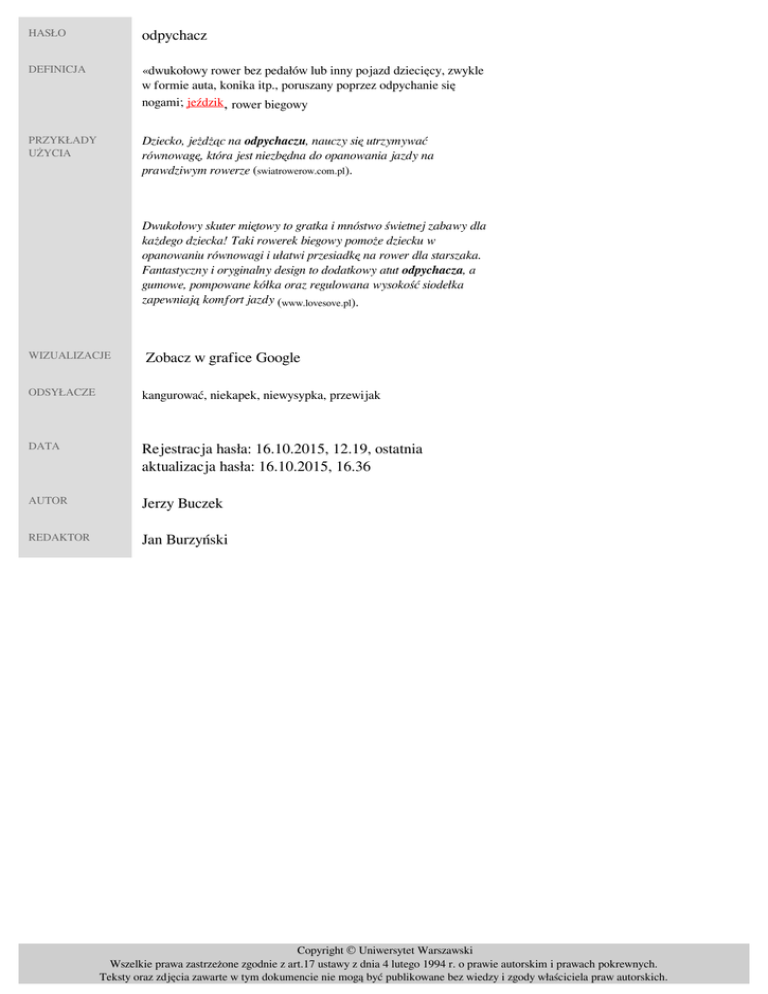 HASŁO odpychacz DEFINICJA «dwukołowy rower bez pedałów lub inny pojazd dziecięcy, zwykle w formie auta, konika itp., poruszany poprzez odpychanie się nogami; jeździk, rower biegowy» PRZYKŁADY UŻYCIA Dziecko, jeżdżąc na odpychaczu, nauczy się utrzymywać równowagę, która jest niezbędna do opanowania jazdy na prawdziwym rowerze (swiatrowerow.com.pl). Dwukołowy skuter miętowy to gratka i mnóstwo świetnej zabawy dla każdego dziecka! Taki rowerek biegowy pomoże dziecku w opanowaniu równowagi i ułatwi przesiadkę na rower dla starszaka. Fantastyczny i oryginalny design to dodatkowy atut odpychacza, a gumowe, pompowane kółka oraz regulowana wysokość siodełka zapewniają komfort jazdy (www.lovesove.pl). WIZUALIZACJE Zobacz w grafice Google ODSYŁACZE kangurować, niekapek, niewysypka, przewijak DATA Rejestracja hasła: 16.10.2015, 12.19, ostatnia aktualizacja hasła: 16.10.2015, 16.36 AUTOR Jerzy Buczek REDAKTOR Jan Burzyński Copyright © Uniwersytet Warszawski Wszelkie prawa zastrzeżone zgodnie z art.17 ustawy z dnia 4 lutego 1994 r. o prawie autorskim i prawach pokrewnych. Teksty oraz zdjęcia zawarte w tym dokumencie nie mogą być publikowane bez wiedzy i zgody właściciela praw autorskich. Powered by TCPDF (www.tcpdf.org)