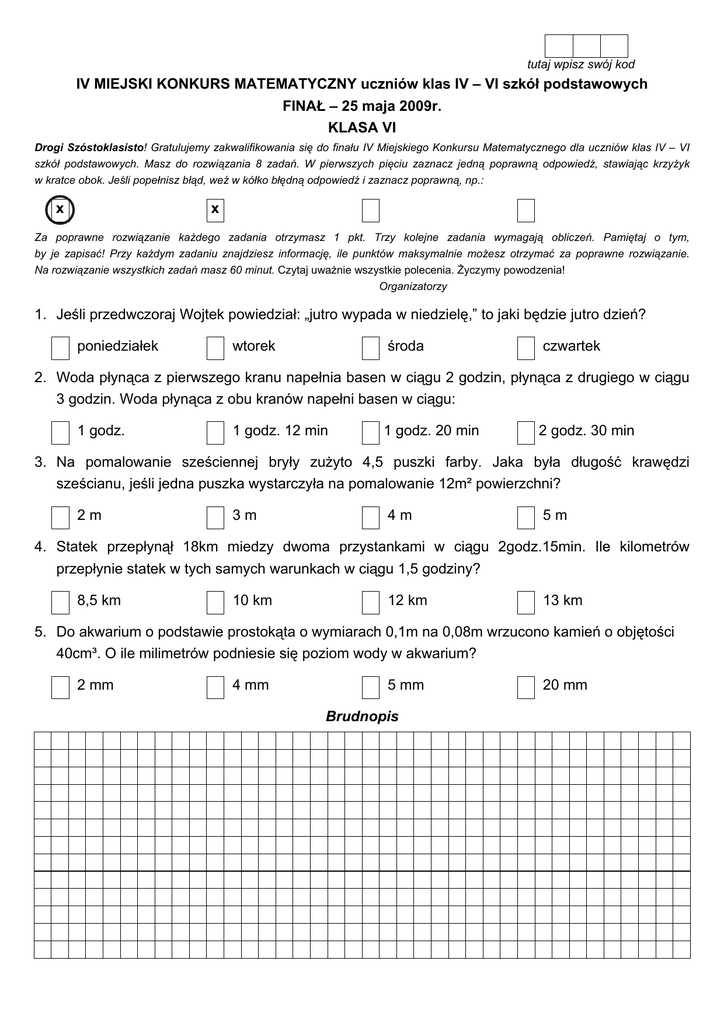 tutaj wpisz swój kod IV MIEJSKI KONKURS MATEMATYCZNY uczniów klas IV – VI szkół podstawowych FINAŁ – 25 maja 2009r. KLASA VI Drogi Szóstoklasisto! Gratulujemy zakwalifikowania się do finału IV Miejskiego Konkursu Matematycznego dla uczniów klas IV – VI szkół podstawowych. Masz do rozwiązania 8 zadań. W pierwszych pięciu zaznacz jedną poprawną odpowiedź, stawiając krzyżyk w kratce obok. Jeśli popełnisz błąd, weź w kółko błędną odpowiedź i zaznacz poprawną, np.: x x Za poprawne rozwiązanie każdego zadania otrzymasz 1 pkt. Trzy kolejne zadania wymagają obliczeń. Pamiętaj o tym, by je zapisać! Przy każdym zadaniu znajdziesz informację, ile punktów maksymalnie możesz otrzymać za poprawne rozwiązanie. Na rozwiązanie wszystkich zadań masz 60 minut. Czytaj uważnie wszystkie polecenia. Życzymy powodzenia! Organizatorzy 1. Jeśli przedwczoraj Wojtek powiedział: „jutro wypada w niedzielę,” to jaki będzie jutro dzień? poniedziałek wtorek środa czwartek 2. Woda płynąca z pierwszego kranu napełnia basen w ciągu 2 godzin, płynąca z drugiego w ciągu 3 godzin. Woda płynąca z obu kranów napełni basen w ciągu: 1 godz. 1 godz. 12 min 1 godz. 20 min 2 godz. 30 min 3. Na pomalowanie sześciennej bryły zużyto 4,5 puszki farby. Jaka była długość krawędzi sześcianu, jeśli jedna puszka wystarczyła na pomalowanie 12m² powierzchni? 2m 3m 4m 5m 4. Statek przepłynął 18km miedzy dwoma przystankami w ciągu 2godz.15min. Ile kilometrów przepłynie statek w tych samych warunkach w ciągu 1,5 godziny? 8,5 km 10 km 12 km 13 km 5. Do akwarium o podstawie prostokąta o wymiarach 0,1m na 0,08m wrzucono kamień o objętości 40cm³. O ile milimetrów podniesie się poziom wody w akwarium? 2 mm 4 mm 5 mm Brudnopis 20 mm 6. (6 pkt.) W kwadracie o polu 64cm² wybrano punkt i połączono go z wszystkimi wierzchołkami. Podzielono w ten sposób kwadrat na cztery trójkąty, z których jeden ma pole 12cm², a inny ma pole 24cm². Podaj odległości wybranego punktu od wszystkich boków kwadratu. Zapisz wszystkie obliczenia i odpowiedź. 7. (4 pkt.) Koń zjada dziennie 5kg owsa. Stadnina ma zapas owsa na 120 dni dla 8 koni. Na ile dni wystarczyłby ten zapas, gdyby dzienną porcję owsa dla jednego konia zwiększyć o 1kg? Zapisz wszystkie obliczenia i odpowiedź. 8. (5 pkt.) Królewnie Grymaśnicy rozerwał się naszyjnik z pereł. 0,5 pereł wpadło do jeziora, 1 pozostałych porwały sroki i tylko 48 pozostałych pereł zdołała zebrać służąca. Ile pereł było 5 w naszyjniku na początku? Zapisz wszystkie obliczenia i odpowiedź.