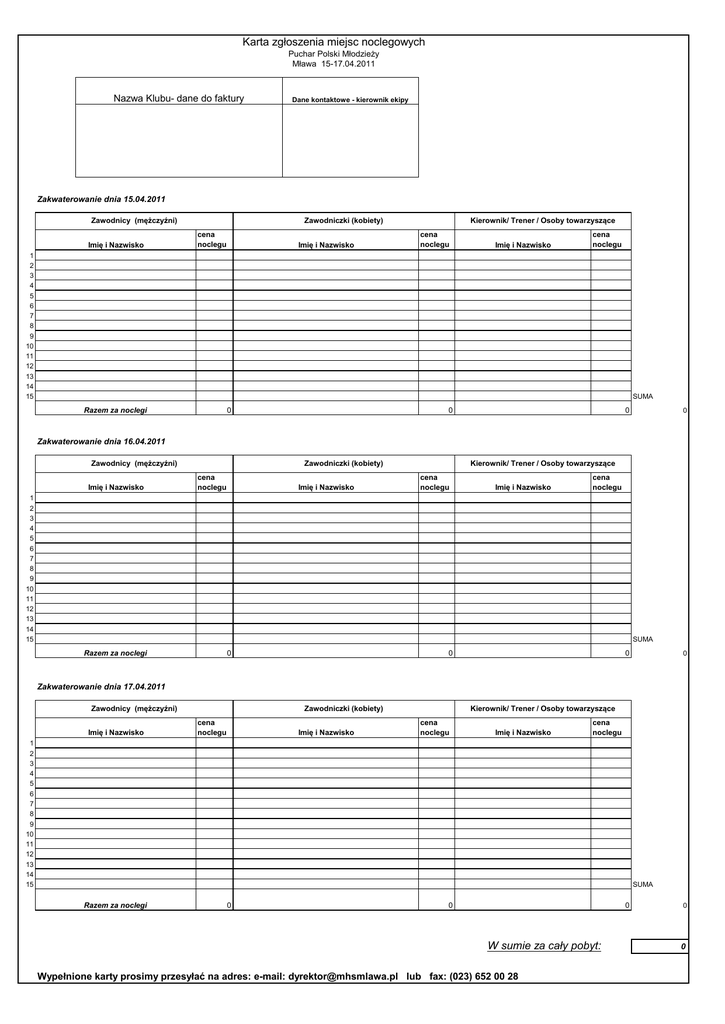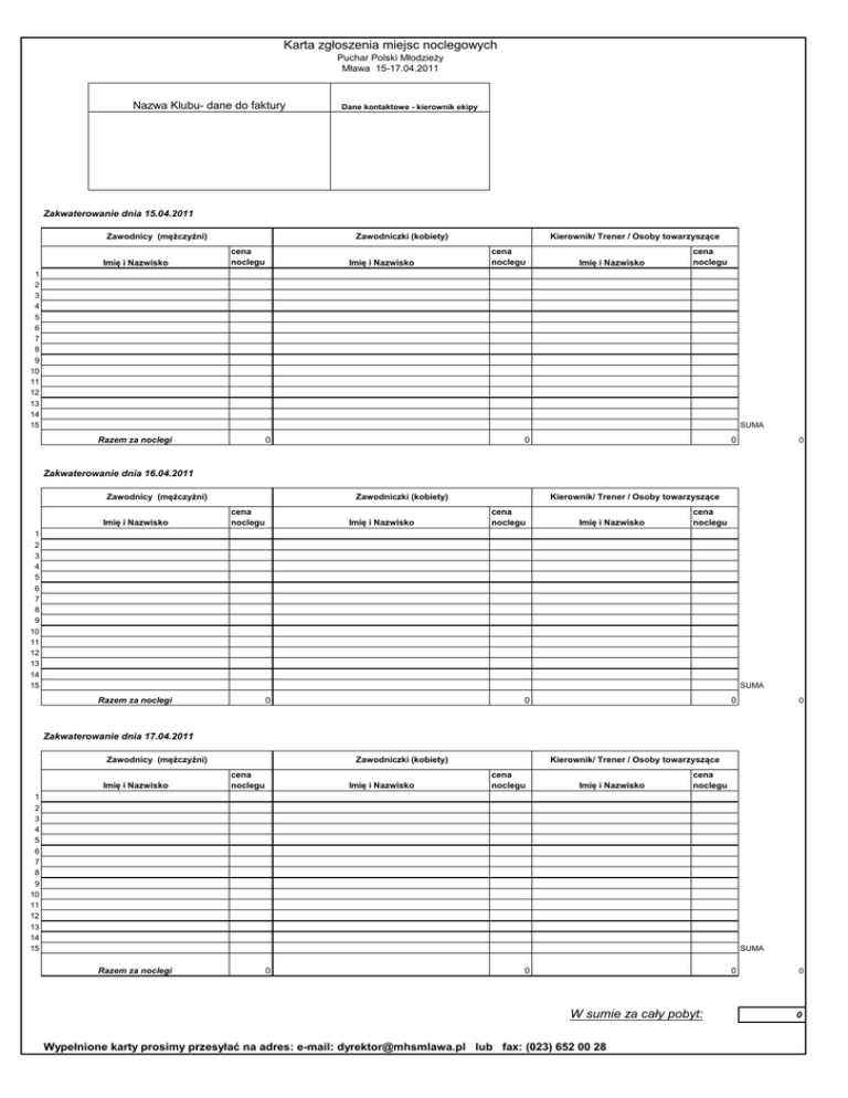 Karta zgłoszenia miejsc noclegowych Puchar Polski Młodzieży Mława 15-17.04.2011 Nazwa Klubu- dane do faktury Dane kontaktowe - kierownik ekipy Zakwaterowanie dnia 15.04.2011 Zawodnicy (mężczyźni) Imię i Nazwisko Kierownik/ Trener / Osoby towarzyszące Zawodniczki (kobiety) cena noclegu Imię i Nazwisko cena noclegu Imię i Nazwisko cena noclegu 1 2 3 4 5 6 7 8 9 10 11 12 13 14 15 SUMA Razem za noclegi 0 0 0 0 Zakwaterowanie dnia 16.04.2011 Zawodnicy (mężczyźni) Imię i Nazwisko Kierownik/ Trener / Osoby towarzyszące Zawodniczki (kobiety) cena noclegu Imię i Nazwisko cena noclegu Imię i Nazwisko cena noclegu 1 2 3 4 5 6 7 8 9 10 11 12 13 14 15 SUMA Razem za noclegi 0 0 0 0 Zakwaterowanie dnia 17.04.2011 Zawodnicy (mężczyźni) Imię i Nazwisko Kierownik/ Trener / Osoby towarzyszące Zawodniczki (kobiety) cena noclegu Imię i Nazwisko cena noclegu Imię i Nazwisko cena noclegu 1 2 3 4 5 6 7 8 9 10 11 12 13 14 15 SUMA Razem za noclegi 0 0 0 W sumie za cały pobyt: Wypełnione karty prosimy przesyłać na adres: e-mail: [email protected] lub fax: (023) 652 00 28 0 0