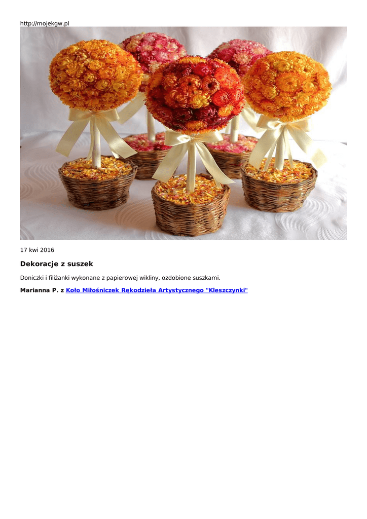 http://mojekgw.pl 17 kwi 2016 Dekoracje z suszek Doniczki i filiżanki wykonane z papierowej wikliny, ozdobione suszkami. Marianna P. z Koło Miłośniczek Rękodzieła Artystycznego "Kleszczynki"