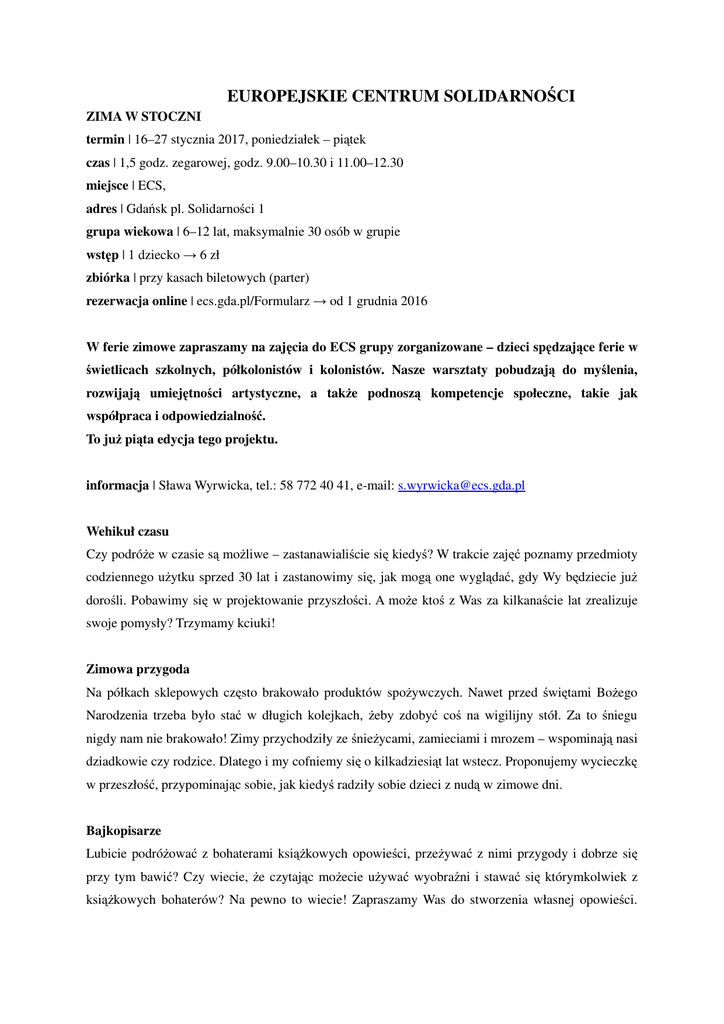 EUROPEJSKIE CENTRUM SOLIDARNOŚCI ZIMA W STOCZNI termin | 16–27 stycznia 2017, poniedziałek – piątek czas | 1,5 godz. zegarowej, godz. 9.00–10.30 i 11.00–12.30 miejsce | ECS, adres | Gdańsk pl. Solidarności 1 grupa wiekowa | 6–12 lat, maksymalnie 30 osób w grupie wstęp | 1 dziecko → 6 zł zbiórka | przy kasach biletowych (parter) rezerwacja online | ecs.gda.pl/Formularz → od 1 grudnia 2016 W ferie zimowe zapraszamy na zajęcia do ECS grupy zorganizowane – dzieci spędzające ferie w świetlicach szkolnych, półkolonistów i kolonistów. Nasze warsztaty pobudzają do myślenia, rozwijają umiejętności artystyczne, a także podnoszą kompetencje społeczne, takie jak współpraca i odpowiedzialność. To już piąta edycja tego projektu. informacja | Sława Wyrwicka, tel.: 58 772 40 41, e-mail: [email protected] Wehikuł czasu Czy podróże w czasie są możliwe – zastanawialiście się kiedyś? W trakcie zajęć poznamy przedmioty codziennego użytku sprzed 30 lat i zastanowimy się, jak mogą one wyglądać, gdy Wy będziecie już dorośli. Pobawimy się w projektowanie przyszłości. A może ktoś z Was za kilkanaście lat zrealizuje swoje pomysły? Trzymamy kciuki! Zimowa przygoda Na półkach sklepowych często brakowało produktów spożywczych. Nawet przed świętami Bożego Narodzenia trzeba było stać w długich kolejkach, żeby zdobyć coś na wigilijny stół. Za to śniegu nigdy nam nie brakowało! Zimy przychodziły ze śnieżycami, zamieciami i mrozem – wspominają nasi dziadkowie czy rodzice. Dlatego i my cofniemy się o kilkadziesiąt lat wstecz. Proponujemy wycieczkę w przeszłość, przypominając sobie, jak kiedyś radziły sobie dzieci z nudą w zimowe dni. Bajkopisarze Lubicie podróżować z bohaterami książkowych opowieści, przeżywać z nimi przygody i dobrze się przy tym bawić? Czy wiecie, że czytając możecie używać wyobraźni i stawać się którymkolwiek z książkowych bohaterów? Na pewno to wiecie! Zapraszamy Was do stworzenia własnej opowieści. Postaramy się napisać bajkę. Serdecznie zapraszamy wszystkich, których wyobraźnia podczas ferii nie odpoczywa.