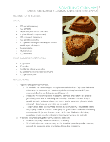 SOMETHING ORDINARY BABECZKI CZEKOLADOWE Z NADZIENIEM KARMELOWO-ORZECHOWYM SKŁADNIKI NA 12 BABECZEK: CIASTO 250 g mąki pszennej 100 g masła 1 łyżeczka proszku do pieczenia ½ łyżeczki sody oczyszczonej 100 czekolady deserowej 100 g drobnego cukru 200 g serka homogenizowanego o smaku waniliowym lub jogurtu 2 średnie jajka 1 łyżka kakao 100 ml mleka MASA KARMELOWO-ORZECHOWA 40 g masła 50 g cukru 1 szklanka mleka w proszku 80 g orzechów nerkowca (lub innych) 100 g mascarpone PRZYGOTOWANIE 1. Najpierw przygotowujemy masę. o W rondelku na średnim ogniu roztapiamy masło i cukier. Cały czas delikatnie mieszamy do momentu, aż masa osiągnie karmelowy kolor (w którymś momencie będzie się delikatnie pienić i puszyć). o Dodajemy wodę i energicznie mieszamy, aż masa znów stanie się gładka i jednolita (powstanie w trakcie łączenia wody z masłem i cukrem dużych grudek karmelu jest normalnym procesem, trzeba wówczas tylko cierpliwie mieszać – tak długo, aż wszystko się rozpuści). o Tak powstałą dość rzadką masę delikatnie przestudzamy i do jeszcze ciepłej wsypujemy mleko w proszku, miksujemy na gładki krem i na koniec dodajemy mascarpone. Ubijamy mikserem przez ok.5 minut. Na koniec dodajemy posiekane grubo orzechy, mieszamy i odstawiamy masę do lodówki. 2. W dalszej kolejności przygotowujemy ciasto na babeczki. o Masło roztapiamy razem z czekoladą i studzimy. o W oddzielnej misce umieszczamy suche składniki: przesianą mąkę pszenną, proszek do pieczenia, sodę oraz kakao. Dokładnie mieszamy. 1 SOMETHING ORDINARY BABECZKI CZEKOLADOWE Z NADZIENIEM KARMELOWO-ORZECHOWYM W drugiej misce ubijamy jajka z cukrem na puszystą masę. Dodajemy serek homogenizowany, masę maślano - czekoladową i mleko. Wszystko dokładnie, ale delikatnie mieszamy. o Mokre składniki dodajemy do suchych i bardzo delikatnie mieszamy całość drewnianą łyżką, tylko do połączenia składników. Piekarnik nagrzewamy do 190°C. Jeśli mamy metalową formę, wykładamy ją papilotkami (przy silikonowej formie możemy pominąć papilotki). Masę wykładamy mniej więcej do ½ wysokości foremek. Następnie układamy na każdej po kleksie masy karmelowo - orzechowej i na końcu 1 łyżkę ciasta, tak aby przykryło nadzienie (całość nie powinna przekraczać 2/3 wysokości foremki, ponieważ babeczki bardzo mocno rosną). Wstawiamy do piekarnika i pieczemy przez ok. 25 minut. o 3. 4. 5. 6. 7. 2
