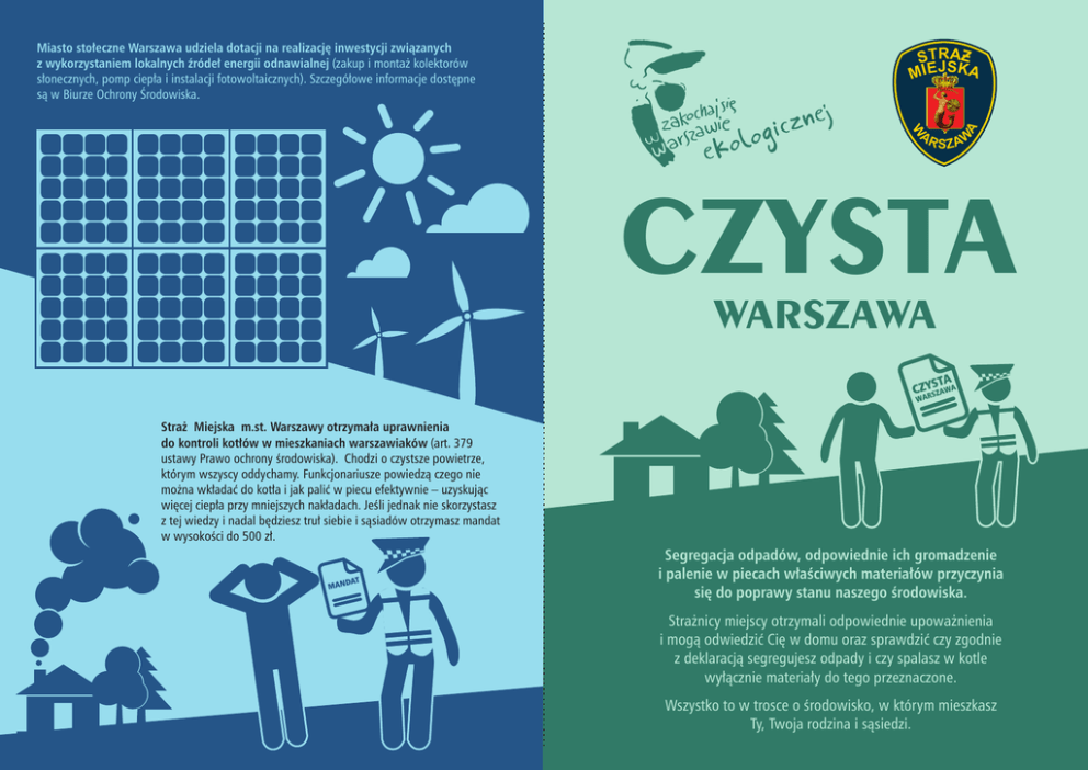 STRAZ MIEJSKA W AR A Miasto stołeczne Warszawa udziela dotacji na realizację inwestycji związanych z wykorzystaniem lokalnych źródeł energii odnawialnej (zakup i montaż kolektorów słonecznych, pomp ciepła i instalacji fotowoltaicznych). Szczegółowe informacje dostępne są w Biurze Ochrony Środowiska. S Z AW CZYSTA WARSZAWA Straż Miejska m.st. Warszawy otrzymała uprawnienia do kontroli kotłów w mieszkaniach warszawiaków (art. 379 ustawy Prawo ochrony środowiska). Chodzi o czystsze powietrze, którym wszyscy oddychamy. Funkcjonariusze powiedzą czego nie można wkładać do kotła i jak palić w piecu efektywnie – uzyskując więcej ciepła przy mniejszych nakładach. Jeśli jednak nie skorzystasz z tej wiedzy i nadal będziesz truł siebie i sąsiadów otrzymasz mandat w wysokości do 500 zł. Segregacja odpadów, odpowiednie ich gromadzenie i palenie w piecach właściwych materiałów przyczynia się do poprawy stanu naszego środowiska. Strażnicy miejscy otrzymali odpowiednie upoważnienia i mogą odwiedzić Cię w domu oraz sprawdzić czy zgodnie z deklaracją segregujesz odpady i czy spalasz w kotle wyłącznie materiały do tego przeznaczone. Wszystko to w trosce o środowisko, w którym mieszkasz Ty, Twoja rodzina i sąsiedzi. PODPISUJĄC DEKLARACJĘ O SEGREGACJI ODPADÓW ZOBOWIĄZAŁEŚ SIĘ, ŻE WRZUCASZ: Pamiętaj! Domowy piec nie jest przeznaczony do spalania odpadów! DO CZERWONEGO POJEMNIKA/WORKA: papier, np. gazety, katalogi, zeszyty, torby, worki, książki, kartony i tektura pokryte folią aluminiową, opakowania z papieru i tektury; opakowania drewniane, drobne wyroby, np. łyżki, zabawki, klocki, deski kuchenne; tworzywa sztuczne, np. zgniecione butelki po napojach, nakrętki z butelek, długopisy, linijki, opakowania po żywności (jogurtach, serkach, kerach), opakowania po środkach czystości, płyty CD, styropian; metal, np. puszki po napojach, konserwach, drobny złom żelazny i metali kolorowych, zabawki, nożyczki, kapsel, folia aluminiowa, garnki. DO ZIELONEGO POJEMNIKA/WORKA: szklane opakowania, np. butelki i słoiki po napojach, żywności i kosmetykach. DO CZARNEGO POJEMNIKA: wszystko to, czego nie możemy wrzucić do czerwonego i zielonego worka ani do kompostownika, czego nie musimy oddać do punktu selektywnej zbiórki, np. odpady kuchenne, porcelanę, talerze, guma, artykuły higieniczne (patyczki, wata, pieluchy, itp.), potłuczone szyby, szkło stołowe. NIE MOŻESZ WRZUCAĆ DO PIECA m.in.: PRZEDSIĘBIORCY RÓWNIEŻ MUSZĄ GROMADZIĆ ODPADY komunalne zgodnie ze stosownymi wymaganiami odpowiednimi do ich rodzaju. Pamiętaj! Musisz posiadać umowę na wywóz odpadów oraz rachunki za wywóz szamba! Brak udokumentowanego wywozu nieczystości będzie skutkował konsekwencjami nansowymi. To wszystko w trosce o Twoje życie i wspólne czyste środowisko. STRAŻ MIEJSKA MA PRAWO SPRAWDZIĆ CZY SEGREGUJESZ ODPADY zgodnie z deklaracją. Może odwiedzić Cię w godz. 6:00-22:00. Nie utrudniaj strażnikom ich pracy, bo grozi za to odpowiedzialność karna zgodnie z art. 225 Kodeksu karnego. Oni pracują w trosce o nasze środowisko. plastikowych pojemników i butelek po napojach, zużytych opon, przedmiotów z tworzyw sztucznych, elementów drewnianych pokrytych lakierem lub farbą, sztucznej skóry, opakowań po rozpuszczalnikach czy środkach ochrony roślin, opakowań po farbach i lakierach, foliowych toreb.