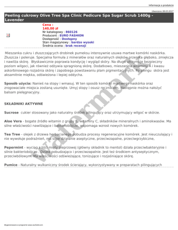 Informacje o produkcie Utworzono 08-03-2017 Peeling cukrowy Olive Tree Spa Clinic Pedicure Spa Sugar Scrub 1400g Lavender Cena : 140,00 zł Nr katalogowy : 860126 Producent : EURO FASHION Dostępność : Dostępny Stan magazynowy : bardzo wysoki Średnia ocena : brak recenzji er m ar k Mieszanka cukru i złuszczających drobinek pumeksu intensywnie usuwa martwe komórki naskórka. Złuszcza i poleruje. Specjalna formuła z minerałów oraz naturalnych olejków przenika głęboko, zmiękcza i nawilża skórę. Błyskawicznie poprawia kondycję i wygląd skóry. Na długo utrzymuje bezpieczny poziom wilgoci, jak również odżywia spragnioną skórę. Dodatkowo, mieszanina witaminy A i kwasu askorbinowego rozjaśnia skórę i zapobiega powstawaniu plam pigmentacyjnych. Po pilingu skóra jest aksamitnie miękka, odświeżona i lepiej oddycha. Sposób użycia: Nanieś na stopy i wmasuj. W ten sposób komórki martwego naskórka oraz zrogowaciałe miejsca zostaną usunięte. Umyj stopy i osusz ręcznikiem. Następnie można nałożyć balsam pielęgnacyjny. SKŁADNIKI AKTYWNE Sucrose cukier stosowany jako naturalny środek pilingujący oraz utrzymujący wilgoć w skórze. Aloe Vera - bogate źródło witamin z grupy B, witaminy C, składników mineralnych i aminokwasów. Ma silne właściwości nawilżające i bakteriobójcze, wspomaga wzrost nowych komórek. at Tea Tree - olejek z drzewa herbacianego pobudza procesy regeneracyjne komórek. Jest nieuczulający i nie wywołuje podrażnień, ma silne działanie aseptyczne, przeciwzapalne, przeciwgrzybiczne, w Pepermint - wyciąg z liści mięty pieprzowej (główny składnik to mentol) działa przeciwbakteryjnie i silnie bakteriobójczo . Działa pobudzająco i przeciwzapalnie. Jest też środkiem antyseptycznym, przeciwbólowym. Ma właściwości odświeżające, tonizujące i rozjaśniające skórę. Pumice - Naturalny wulkaniczny środek ścierający, wykorzystywany w preparatach pilingujących Wygenerowano w programie www.oscGold.com