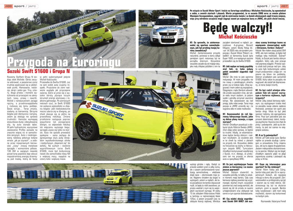 466 sport / jwrc sport / jwrc 467 Po wizycie w Suzuki Motor Sport i teście na Euroringu usiedliśmy z Michałem Kościuszko, by opowiedział o sobie, o swoich startach i planach. Warto przypomnieć, że w sezonie 2008 wraz ze swoim pilotem Maciejem Szczepaniakiem, wygrali rajd do mistrzostw świata i w dwóch eliminacjach zajęli trzecie miejsce, więc przy odrobinie szczęścia mogli sięgnąć nawet po najwyższe laury w JWRC, ale pech chciał inaczej. Będę walczył! Michał Kościuszko Przygoda na Euroringu KF: Co sprawiło, że zainteresowałeś się sportem samochodowym, jaki był przebieg twojej kariery zawodniczej? Michał: Zainteresowanie przyszło naturalnie, ponieważ w domu odkąd pamiętam sport motorowy był na porządku dziennym. Oczywiście wszystko zaczęło się od mojego taty; jako mały chłopiec jeździłem z nim na Suzuki Swift S1600 i Grupa N Ruszamy Swiftem Grupy N siedząc obok Michała. Obraz zaczyna wibrować, a pasażerowi coraz trudniej wpatrywać się w jakikolwiek punkt. Hamowanie, redukcja, skręt i pełen gaz. Trzy, cztery, długa prosta i moment wytchnienia od przeciążeń na zakrętach. Lewy, prawy i nawrót. Michał z namaszczeniem zaciąga ręczny, a przednionapędówka z rozkoszą się temu poddaje. Świat wiruje… Teraz zmiana, siadamy za kierownicę. Skrzynia biegów jest identyczna z seryjną, zatem jej obsługa nie sprawia trudności. Hamulce wymagają stosunkowo dużej i zdecydowanej siły, by auto stanęło dęba. W pełni hydrauliczne, wyczynowe zawieszenie Proflex pozwala na znacznie więcej niż w samochodzie seryjnym. Auto z nieskrępowaną radością pokonuje kolejne wiraże „jak po szynach”, a zadane przez niewprawnych kierowców „ciosy” znoszą metalowe sprzęgło i wzmocnione półosie. 130 KM w ważącym niewiele ponad tonę pojeździe daje odczuć nieposkromioną energię drzemiącą pod maską, którą de facto w pełni wykorzystywał jedynie Michał Kościuszko. Przesiadka do Swifta S1600. Już na sam widok auta czujemy respekt. Przytulone do ziemi nadwozie wygląda jak przyczajone zwierzę, które aż prosi się o wysokie obroty płynące niczym strumień energii atomowej z reaktora jądrowego. Po pierwszych metrach czuć, że Swift S1600 nie wybacza opieszałości w zbijaniu biegów: jeśli niedostatecznie mocno uderza się w dźwignię, po chwili okazuje się za późno na prawidłową redukcję. Zmiana przełożenia następuje poprzez popychanie lub pociągnięcie dźwigni, co odpowiada redukcji lub włączeniu wyższego biegu; sprzęgła używa się tylko na starcie. Auto nie sposób prowadzić spokojnie – samo zachęca do agresywnego stylu jazdy dźwiękiem wysokoobrotowego silnika i niesłychanym „klejeniem się” do asfaltu. Na suchym i świetnie wyprofilowanym torze Swift S1600, może być konkurencją nawet dla samochodów klasy N4 o większej mocy, napędzie na cztery koła i większej masie. zacząłem startować w rajdach, początkowo A-grupową Renault Megane, potem Skodą Felicją kit-car. W 2005 roku otrzymałem propozycję z Suzuki Motor Poland i zasiadłem za kierownicą Suzuki Ignis Super 1600, a w następnym sezonie przesiadłem się do Swifta S1600. KF: Jaki wpływ na twoją psychikę miał fakt, że (jako jedyny polski zawodnik) wygrałeś rajd WRC? Michał: Dla mnie to jest ogromna motywacja. W moim przypadku nie ma mowy o paraliżującym strachu przed, czy w trakcie rajdu. Chcę wygrywać i moim celem są zwycięstwa. Osiągnięcie z rajdu Sardynii udowodniło przede wszystkim mnie, ale także wielu innym osobom, że jestem szybki i potrafię utrzymać zawrotne tempo. Nie zastanawiam się nad presją, tylko robie swoje. Teraz moja pozycja w JWRC umocniła się i ta wygrana dała mi wiele możliwości. KF: Awansowałeś do roli kierowcy fabrycznego Suzuki, jakie są dalsze plany rozwoju, o czym marzysz? Michał: Chciałbym powalczyć o zdobycie tytułu Mistrza Świata JWRC, choć zdaję sobie sprawę, że będzie to trudne. Myślę, że wicemistrzostwo będzie bardzo dobrym i realnym rezultatem. Za wcześnie jest w te chwili by mówić o planach na przyszły rok. Oczywiście daleko na horyzoncie są starty w fabrycznym zespole WRC. Tymczasem chciałbym kontynuować współpracę z Suzuki, m.in. dlatego, że producent ten ma przecież w ofercie auto w specyfikacji WRC. wyścigi górskie i rajdy. Kiedyś co prawda wolałem grać w piłkę nożną, ale z czasem zainteresowanie rywalizacją samochodową – właściwie dzięki tacie – zdominowało moje życie. Najpierw chciałem się ścigać w wyścigach, potem w rajdach, ale tata początkowo nie bardzo dopuszczał myśli, że będę to robił zawodowo; po prostu wiedział z czym się to wiąże i jakich wyrzeczeń wymaga. W wieku 15 lat zdobyłem Mistrzostwo Polski w kartingu w najmocniejszej klasie 125cc, a potem przyszedł czas na zdobycie licencji rajdowej. Wkrótce KF: Co jest najsilniejszym Twoim atutem za kierownicą i co musisz jeszcze poprawić? Michał: Gdybym stwierdził, że wszystko potrafię, to byłby to ostatni moment mojej kariery. Cały czas kierowca rajdowy powinien się uczyć, rozwijać, słuchać innych; oczywiście powinien też znać swoją wartość, ale starać się iść do przodu ze swoimi umiejętnościami oraz zdobywać tak cenne w tym sporcie doświadczenie. KF: Czy miałeś okazję wypróbować Suzuki SX4 WRC? Jak oce- niasz szansę bratniego teamu na nawiązanie równorzędnej walki z Citroenem, Fordem i Subaru? Michał: Nie miałem okazji jeździć SX4 WRC, ale mam nadzieję, że będę miał niedługo taką możliwość. Szanse? Myślę, że Suzuki jest bardzo dobrym zespołem, który cały czas pracuje nad poprawą osiągów. Przecież spory sztab ludzi pracuje nad tym, żeby to auto było konkurencyjne wobec innych producentów i znając ich - na pewno się łatwo nie poddadzą. Dobrym przykładem jest samochód S1600, który także na początku nie wygrywał, ale został tak dopracowany, że teraz święci 