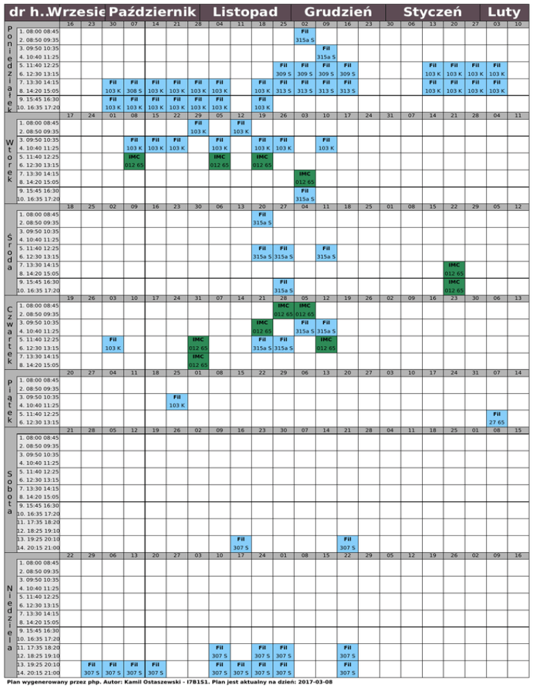 dr h... Wrzesień Październik P o n i e d z i a ł e k 16 23 30 07 14 21 04 11 18 Grudzień 25 02 Fil 2. 08:50 09:35 315a S 09 3. 09:50 10:35 Fil 4. 10:40 11:25 315a S 16 23 Styczeń 30 06 13 20 Luty 27 03 5. 11:40 12:25 Fil Fil Fil Fil Fil Fil Fil Fil 6. 12:30 13:15 309 S 309 S 309 S 309 S 103 K 103 K 103 K 103 K 10 7. 13:30 14:15 Fil Fil Fil Fil Fil Fil Fil Fil Fil Fil Fil Fil Fil Fil Fil 8. 14:20 15:05 103 K 308 S 103 K 103 K 103 K 103 K 103 K 313 S 313 S 313 S 313 S 103 K 103 K 103 K 103 K 26 03 10 17 24 31 07 14 21 28 04 11 18 25 01 08 15 22 29 05 12 9. 15:45 16:30 Fil Fil Fil Fil Fil Fil Fil 10. 16:35 17:20 103 K 103 K 103 K 103 K 103 K 103 K 103 K 01 08 15 22 29 05 17 24 Fil 2. 08:50 09:35 12 19 Fil 103 K 103 K 3. 09:50 10:35 Fil Fil Fil Fil Fil Fil Fil 4. 10:40 11:25 103 K 103 K 103 K 103 K 103 K 103 K 103 K 5. 11:40 12:25 IMC IMC IMC 6. 12:30 13:15 012 65 012 65 012 65 7. 13:30 14:15 IMC 8. 14:20 15:05 012 65 9. 15:45 16:30 Fil 10. 16:35 17:20 315a S 18 Ś r o d a Listopad 1. 08:00 08:45 1. 08:00 08:45 W t o r e k 28 25 02 09 16 23 30 06 13 20 1. 08:00 08:45 Fil 2. 08:50 09:35 315a S 27 04 11 3. 09:50 10:35 4. 10:40 11:25 5. 11:40 12:25 Fil 6. 12:30 13:15 Fil Fil 315a S 315a S 315a S 7. 13:30 14:15 IMC 8. 14:20 15:05 012 65 9. 15:45 16:30 Fil IMC 10. 16:35 17:20 315a S 012 65 19 C z w a r t e k 1. 08:00 08:45 P i ą t e k 1. 08:00 08:45 26 03 10 17 24 31 07 14 21 2. 08:50 09:35 28 05 IMC IMC 12 19 26 02 09 16 23 30 06 13 20 27 03 10 17 24 31 07 14 012 65 012 65 3. 09:50 10:35 IMC 4. 10:40 11:25 012 65 5. 11:40 12:25 Fil IMC 6. 12:30 13:15 103 K 012 65 7. 13:30 14:15 IMC 8. 14:20 15:05 012 65 20 27 04 11 18 25 01 Fil Fil Fil IMC 315a S 315a S 08 15 22 Fil 315a S 315a S 29 012 65 06 13 2. 08:50 09:35 3. 09:50 10:35 Fil 4. 10:40 11:25 103 K 5. 11:40 12:25 Fil 6. 12:30 13:15 27 65 21 28 05 12 19 26 02 09 16 23 30 07 14 21 28 04 11 18 25 01 08 15 29 05 12 19 26 02 09 16 1. 08:00 08:45 2. 08:50 09:35 3. 09:50 10:35 4. 10:40 11:25 S o b o t a 5. 11:40 12:25 6. 12:30 13:15 7. 13:30 14:15 8. 14:20 15:05 9. 15:45 16:30 10. 16:35 17:20 11. 17:35 18:20 12. 18:25 19:10 13. 19:25 20:10 Fil Fil 14. 20:15 21:00 307 S 307 S 22 29 06 13 20 27 03 10 17 24 01 08 15 22 1. 08:00 08:45 2. 08:50 09:35 3. 09:50 10:35 N i e d z i e l a 4. 10:40 11:25 5. 11:40 12:25 6. 12:30 13:15 7. 13:30 14:15 8. 14:20 15:05 9. 15:45 16:30 10. 16:35 17:20 11. 17:35 18:20 Fil Fil Fil Fil 12. 18:25 19:10 307 S 307 S 307 S 307 S 13. 19:25 20:10 Fil Fil Fil Fil Fil Fil Fil Fil Fil 14. 20:15 21:00 307 S 307 S 307 S 307 S 307 S 307 S 307 S 307 S 307 S Plan wygenerowany przez php. Autor: Kamil Ostaszewski - I7B1S1. Plan jest aktualny na dzień: 2017-03-08