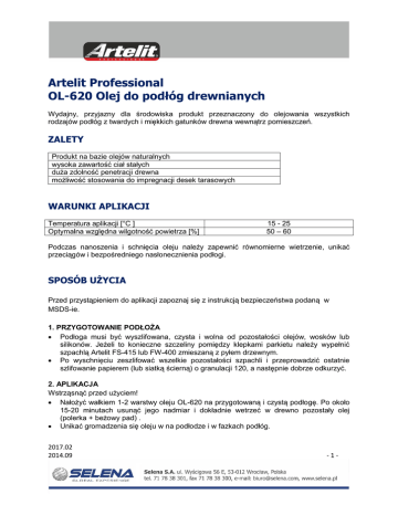 Artelit Professional OL-620 Olej do podłóg drewnianych Wydajny, przyjazny dla środowiska produkt przeznaczony do olejowania wszystkich rodzajów podłóg z twardych i miękkich gatunków drewna wewnątrz pomieszczeń. ZALETY Produkt na bazie olejów naturalnych wysoka zawartość ciał stałych duża zdolność penetracji drewna możliwość stosowania do impregnacji desek tarasowych WARUNKI APLIKACJI Temperatura aplikacji [°C ] Optymalna względna wilgotność powietrza [%] 15 - 25 50 – 60 Podczas nanoszenia i schnięcia oleju należy zapewnić równomierne wietrzenie, unikać przeciągów i bezpośredniego nasłonecznienia podłogi. SPOSÓB UŻYCIA Przed przystąpieniem do aplikacji zapoznaj się z instrukcją bezpieczeństwa podaną w MSDS-ie. 1. PRZYGOTOWANIE PODŁOŻA Podłoga musi być wyszlifowana, czysta i wolna od pozostałości olejów, wosków lub silikonów. Jeżeli to konieczne szczeliny pomiędzy klepkami parkietu należy wypełnić szpachlą Artelit FS-415 lub FW-400 zmieszaną z pyłem drzewnym. Po wyschnięciu zeszlifować wszelkie pozostałości szpachli i przeprowadzić ostatnie szlifowanie papierem (lub siatką ścierną) o granulacji 120, a następnie dobrze odkurzyć. 2. APLIKACJA Wstrząsnąć przed użyciem! Nałożyć wałkiem 1-2 warstwy oleju OL-620 na przygotowaną i czystą podłogę. Po około 15-20 minutach usunąć jego nadmiar i dokładnie wetrzeć w drewno pozostały olej (polerka + beżowy pad) . Unikać gromadzenia się oleju w na podłodze i w fazkach podłóg. 2017.02 2014.09 -1- W przypadku drewna o dużej absorbcji (np. buk, jesion) lub powierzchni o dużej chłonności (np. bruk drewniany) wskazane jest po około 1 godzinie ponowić aplikację w sposób opisany powyżej. Po około 4-6 godzinach od wtarcia oleju zaleca się delikatne polerowanie podłogi (biały pad) w celu usunięcia ewentualnych pozostałości oleju. 3. PRACE PO ZAKOŃCZENIU APLIKACJI Czyszczenie narzędzi: bezpośrednio po ubrudzeniu rozcieńczalnikiem OL-610. Do czyszczenia i konserwacji podłogi należy używać produktów Artelit OL-680 oraz OL690. 4. UWAGI / OGRANICZENIA Przy drewnie egzotycznym proces schnięcia może być znacznie wydłużony. Zaleca się przeprowadzenie próby aplikacji przez rozpoczęciem prac. Impregnację desek tarasowych należy przeprowadzać w temperaturze nie niższej niż +18°C. UWAGA : Olej OL-620 nie zawiera dodatkowych środków ochrony przeciw promieniowaniu UV, w związku z czym należy się liczyć z koniecznością ponawiania impregnacji po 2-4 sezonach letnich. Pady, szmaty, ubrania itp. poplamione olejem OL-620 muszą być przechowywane w zamkniętych pojemnikach albo muszą być całkowicie zamoczone. Istnieje możliwość samozapłonu. Produkt do użytku profesjonalnego. DANE TECHNICZNE Parametr Wydajność [ml/m2/1 warstwę] Czas schnięcia 1. warstwy [h] Ostrożna eksploatacja [dni] Wartość 70 - 100 3 >3 Pełna wytrzymałość [dni] Odporność na niskie temperatury Giscode >14 odporny Ö60 Czasy podane w niniejszej karcie technicznej dotyczą schnięcia w temperaturze +23°C i wilgotności względnej powietrza 50%. TRANSPORT / PRZECHOWYWANIE Produkt można przechowywać do 12 miesięcy w temperaturze +5 - +25°C od daty produkcji w oryginalnie zamkniętych opakowaniach, w suchym miejscu, zabezpieczając przed przegrzaniem. 2017.02 2014.09 -2- OSTRZEŻENIA I ZALECENIA BHP Szczegółowe informacje znajdują się w MSDS u producenta. Postępowanie z odpadami: Resztki produktu i puste opakowania muszą być utylizowane zgodnie z obowiązującymi, przepisami lokalnymi. Powyższe dane, zalecenia i wskazówki opierają się na naszej najlepszej wiedzy, badaniach oraz doświadczeniach i zostały udzielone w dobrej wierze, zgodnie z zasadami obowiązującymi w naszej firmie i u naszych dostawców. Zaproponowane sposoby postępowania uznane są za powszechne, jednak każdy z użytkowników tego materiału powinien upewnić się na wszelkie możliwe sposoby, włącznie ze sprawdzeniem produktu końcowego w odpowiednich warunkach, o przydatności dostarczanych materiałów dla osiągnięcia celów przez niego zamierzonych. Ani Spółka, ani jej upoważnieni przedstawiciele nie mogą ponosić odpowiedzialności za jakiekolwiek straty poniesione na skutek nieprawidłowego, bądź błędnego użycia jej materiałów. 2017.02 2014.09 -3-