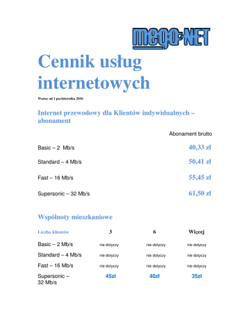 Cennik usług internetowych Ważny od 1 października 2010 Internet przewodowy dla Klientów indywidualnych – abonament Abonament brutto Basic – 2 Mb/s 40,33 zł Standard – 4 Mb/s 50,41 zł Fast – 16 Mb/s 55,45 zł Supersonic – 32 Mb/s 61,50 zł Wspólnoty mieszkaniowe Liczba klientów 3 6 Więcej Basic – 2 Mb/s nie dotyczy nie dotyczy nie dotyczy Standard – 4 Mb/s nie dotyczy nie dotyczy nie dotyczy Fast – 16 Mb/s nie dotyczy nie dotyczy nie dotyczy Supersonic – 32 Mb/s 45zł 40zł 35zł Internet przewodowy dla Firm – abonament Abonament brutto Basic – 2 Mb/s 65,53 zł Standard – 4 Mb/s 73,80 zł Fast – 16 Mb/s 75,62 zł Supersonic – 32 Mb/s 80,65 zł Usługi instalacyjne Instalacja drugiego łącza w tym samym lokalu 40 zł Publiczny adres IP 10 zł Instalacja w domu jednorodzinnym Instalacja/przeniesienie usługi do nowego miejsca zamieszkania Abonenta Mega-Net Wg kosztorysu Bezpłatnie Aktywacja (opłata za ponowne uruchomienie usługi) 100 zł Wizyta technika Ponowne podłączenie z wizytą technika 50 zł Instalacja dodatkowego gniazdka z wizytą technika 50 zł Nieuzasadnione wezwanie technika 50 zł Usługi dodatkowe Przeniesienie praw i obowiązków wynikających z Umowy Abonenckiej 39 zł Zawieszenie świadczenia usługi 29 zł Wystawienie duplikatu faktury lub 5 zł rachunku 105 zł Sprzedaż i instalacja routera WiFi Internet bezprzewodowy dla Klientów indywidualnych – abonament Abonament brutto Basic – 2 Mb/s 45 zł Standard – 4 Mb/s 50 zł Fast – 8 Mb/s 55 zł Supersonic – 16 Mb/s 70 zł Internet bezprzewodowy dla Firm – abonament Abonament brutto Basic – 2 Mb/s 60 zł Standard – 4 Mb/s 65 zł Fast – 8 Mb/s 70 zł Supersonic – 16 Mb/s 85 zł Instalacja Internetu bezprzewodowego Okres BRAK 12 m-cy 24 m-ce Cena 300 zł 250 zł 200 zł Opłata zwiera podatek VAT, jeśli na mocy obowiązujących przepisów usługa podlega podatkowi od towarów i usług. Grupa Mega-Net www.meganet.opole.pl [email protected] +48 697 901 114 +48 509 145 323 Mega-Net Dominik Drożdż | ul. Kośnego 23/1 | 45-056 Opole, wpisana do rejestru przedsiębiorców prowadzonego przez Prezydenta Miasta Opola w Wydziale Gospodarki i Promocji Miasta pod numerem 40050, o numerze NIP 754-258-60-17 oraz numerze REGON 532391425