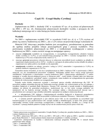 Alicja Młynarska-Wichtowska Informacja nr 930 (IP-100 G) Część 51 - Urząd Służby Cywilnej1 Dochody Zaplanowane na 2003 r. dochody USC w wysokości 87 tys. zł są niższe od planowanych na 2002 r. (95 tys. zł). Zmniejszenie planowanych dochodów wynika z przyjęcia do ich kalkulacji mniejszego niż w roku bieżącym limitu mianowań2. Wydatki Na 2003 r. zaplanowano wydatki USC w wysokości 9.443 tys. zł, tj. o 7,2% wyższe od planu wg ustawy budżetowej na 2002 r., ale o 3,2% niższe od przewidywanego wykonania br. Materiał USC dotyczący projektu budżetu jest szczegółowy, przedstawione są potrzebne do ogólnej analizy projektu relacje poszczególnych grup i pozycji wydatków. Przy porównaniu wydatków planowanych na 2003 r. z wielkościami wynikającymi z ustawy budżetowej na 2002 r. warto zwrócić uwagę na następujące sprawy: • znaczne zwiększenie wydatków na wynagrodzenia, w szczególności wynagrodzenia członków korpusu służby cywilnej (o 12,5%), co jest konsekwencją przyjętego na 2003 r. wzrostu wynagrodzeń w sferze budżetowej (o 4%) oraz zwiększenia liczby etatów (o 7). • znaczący przyrost procentowy (chociaż dotyczy to relatywnie niewielkich kwot) wydatków na składki do organizacji międzynarodowych (o 163%) - wynika to z przyjęcia do planu pełnej rocznej składki do jednej z organizacji oraz spłaty połowy tej składki za rok poprzedni. zmniejszenie wydatków na zakupy: towarów i usług (o 3,4%)3, materiałów i wyposażenia (o 11,8%), na podróże służbowe zagraniczne (o 16,7%). Generalnie można stwierdzić, że nie ma w projektowanym na 2003 r. budżecie USC w porównaniu z 2002 r. rażących, czy nie uzasadnionych przyrostów wydatków. Należałoby jednak nieco więcej uwagi poświęcić zatrudnieniu. Zwiększenie w porównaniu z ustawą budżetową 2002 r. planowanego zatrudnienia o 7 etatów następuje w wyniku decyzji podjętych jeszcze w bieżącym roku4 - warto byłoby wyjaśnić jakie jest faktyczne zatrudnienie, czy dodatkowy „przydział” etatów i związanych z nimi środków na wynagrodzenia nie sprowadza się jedynie do wykorzystania środków na wynagrodzenia. Ponadto warto byłoby ostatecznie wyjaśnić i rozwiązać sprawę ośrodka szkoleniowego dla USC. W przeszłości podjęto racjonalną decyzję nie budowania nowego ośrodka, ale wykorzystania na ten cel jednego z ośrodków będących w zasobach Rady Ministrów. Niestety USC otrzymał w zarząd ośrodek w Białobrzegach nadający się jedynie do generalnej przebudowy, modernizacji itp., co być może wymaga nakładów nie mniejszych niż na budowę nowego ośrodka. Nie oceniając żadnej z dotychczasowych decyzji (ani o przydzieleniu ani o przejęciu tego ośrodka) należałoby zaproponować podjęcie ostatecznej decyzji: • • o udostępnianiu USC jednego z funkcjonujących ośrodków będących w dyspozycji gospodarstwa pomocniczego Kancelarii Prezesa RM (na przykład w położonym niedaleko Warszawy - Jadwisinie) i/lub • o uznaniu potrzeb zgłaszanych w tym zakresie przez USC za nie uzasadnione ze wszystkimi tego konsekwencjami (w tym: pozbawieniem USC zarządu ośrodka w Białobrzegach, za które USC ponosi opłaty, zaprzestałby również Urząd corocznego występowania o środki na adaptację ośrodka, co z uwagi na ich wysokość5 i sytuację budżetu państwa wydaje się być nie do zrealizowania jeszcze przez wiele lat). 1 Opinię opracowano na podstawie materiałów Urzędu Służby Cywilnej dot. projektu budżetu na 2003 r., 2002 r. i ustawy budżetowej na 2002 r. 2 Na 2002 r. planowano 500 osób x 190 zł a na 2003 r. 450 osób x 190 zł. (plan na 2003 r. zgodnie z przyjętym przez Radę Ministrów 3 - letnim planem limitu mianowań urzędników w służbie cywilnej). 3 Częściowo zmniejszenie to wynika z zakończenia realizacji programu PHARE 99, w ramach której realizowano takie zakupy. 4 Zob. s. 2 materiału USC. 5 Zob. s. 5 materiału USC. W budżecie państwa zaplanowano rezerwę (poz. 41) na szkolenia i wynagrodzenia związane z funkcjonowaniem służby cywilnej w 2003 r. w wysokości 5.380 tys. zł.6 W rezerwie tej zaplanowano środki w wysokości 4.879 tys. zł na dodatki służby cywilnej dla urzędników nowo mianowanych w 2003 r. i w 2002 r. oraz urzędników powracających z urlopów bezpłatnych itp., a także 501 tys. zł na szkolenia centralne organizowane przez USC. Przedstawione w materiale USC szczegóły dotyczące kalkulacji wydatków do sfinansowania z powyższej rezerwy nie budzą zastrzeżeń. Uwagi końcowe Przedstawiony przez USC materiał dość syntetycznie ale wystarczająco prezentuje projekt budżetu na 2003 r. Niemniej jednak wyjaśnienia wymaga poziom faktycznego zatrudnienia i jego planowane zwiększenie. Ponadto należy uznać za ważne podjęcie stosownego rozwiązania (odpowiedniej decyzji) dotyczącego ośrodka szkoleniowego dla Służby Cywilnej. 6 W rezerwie na 2002 r. zaplanowano kwotę 1.740 tys. zł.