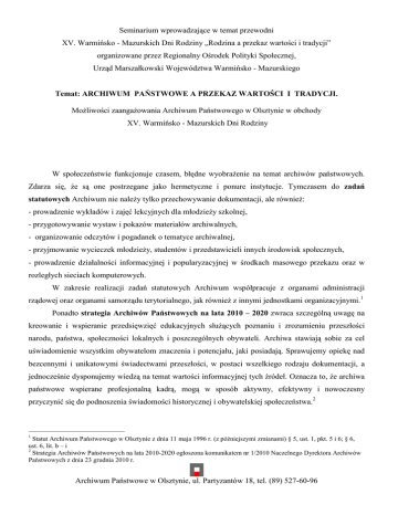 Seminarium wprowadzające w temat przewodni XV. Warmińsko - Mazurskich Dni Rodziny „Rodzina a przekaz wartości i tradycji” organizowane przez Regionalny Ośrodek Polityki Społecznej, Urząd Marszałkowski Województwa Warmińsko - Mazurskiego Temat: ARCHIWUM PAŃSTWOWE A PRZEKAZ WARTOŚCI I TRADYCJI. Możliwości zaangażowania Archiwum Państwowego w Olsztynie w obchody XV. Warmińsko - Mazurskich Dni Rodziny W społeczeństwie funkcjonuje czasem, błędne wyobrażenie na temat archiwów państwowych. Zdarza się, że są one postrzegane jako hermetyczne i ponure instytucje. Tymczasem do zadań statutowych Archiwum nie należy tylko przechowywanie dokumentacji, ale również: - prowadzenie wykładów i zajęć lekcyjnych dla młodzieży szkolnej, - przygotowywanie wystaw i pokazów materiałów archiwalnych, - organizowanie odczytów i pogadanek o tematyce archiwalnej, - przyjmowanie wycieczek młodzieży, studentów i przedstawicieli innych środowisk społecznych, - prowadzenie działalności informacyjnej i popularyzacyjnej w środkach masowego przekazu oraz w rozległych sieciach komputerowych. W zakresie realizacji zadań statutowych Archiwum współpracuje z organami administracji rządowej oraz organami samorządu terytorialnego, jak również z innymi jednostkami organizacyjnymi.1 Ponadto strategia Archiwów Państwowych na lata 2010 – 2020 zwraca szczególną uwagę na kreowanie i wspieranie przedsięwzięć edukacyjnych służących poznaniu i zrozumieniu przeszłości narodu, państwa, społeczności lokalnych i poszczególnych obywateli. Archiwa stawiają sobie za cel uświadomienie wszystkim obywatelom znaczenia i potencjału, jaki posiadają. Sprawujemy opiekę nad bezcennymi i unikatowymi świadectwami przeszłości, w postaci wszelkiego rodzaju dokumentacji, a jednocześnie dysponujemy wiedzą na temat wartości informacyjnej tych źródeł. Oznacza to, że archiwa państwowe wspierane profesjonalną kadrą, mogą w sposób aktywny, efektywny i nowoczesny przyczynić się do podnoszenia świadomości historycznej i obywatelskiej społeczeństwa. 2 1 Statut Archiwum Państwowego w Olsztynie z dnia 11 maja 1996 r. (z późniejszymi zmianami) § 5, ust. 1, pkt. 5 i 6; § 6, ust. 6, lit. b – i 2 Strategia Archiwów Państwowych na lata 2010-2020 ogłoszona komunikatem nr 1/2010 Naczelnego Dyrektora Archiwów Państwowych z dnia 23 grudnia 2010 r. Archiwum Państwowe w Olsztynie, ul. Partyzantów 18, tel. (89) 527-60-96 W oparciu o powyższe APO może z pożytkiem dla inicjatywy włączyć się w wyżej przedstawione przedsięwzięcie, zwłaszcza w kontekście tradycji i wartości jakie przekazuje Rodzina. To jednocześnie okazja dla naszej instytucji do budowania wizerunku archiwów państwowych jako nowoczesnych i przyjaznych urzędów, aktywnie uczestniczących w procesie edukacji społeczeństwa. Archiwum może zatem zaangażować się (w ramach XV Warmińsko – Mazurskich Dni Rodziny) w tematy związane z przekazem historii, kultury i tradycji w rodzinie, a zwłaszcza w zajęcia z zakresu genealogii. Możemy zaproponować prowadzenie warsztatów (dla dzieci i dorosłych) dotyczących nauki tworzenie drzew genealogicznych i badań genealogicznych w ogóle. Nasze doświadczenie w tym zakresie wskazuje, że lekcje takie, prowadzone z wykorzystaniem nowoczesnego sprzętu multimedialnego oraz źródeł historycznych, są ciekawą formą zdobywania wiedzy i umiejętności. Zajęcia mogą odbywać się w sali konferencyjnej Archiwum, ale również w szkołach i innych instytucjach. Warto dodać, że ujęcie problemu badań genealogicznych w programie Dni Rodziny jest bardzo trafną decyzją, ponieważ wiedza na temat historii swoich przodków ma kluczowe znaczenie dla trwałości tej podstawowej komórki społecznej. Warto w tym miejscu przypomnieć, że zdobywanie informacji o swojej rodzinie sprawia, że pogłębia się nasza tożsamość. Psycholodzy zajmujący się różnymi aspektami funkcjonowania rodziny twierdzą, że „efekt wspominania przodków działa, przypominając nam, że nawet z pozoru nierozwiązywalne problemy można jakoś przezwyciężyć. Nasi przodkowie radzili sobie z wieloma problemami, takimi jak poważne choroby, wojny, utrata ukochanych osób (...), więc kiedy o nich myślimy, przypomina nam się, że osoby podobne do nas genetycznie wygrały z przeciwnościami losu. Pamięć trudnych chwil naszych dziadków (czy nawet jeszcze wcześniejszych nieznanych bliżej pokoleń) bezpośrednio wpływa na zdolność mózgu do poradzenia sobie z zadaniami poznawczymi. Troska o przekazywanie wiedzy na temat historii własnej Rodziny, jest szczególnie istotna w przypadku dzieci. Jeśli uda nam się zaszczepić w dziecku świadomość posiadania własnych korzeni (chwalebnych ale i wstydliwych chwil), wypuścimy w świat (nie zawsze różowy) człowieka mocnego, pewnego siebie, bo mającego na kogo liczyć. 3 Narzędziem do budowania takiej pewności może być wykonanie drzewa genealogicznego. Wydaje się, że Archiwum (w ramach swych kompetencji) w sposób kompleksowy może pomóc w realizacji tych fundamentalnych dla funkcjonowania Rodziny zadań. Oprócz wyżej przedstawionej, naszej zasadniczej inicjatywy, możemy zaproponować inne dodatkowe projekty. Ciekawą formą są wycieczki po Archiwum i nauka korzystania z jego zasobu, także do badań genealogicznych. Możemy również zorganizować konkurs na najlepsze drzewo 3 Wiktoria Gomolla, Historia mojej rodziny – drzewo genealogiczne, [w:] Oświatowy Miejski Serwis Informacyjny Gliwice, 2/2011. Zob.: http://www.um.gliwice.pl/bip/pub/pliki/mMSI2_2011.pdf Archiwum Państwowe w Olsztynie, ul. Partyzantów 18, tel. (89) 527-60-96 genealogiczne adresowany dla dzieci i młodzieży. Istnieje możliwość przygotowania wystawy prezentującej zasób Archiwum dotyczący genealogii. Ukierunkowanie tegorocznych Dni Rodziny na przekaz wartości i tradycji sprawia, że Archiwum Państwowe może znacząco 
