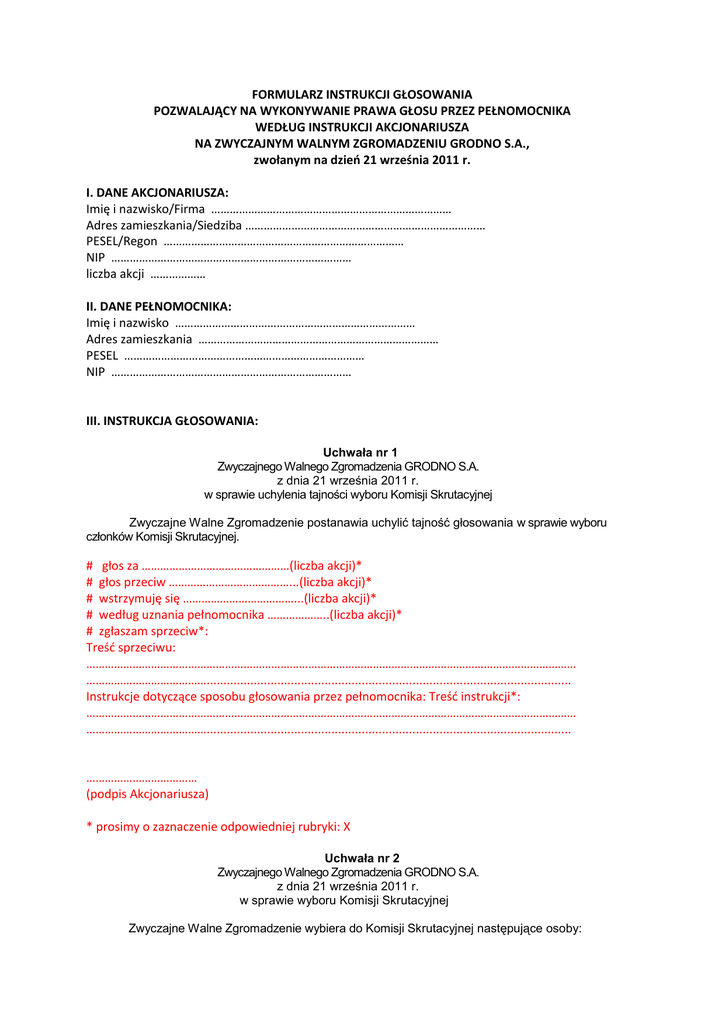 FORMULARZ INSTRUKCJI GŁOSOWANIA POZWALAJĄCY NA WYKONYWANIE PRAWA GŁOSU PRZEZ PEŁNOMOCNIKA WEDŁUG INSTRUKCJI AKCJONARIUSZA NA ZWYCZAJNYM WALNYM ZGROMADZENIU GRODNO S.A., zwołanym na dzieo 21 września 2011 r. I. DANE AKCJONARIUSZA: Imię i nazwisko/Firma …………………………………………………………………… Adres zamieszkania/Siedziba …………………………………………………………………… PESEL/Regon …………………………………………………………………… NIP …………………………………………………………………… liczba akcji ……………… II. DANE PEŁNOMOCNIKA: Imię i nazwisko …………………………………………………………………… Adres zamieszkania …………………………………………………………………… PESEL …………………………………………………………………… NIP …………………………………………………………………… III. INSTRUKCJA GŁOSOWANIA: Uchwała nr 1 Zwyczajnego Walnego Zgromadzenia GRODNO S.A. z dnia 21 września 2011 r. w sprawie uchylenia tajności wyboru Komisji Skrutacyjnej Zwyczajne Walne Zgromadzenie postanawia uchylić tajność głosowania w sprawie wyboru członków Komisji Skrutacyjnej. # głos za …………………………………………(liczba akcji)* # głos przeciw …………………………………...(liczba akcji)* # wstrzymuję się ………………………………...(liczba akcji)* # według uznania pełnomocnika ………………..(liczba akcji)* # zgłaszam sprzeciw*: Treśd sprzeciwu: …………………………………………………………………………………………………………………………………………… …………………………………............................................................................................................ Instrukcje dotyczące sposobu głosowania przez pełnomocnika: Treśd instrukcji*: …………………………………………………………………………………………………………………………………………… …………………………………............................................................................................................ ……………………………… (podpis Akcjonariusza) * prosimy o zaznaczenie odpowiedniej rubryki: X Uchwała nr 2 Zwyczajnego Walnego Zgromadzenia GRODNO S.A. z dnia 21 września 2011 r. w sprawie wyboru Komisji Skrutacyjnej Zwyczajne Walne Zgromadzenie wybiera do Komisji Skrutacyjnej następujące osoby: ________________________. # głos za …………………………………………(liczba akcji)* # głos przeciw …………………………………...(liczba akcji)* # wstrzymuję się ………………………………...(liczba akcji)* # według uznania pełnomocnika ………………..(liczba akcji)* # zgłaszam sprzeciw*: Treśd sprzeciwu: …………………………………………………………………………………………………………………………………………… …………………………………............................................................................................................ Instrukcje dotyczące sposobu głosowania przez pełnomocnika: Treśd instrukcji*: …………………………………………………………………………………………………………………………………………… …………………………………............................................................................................................ ……………………………… (podpis Akcjonariusza) * prosimy o zaznaczenie odpowiedniej rubryki: X Uchwała nr 3 Zwyczajnego Walnego Zgromadzenia GRODNO S.A. z dnia 21 września 2011 r. w sprawie wyboru przewodniczącego Zgromadzenia Zwyczajne Walne Zgromadzenie wybiera na przewodniczącego Zgromadzenia _______________________. # głos za …………………………………………(liczba akcji)* # głos przeciw …………………………………...(liczba akcji)* # wstrzymuję się ………………………………...(liczba akcji)* # według uznania pełnomocnika ………………..(liczba akcji)* # zgłaszam sprzeciw*: Treśd sprzeciwu: …………………………………………………………………………………………………………………………………………… …………………………………............................................................................................................ Instrukcje dotyczące sposobu głosowania przez pełnomocnika: Treśd instrukcji*: …………………………………………………………………………………………………………………………………………… …………………………………............................................................................................................ ……………………………… (podpis Akcjonariusza) * prosimy o zaznaczenie odpowiedniej rubryki: X Uchwała nr 4 Zwyczajnego Walnego Zgromadzenia GRODNO S.A. z dnia 21 września 2011 r. sprawie przyjęcia porządku obrad Zwyczajne Walne Zgromadzenie przyjmuje następujący porządek obrad: 1. 2. 3. 4. Otwarcie obrad Walnego Zgromadzenia. Podjęcie uchwały w sprawie uchylenia tajności wyboru Komisji Skrutacyjnej. Wybór Komisji Skrutacyjnej i przewodniczącego Walnego Zgromadzenia. Stwierdzenie prawidłowości zwołania Walnego Zgromadzenia i jego zdolności do podejmowania uchwał. 5. Przyjęcie porządku obrad. 6. Przedstawienie i rozpatrzenie sprawozdania Zarządu z działalności Spółki oraz sprawozdania finansowego za rok obrotowy od 1 kwietnia 2010 r. do 31 marca 2011 r.. 7. Przedstawienie i rozpatrzenie sprawozdania z działalności Rady Nadzorczej w roku obrotow
