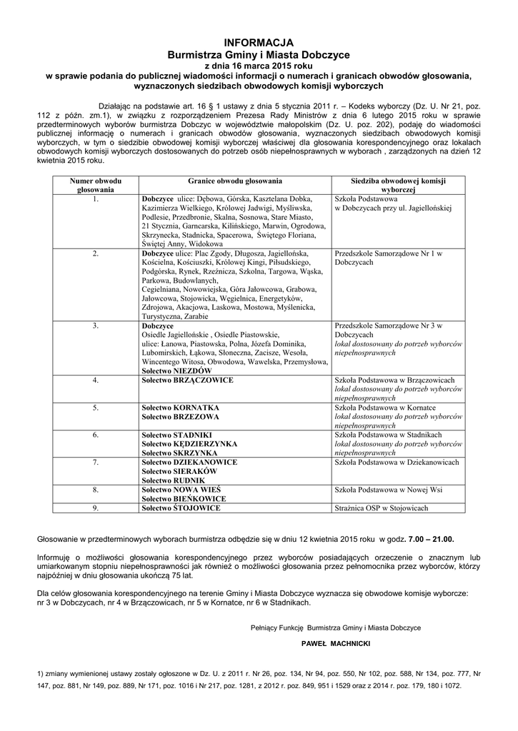 INFORMACJA Burmistrza Gminy i Miasta Dobczyce z dnia 16 marca 2015 roku w sprawie podania do publicznej wiadomości informacji o numerach i granicach obwodów głosowania, wyznaczonych siedzibach obwodowych komisji wyborczych Działając na podstawie art. 16 § 1 ustawy z dnia 5 stycznia 2011 r. – Kodeks wyborczy (Dz. U. Nr 21, poz. 112 z późn. zm.1), w związku z rozporządzeniem Prezesa Rady Ministrów z dnia 6 lutego 2015 roku w sprawie przedterminowych wyborów burmistrza Dobczyc w województwie małopolskim (Dz. U. poz. 202), podaję do wiadomości publicznej informację o numerach i granicach obwodów głosowania, wyznaczonych siedzibach obwodowych komisji wyborczych, w tym o siedzibie obwodowej komisji wyborczej właściwej dla głosowania korespondencyjnego oraz lokalach obwodowych komisji wyborczych dostosowanych do potrzeb osób niepełnosprawnych w wyborach , zarządzonych na dzień 12 kwietnia 2015 roku. Numer obwodu głosowania 1. 2. 3. 4. Granice obwodu głosowania Dobczyce ulice: Dębowa, Górska, Kasztelana Dobka, Kazimierza Wielkiego, Królowej Jadwigi, Myśliwska, Podlesie, Przedbronie, Skalna, Sosnowa, Stare Miasto, 21 Stycznia, Garncarska, Kilińskiego, Marwin, Ogrodowa, Skrzynecka, Stadnicka, Spacerowa, Świętego Floriana, Świętej Anny, Widokowa Dobczyce ulice: Plac Zgody, Długosza, Jagiellońska, Kościelna, Kościuszki, Królowej Kingi, Piłsudskiego, Podgórska, Rynek, Rzeźnicza, Szkolna, Targowa, Wąska, Parkowa, Budowlanych, Cegielniana, Nowowiejska, Góra Jałowcowa, Grabowa, Jałowcowa, Stojowicka, Węgielnica, Energetyków, Zdrojowa, Akacjowa, Laskowa, Mostowa, Myślenicka, Turystyczna, Zarabie Dobczyce Osiedle Jagiellońskie , Osiedle Piastowskie, ulice: Łanowa, Piastowska, Polna, Józefa Dominika, Lubomirskich, Łąkowa, Słoneczna, Zacisze, Wesoła, Wincentego Witosa, Obwodowa, Wawelska, Przemysłowa, Sołectwo NIEZDÓW Sołectwo BRZĄCZOWICE 5. Sołectwo KORNATKA Sołectwo BRZEZOWA 6. Sołectwo STADNIKI Sołectwo KĘDZIERZYNKA Sołectwo SKRZYNKA Sołectwo DZIEKANOWICE Sołectwo SIERAKÓW Sołectwo RUDNIK Sołectwo NOWA WIEŚ Sołectwo BIEŃKOWICE Sołectwo ŚTOJOWICE 7. 8. 9. Siedziba obwodowej komisji wyborczej Szkoła Podstawowa w Dobczycach przy ul. Jagiellońskiej Przedszkole Samorządowe Nr 1 w Dobczycach Przedszkole Samorządowe Nr 3 w Dobczycach lokal dostosowany do potrzeb wyborców niepełnosprawnych Szkoła Podstawowa w Brzączowicach lokal dostosowany do potrzeb wyborców niepełnosprawnych Szkoła Podstawowa w Kornatce lokal dostosowany do potrzeb wyborców niepełnosprawnych Szkoła Podstawowa w Stadnikach lokal dostosowany do potrzeb wyborców niepełnosprawnych Szkoła Podstawowa w Dziekanowicach Szkoła Podstawowa w Nowej Wsi Strażnica OSP w Stojowicach Głosowanie w przedterminowych wyborach burmistrza odbędzie się w dniu 12 kwietnia 2015 roku w godz. 7.00 – 21.00. Informuję o możliwości głosowania korespondencyjnego przez wyborców posiadających orzeczenie o znacznym lub umiarkowanym stopniu niepełnosprawności jak również o możliwości głosowania przez pełnomocnika przez wyborców, którzy najpóźniej w dniu głosowania ukończą 75 lat. Dla celów głosowania korespondencyjnego na terenie Gminy i Miasta Dobczyce wyznacza się obwodowe komisje wyborcze: nr 3 w Dobczycach, nr 4 w Brzączowicach, nr 5 w Kornatce, nr 6 w Stadnikach. Pełniący Funkcję Burmistrza Gminy i Miasta Dobczyce PAWEŁ MACHNICKI 1) zmiany wymienionej ustawy zostały ogłoszone w Dz. U. z 2011 r. Nr 26, poz. 134, Nr 94, poz. 550, Nr 102, poz. 588, Nr 134, poz. 777, Nr 147, poz. 881, Nr 149, poz. 889, Nr 171, poz. 1016 i Nr 217, poz. 1281, z 2012 r. poz. 849, 951 i 1529 oraz z 2014 r. poz. 179, 180 i 1072.