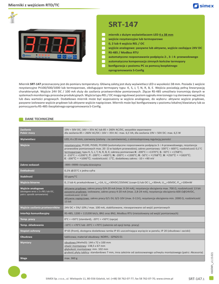 Miernik SRT-147 przeznaczony jest do pomiaru temperatury. Główną zaletą jest duży wyświetlacz LED o wysokości 38 mm. Posiada 1 wejście
