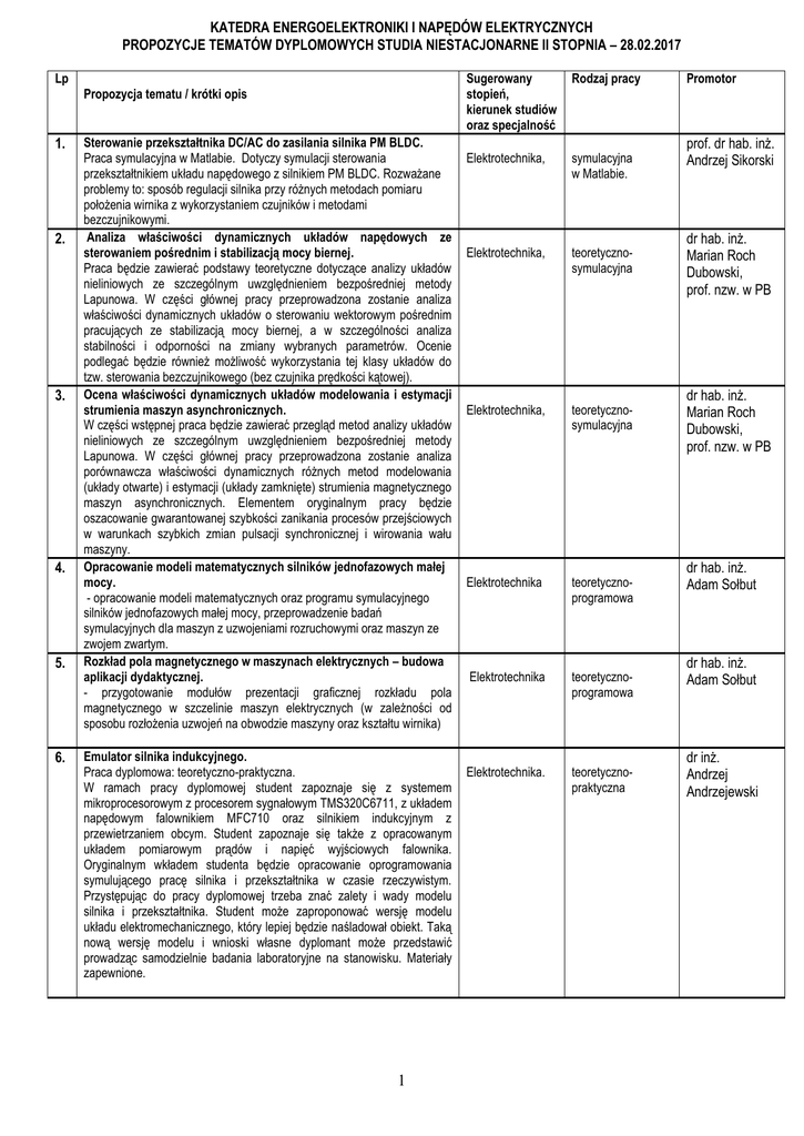 KATEDRA ENERGOELEKTRONIKI I NAPĘDÓW ELEKTRYCZNYCH PROPOZYCJE TEMATÓW DYPLOMOWYCH STUDIA NIESTACJONARNE II STOPNIA – 28.02.2017 Lp Propozycja tematu / krótki opis 1. 2. 3. 4. 5. 6. Sterowanie przekształtnika DC/AC do zasilania silnika PM BLDC. Praca symulacyjna w Matlabie. Dotyczy symulacji sterowania przekształtnikiem układu napędowego z silnikiem PM BLDC. Rozważane problemy to: sposób regulacji silnika przy różnych metodach pomiaru położenia wirnika z wykorzystaniem czujników i metodami bezczujnikowymi. Analiza właściwości dynamicznych układów napędowych ze sterowaniem pośrednim i stabilizacją mocy biernej. Praca będzie zawierać podstawy teoretyczne dotyczące analizy układów nieliniowych ze szczególnym uwzględnieniem bezpośredniej metody Lapunowa. W części głównej pracy przeprowadzona zostanie analiza właściwości dynamicznych układów o sterowaniu wektorowym pośrednim pracujących ze stabilizacją mocy biernej, a w szczególności analiza stabilności i odporności na zmiany wybranych parametrów. Ocenie podlegać będzie również możliwość wykorzystania tej klasy układów do tzw. sterowania bezczujnikowego (bez czujnika prędkości kątowej). Ocena właściwości dynamicznych układów modelowania i estymacji strumienia maszyn asynchronicznych. W części wstępnej praca będzie zawierać przegląd metod analizy układów nieliniowych ze szczególnym uwzględnieniem bezpośredniej metody Lapunowa. W części głównej pracy przeprowadzona zostanie analiza porównawcza właściwości dynamicznych różnych metod modelowania (układy otwarte) i estymacji (układy zamknięte) strumienia magnetycznego maszyn asynchronicznych. Elementem oryginalnym pracy będzie oszacowanie gwarantowanej szybkości zanikania procesów przejściowych w warunkach szybkich zmian pulsacji synchronicznej i wirowania wału maszyny. Opracowanie modeli matematycznych silników jednofazowych małej mocy. - opracowanie modeli matematycznych oraz programu symulacyjnego silników jednofazowych małej mocy, przeprowadzenie badań symulacyjnych dla maszyn z uzwojeniami rozruchowymi oraz maszyn ze zwojem zwartym. Rozkład pola magnetycznego w maszynach elektrycznych – budowa aplikacji dydaktycznej. - przygotowanie modułów prezentacji graficznej rozkładu pola magnetycznego w szczelinie maszyn elektrycznych (w zależności od sposobu rozłożenia uzwojeń na obwodzie maszyny oraz kształtu wirnika) Emulator silnika indukcyjnego. Praca dyplomowa: teoretyczno-praktyczna. W ramach pracy dyplomowej student zapoznaje się z systemem mikroprocesorowym z procesorem sygnałowym TMS320C6711, z układem napędowym falownikiem MFC710 oraz silnikiem indukcyjnym z przewietrzaniem obcym. Student zapoznaje się także z opracowanym układem pomiarowym prądów i napięć wyjściowych falownika. Oryginalnym wkładem studenta będzie opracowanie oprogramowania symulującego pracę silnika i przekształtnika w czasie rzeczywistym. Przystępując do pracy dyplomowej trzeba znać zalety i wady modelu silnika i przekształtnika. Student może zaproponować wersję modelu układu elektromechanicznego, który lepiej będzie naśladował obiekt. Taką nową wersję modelu i wnioski własne dyplomant może przedstawić prowadząc samodzielnie badania laboratoryjne na stanowisku. Materiały zapewnione. 1 Sugerowany stopień, kierunek studiów oraz specjalność Rodzaj pracy Promotor Elektrotechnika, symulacyjna w Matlabie. Elektrotechnika, teoretycznosymulacyjna dr hab. inż. Marian Roch Dubowski, prof. nzw. w PB Elektrotechnika, teoretycznosymulacyjna dr hab. inż. Marian Roch Dubowski, prof. nzw. w PB Elektrotechnika teoretycznoprogramowa Elektrotechnika teoretycznoprogramowa Elektrotechnika. teoretycznopraktyczna prof. dr hab. inż. Andrzej Sikorski dr hab. inż. Adam Sołbut dr hab. inż. Adam Sołbut dr inż. Andrzej Andrzejewski 7. Analizator mocy odbiorników nieliniowych. Praca praktyczna. Celem pracy jest przegląd teorii mocy odbiorników nieliniowych i napisanie programu na DSP do wyznaczania mocy według koncepcji Czarneckiego, Budeanu i Fryzego. Materiały zapewnione. 8. Sterowanie energoelektronicznym filtrem aktywnym – porównanie i ocena właściwości wybranych metod sterowania. Praca teoretyczno symulacyjna mająca na celu porównanie wybranych metod sterowania energoelektronicznym filtrem aktywnym pod kątem poprawy jakości prądu pobieranego z sieci, do której podłączono duże odbiorniki nieliniowe (np. prostowniki diodowe lub tyrystorowe). Realizacja pracy będzie wymagała znajomości literatury w języku angielskim oraz znajomości środowiska MATLAB/Simulink. Analiza i badania symulacyjne mostkowego przekształtnika DC/DC z równoległym trójgałęziowym obwodem rezonansowym. Praca dotyczyć będzie analizy układu mostkowego przekształtnika z obwodem rezonansowym równoległym trójgałęziowym. Następnie rozważania analityczne powinny zostać potwierdzone i zweryfikowane poprzez badania symulacyjne, na bazie których zostaną wyznaczone odpowiednie przebiegi i charakterystyki. 10. Analiza metod sterowania pięciopoziomowego przekształtnika AC/DC. Celem pracy jest stworzenie modelu pięciopoziomowego przekształtnika AC/DC w środowisku Matlab Simulink, implementacja podstawowych metod sterowania, zaproponowanie zmian algorytmów sterowania oraz przeprowadzenie badań symulacyjnych. Podczas realizacja pracy mile widziana znajomość programu Matlab. Część literatury może być dostępna tylko w języku angielskim. 9. 11. Symetryzacja napięć sieci elektroenergetycznych przy wykorzystaniu energoelektronicznego filtra aktywnego. (praca analityczno-symulacyjna). Celem pracy jest przeprowadzenie analizy problemu związanego z niesymetrią napięć w sieciach elektroenergetycznych oraz przeprowadzenie badań symulacyjnych w programie Matlab Simulink symetryzacji napięć sieci przy wykorzystaniu energoelektronicznego filtra aktywnego. Wymagana jest znajomość na 