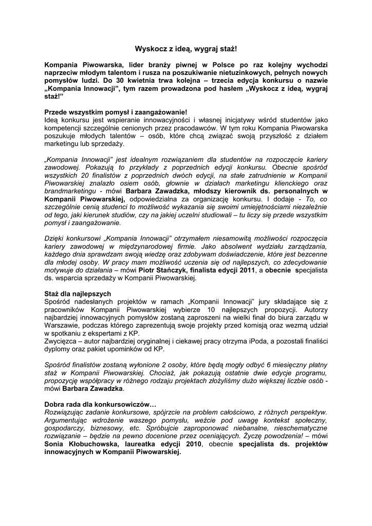 Wyskocz z ideą, wygraj staż! Kompania Piwowarska, lider branży piwnej w Polsce po raz kolejny wychodzi naprzeciw młodym talentom i rusza na poszukiwanie nietuzinkowych, pełnych nowych pomysłów ludzi. Do 30 kwietnia trwa kolejna – trzecia edycja konkursu o nazwie „Kompania Innowacji”, tym razem prowadzona pod hasłem „Wyskocz z ideą, wygraj staż!” Przede wszystkim pomysł i zaangażowanie! Ideą konkursu jest wspieranie innowacyjności i własnej inicjatywy wśród studentów jako kompetencji szczególnie cenionych przez pracodawców. W tym roku Kompania Piwowarska poszukuje młodych talentów – osób, które chcą związać swoją przyszłość z działem marketingu lub sprzedaży. „Kompania Innowacji” jest idealnym rozwiązaniem dla studentów na rozpoczęcie kariery zawodowej. Pokazują to przykłady z poprzednich edycji konkursu. Obecnie spośród wszystkich 20 finalistów z poprzednich dwóch edycji, na stałe zatrudnienie w Kompanii Piwowarskiej znalazło osiem osób, głownie w działach marketingu klienckiego oraz brandmarketingu - mówi Barbara Zawadzka, młodszy kierownik ds. personalnych w Kompanii Piwowarskiej, odpowiedzialna za organizację konkursu. I dodaje - To, co szczególnie cenią studenci to możliwość wykazania się swoimi umiejętnościami niezależnie od tego, jaki kierunek studiów, czy na jakiej uczelni studiowali – tu liczy się przede wszystkim pomysł i zaangażowanie. Dzięki konkursowi „Kompania Innowacji” otrzymałem niesamowitą możliwości rozpoczęcia kariery zawodowej w międzynarodowej firmie. Jako absolwent wydziału zarządzania, każdego dnia sprawdzam swoją wiedzę oraz zdobywam doświadczenie, które jest bezcenne dla młodej osoby. W pracy mam możliwość uczenia się od najlepszych, co zdecydowanie motywuje do działania – mówi Piotr Stańczyk, finalista edycji 2011, a obecnie specjalista ds. wsparcia sprzedaży w Kompanii Piwowarskiej. Staż dla najlepszych Spośród nadesłanych projektów w ramach „Kompanii Innowacji” jury składające się z pracowników Kompanii Piwowarskiej wybierze 10 najlepszych propozycji. Autorzy najbardziej innowacyjnych pomysłów zostaną zaproszeni na wielki finał do biura zarządu w Warszawie, podczas którego zaprezentują swoje projekty przed komisją oraz wezmą udział w spotkaniu z ekspertami z KP. Zwycięzca – autor najbardziej oryginalnej i ciekawej pracy otrzyma iPoda, a pozostali finaliści dyplomy oraz pakiet upominków od KP. Spośród finalistów zostaną wyłonione 2 osoby, które będą mogły odbyć 6 miesięczny płatny staż w Kompanii Piwowarskiej. Chociaż, jak pokazują ostatnie dwie edycje programu, propozycję współpracy w różnego rodzaju projektach złożyliśmy dużo większej liczbie osób mówi Barbara Zawadzka. Dobra rada dla konkursowiczów… Rozwiązując zadanie konkursowe, spójrzcie na problem całościowo, z różnych perspektyw. Argumentując wdrożenie waszego pomysłu, weźcie pod uwagę kontekst społeczny, gospodarczy, biznesowy, etc. Spróbujcie zaproponować niebanalne, nieschematyczne rozwiązanie – będzie na pewno docenione przez oceniających. Życzę powodzenia! – mówi Sonia Kłobuchowska, laureatka edycji 2010, obecnie specjalista ds. projektów innowacyjnych w Kompanii Piwowarskiej. Uwierzcie w siebie i wykorzystajcie każdą szansę na pokazanie, jacy naprawdę jesteście. Powodzenia! – zachęca Ada Danisz, finalistka edycji 2010, obecnie specjalista ds. zarządzania marką Tyskie w Kompanii Piwowarskiej. Zgłoszenia w ramach konkursu „Kompania Innowacji” można nadsyłać do 30 kwietnia. Szczegóły konkursu na stronie: http://www.kp.pl/kariera-w-kp/strefa-studenta-i-specjalisty/konkurs-staz-2012/ . *** Do redaktora: Kompania Piwowarska - Lider branży piwowarskiej w Polsce Kompania Piwowarska jest największym przedsiębiorstwem piwowarskim w Polsce. Kilkusetletnie doświadczenia w warzeniu piwa, nowoczesne technologie i rygorystyczne przestrzeganie zasad produkcji na światowym poziomie gwarantują najwyższą jakość naszych produktów. Do portfela marek KP należą najpopularniejsze polskie piwa - m.in. Tyskie, Żubr, Lech, Dębowe Mocne, Redd's, a także międzynarodowe marki premium: Pilsner Urquell, Grolsch oraz Peroni Nastro Azzurro. Kompania Piwowarska (utworzona w 1999 roku) posiada trzy browary (w Tychach, Poznaniu i Białymstoku) oraz oddziały handlowe na terenie całego kraju. Kompania Piwowarska prowadzi także działalność społeczną nastawioną na walkę z wykluczeniem społecznym na tle ubóstwa oraz programy edukacyjne popularyzujące odpowiedzialność i umiar w konsumowaniu alkoholu. Wielkość sprzedaży osiągniętej przez KP w roku finansowym zakończonym 31 marca 2011 r. wyniosła 14,1 mln hektolitrów piwa. SABMiller – jeden z największych na świecie producentów piwa Kompania Piwowarska jest częścią jednego z największych na świecie producentów piwa - SABMiller plc. Grupa produkuje lub dystrybuuje piwo na sześciu kontynentach, a jej ogólnoświatowy portfel obejmuje międzynarodowe piwa premium, takie jak Grolsch, Miller Genuine Draft, Peroni Nastro Azzurro czy Pilsner Urquell oraz czołowe marki lokalne, takie jak Aquila, Castle, Miller Lite, Snow czy Tyskie. SABMiller jest jedną z największych na świecie (poza USA) firm rozlewających produkty Coca-Coli. W roku finansowym zakończonym 31 marca 2011 SABMiller osiągnął przychody w wysokości 28,3 mld USD oraz wypracował zysk brutto (EBITA) w wysokości 5 mld USD. SABMiller plc jest notowany na giełdach papierów wartościowych w Londynie i Johannesburgu. Dodatkowych informacji udziela: Wojciech Mrugalski kierownik ds. komunikacji [email protected] Tel. + 48 61 667 7667 tel. kom. + 48 601 91 11 44 Fax + 48 61 667 7850
