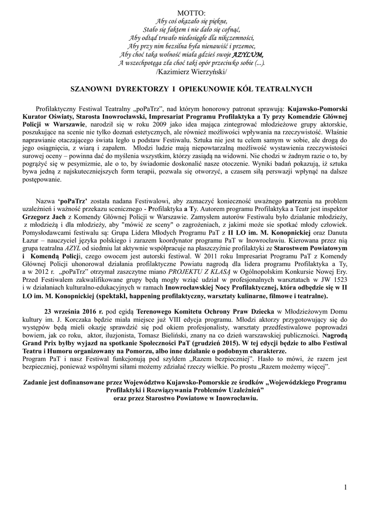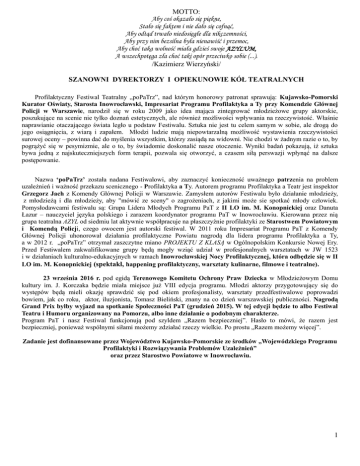 MOTTO: Aby coś okazało się piękne, Stało się faktem i nie dało się cofnąć, Aby odtąd trwało niedosięgłe dla nikczemności, Aby przy nim bezsilna była nienawiść i przemoc, Aby choć taka wolność miała gdzieś swoje AZYLUM, A wszechpotęga zła choć taki opór przeciwko sobie (...). /Kazimierz Wierzyński/ SZANOWNI DYREKTORZY I OPIEKUNOWIE KÓŁ TEATRALNYCH Profilaktyczny Festiwal Teatralny „poPaTrz”, nad którym honorowy patronat sprawują: Kujawsko-Pomorski Kurator Oświaty, Starosta Inowrocławski, Impresariat Programu Profilaktyka a Ty przy Komendzie Głównej Policji w Warszawie, narodził się w roku 2009 jako idea mająca zintegrować młodzieżowe grupy aktorskie, poszukujące na scenie nie tylko doznań estetycznych, ale również możliwości wpływania na rzeczywistość. Właśnie naprawianie otaczającego świata legło u podstaw Festiwalu. Sztuka nie jest tu celem samym w sobie, ale drogą do jego osiągnięcia, z wiarą i zapałem. Młodzi ludzie mają niepowtarzalną możliwość wystawienia rzeczywistości surowej oceny – powinna dać do myślenia wszystkim, którzy zasiądą na widowni. Nie chodzi w żadnym razie o to, by pogrążyć się w pesymizmie, ale o to, by świadomie doskonalić nasze otoczenie. Wyniki badań pokazują, iż sztuka bywa jedną z najskuteczniejszych form terapii, pozwala się otworzyć, a czasem siłą perswazji wpłynąć na dalsze postępowanie. Nazwa ‘poPaTrz’ została nadana Festiwalowi, aby zaznaczyć konieczność uważnego patrzenia na problem uzależnień i ważność przekazu scenicznego - Profilaktyka a Ty. Autorem programu Profilaktyka a Teatr jest inspektor Grzegorz Jach z Komendy Głównej Policji w Warszawie. Zamysłem autorów Festiwalu było działanie młodzieży, z młodzieżą i dla młodzieży, aby "mówić ze sceny" o zagrożeniach, z jakimi może sie spotkać młody człowiek. Pomysłodawcami festiwalu są: Grupa Lidera Młodych Programu PaT z II LO im. M. Konopnickiej oraz Danuta Łazur – nauczyciel języka polskiego i zarazem koordynator programu PaT w Inowrocławiu. Kierowana przez nią grupa teatralna AZYL od siedmiu lat aktywnie współpracuje na płaszczyźnie profilaktyki ze Starostwem Powiatowym i Komendą Policji, czego owocem jest autorski festiwal. W 2011 roku Impresariat Programu PaT z Komendy Głównej Policji uhonorował działania profilaktyczne Powiatu nagrodą dla lidera programu Profilaktyka a Ty, a w 2012 r. „poPaTrz” otrzymał zaszczytne miano PROJEKTU Z KLASĄ w Ogólnopolskim Konkursie Nowej Ery. Przed Festiwalem zakwalifikowane grupy będą mogły wziąć udział w profesjonalnych warsztatach w JW 1523 i w działaniach kulturalno-edukacyjnych w ramach Inowrocławskiej Nocy Profilaktycznej, która odbędzie się w II LO im. M. Konopnickiej (spektakl, happening profilaktyczny, warsztaty kulinarne, filmowe i teatralne). 23 września 2016 r. pod egidą Terenowego Komitetu Ochrony Praw Dziecka w Młodzieżowym Domu kultury im. J. Korczaka będzie miała miejsce już VIII edycja programu. Młodzi aktorzy przygotowujący się do występów będą mieli okazję sprawdzić się pod okiem profesjonalisty, warsztaty przedfestiwalowe poprowadzi bowiem, jak co roku, aktor, iluzjonista, Tomasz Bieliński, znany na co dzień warszawskiej publiczności. Nagrodą Grand Prix byłby wyjazd na spotkanie Społeczności PaT (grudzień 2015). W tej edycji będzie to albo Festiwal Teatru i Humoru organizowany na Pomorzu, albo inne działanie o podobnym charakterze. Program PaT i nasz Festiwal funkcjonują pod szyldem „Razem bezpieczniej”. Hasło to mówi, że razem jest bezpieczniej, ponieważ wspólnymi siłami możemy zdziałać rzeczy wielkie. Po prostu „Razem możemy więcej”. Zadanie jest dofinansowane przez Województwo Kujawsko-Pomorskie ze środków „Wojewódzkiego Programu Profilaktyki i Rozwiązywania Problemów Uzależnień” oraz przez Starostwo Powiatowe w Inowrocławiu. 1 Regulamin VIII Wojewódzkiego Profilaktycznego Festiwalu Teatralnego„poPaTrz” pod patronatem KUJAWSKO-POMORSKIEGO KURATORA OŚWIATY, STAROSTY INOWROCŁAWSKIEGO i IMPRESARIATU PROGRAMU PaT Rozdział I INFORMACJE WSTĘPNE 1. Organizatorami VIII Profilaktycznego Festiwalu Teatralnego „poPaTrz”, zwanego dalej Festiwalem, są: Starostwo Powiatowe w Inowrocławiu Terenowy Komitet Ochrony Praw Dziecka II Liceum Ogólnokształcące im. Marii Konopnickiej w Inowrocławiu Zadanie jest dofinansowane przez Starostwo Powiatowe i Województwo Kujawsko-Pomorskie ze środków „Wojewódzkiego Programu Profilaktyki i Rozwiązywania Problemów Uzależnień” Partnerzy: Komenda Powiatowa Policji w Inowrocławiu, Jednostka Wojskowa 1523, Młodzieżowy Dom Kultury im. J. Korczaka w Inowrocławiu, Ośrodek Profilaktyki i Rozwiązywania Problemów Uzależnień, Fundacja Ekspert Kujawy STOWARZYSZENIE na rzecz Edukacji i Profilaktyki „SYMPATYCY". Patronat honorowy pełni: Kujawsko-Pomorski Kurator Oświaty, Starosta Inowrocławski, Impresariat Programu Profilaktyka a Ty przy Komendzie Głównej Policji w Warszawie. Patronat medialny: Gazeta Pomorska, www.inowroclaw.info.pl, TEATRAZYL.pl, Radio i TV TRAP. 2. PFT „poPaTrz” ma charakter festiwalu. Jego celami są: o kontynuowanie idei I Profilaktycznego Festiwalu Teatralnego z czerwca 2009 r., o prezentacja dorobku artystycznego teatrów nieprofesjonalnych z terenu województwa oraz inspirowanie poszukiwań nowych form pracy artystycznej, o aktywizacja twórczej pracy nad problemami profilaktycznymi, możliwość integracji w walce przeciwko negatywnym zjawiskom społecznym dotykającym młode pokolenie, o poszerzenie wiedzy młodzieży z zakresu profilaktyki, próba wykształcenia mechanizmów obronnych wobec negatywnych zjawisk społecznych. 2 Rozdział II KONKURS TEATRALNY 1. Konkurs teatralny polega na wyłonieniu spośród Grup Teatralnych z terenu całego województwa 6 grup festiwalowych. 2. W festiwalu uczestniczyć mogą grupy nieprofesjonalne z terenu