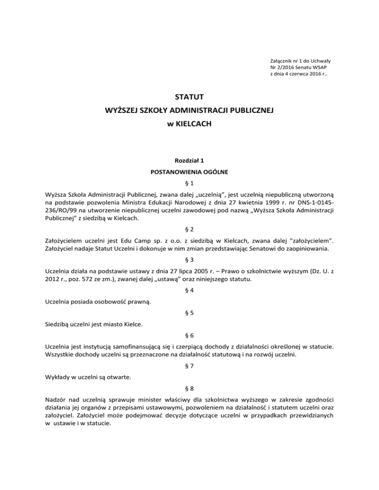 Załącznik nr 1 do Uchwały Nr 2/2016 Senatu WSAP z dnia 4 czerwca 2016 r.. STATUT WYŻSZEJ SZKOŁY ADMINISTRACJI PUBLICZNEJ w KIELCACH Rozdział 1 POSTANOWIENIA OGÓLNE §1 Wyższa Szkoła Administracji Publicznej, zwana dalej „uczelnią”, jest uczelnią niepubliczną utworzoną na podstawie pozwolenia Ministra Edukacji Narodowej z dnia 27 kwietnia 1999 r. nr DNS-1-0145236/RO/99 na utworzenie niepublicznej uczelni zawodowej pod nazwą „Wyższa Szkoła Administracji Publicznej” z siedzibą w Kielcach. §2 Założycielem uczelni jest Edu Camp sp. z o.o. z siedzibą w Kielcach, zwana dalej "założycielem”. Założyciel nadaje Statut Uczelni i dokonuje w nim zmian przedstawiając Senatowi do zaopiniowania. §3 Uczelnia działa na podstawie ustawy z dnia 27 lipca 2005 r. – Prawo o szkolnictwie wyższym (Dz. U. z 2012 r., poz. 572 ze zm.), zwanej dalej „ustawą” oraz niniejszego statutu. §4 Uczelnia posiada osobowość prawną. §5 Siedzibą uczelni jest miasto Kielce. §6 Uczelnia jest instytucją samofinansującą się i czerpiącą dochody z działalności określonej w statucie. Wszystkie dochody uczelni są przeznaczone na działalność statutową i na rozwój uczelni. §7 Wykłady w uczelni są otwarte. §8 Nadzór nad uczelnią sprawuje minister właściwy dla szkolnictwa wyższego w zakresie zgodności działania jej organów z przepisami ustawowymi, pozwoleniem na działalność i statutem uczelni oraz założyciel. Założyciel może podejmować decyzje dotyczące uczelni w przypadkach przewidzianych w ustawie i w statucie. Rozdział 2 CELE I FORMY DZIAŁANIA UCZELNI §9 Podstawowymi zadaniami uczelni są: 1) kształcenie dla potrzeb administracji publicznej i gospodarczej, 2) stwarzanie możliwości prowadzenia badań naukowych i prac rozwojowych oraz świadczenie usług badawczych, 3) przygotowanie kandydatów do samodzielnej pracy naukowej i dydaktycznej, 4) kształcenie w celu uzupełnienia wiedzy ogólnej i specjalistycznej osób posiadających tytuły zawodowe i wykonujących zawody praktyczne w ramach kształcenia przez całe życie, 5) rozwijanie i upowszechnianie wiedzy o administracji publicznej i gospodarczej oraz uczestniczenie w praktycznym stosowaniu dorobku nauki, 6) dbanie o zdrowie i rozwój fizyczny studentów, 7) wychowanie studentów w duchu poszanowania praw człowieka, patriotyzmu, demokracji i odpowiedzialności za losy społeczeństwa i państwa, 8) podejmowanie starań, aby w środowisku akademickim panował kult prawdy i sumiennej pracy oraz atmosfera wzajemnej życzliwości, 9) udzielanie pomocy metodycznej, organizacyjnej i merytorycznej administracyjnym i gospodarczym podejmującym szkolenie kadr. jednostkom 10) Stwarzanie osobom niepełnosprawnym warunków do pełnego udziału w procesie kształcenia § 10 Uczelnia realizuje swoje zadania poprzez: 1) prowadzenie studiów wyższych pierwszego stopnia o profilu praktycznym. 2) prowadzenie studiów podyplomowych w zakresie związanym w prowadzonymi kierunkami studiów oraz kursów dokształcających, 3) prowadzenie działalności naukowo-badawczej i dydaktycznej; 4) wydawanie dyplomów ukończenia studiów potwierdzających uzyskanie tytułu zawodowego, świadectw ukończenia studiów podyplomowych, kursów dokształcających i szkoleń oraz potwierdzanie efektów uczenia się; 5) utrzymywanie i rozwijanie stałych kontaktów z instytucjami partnerskimi w kraju i za granicą; 6) prowadzenie działalności wydawniczej służącej rozwijaniu i upowszechnianiu wiedzy o administracji publicznej i gospodarczej. Rozdział 3 MAJĄTEK I FINANSE UCZELNI § 11 Mienie uczelni obejmuje własność i inne prawa majątkowe. -2- § 12 Uczelnia może uzyskiwać środki finansowe z: 1) opłat pobieranych przez uczelnię, 2) odpłatnej działalności badawczej, 3) udziałów z działalności podmiotów gospodarczych, przychodów z własnej działalności gospodarczej i odsetek, 4) przychodów ze sprzedaży własnego mienia oraz z odpłatności za korzystanie z tych składników przez osoby trzecie, 5) z dotacji założyciela, 6) darowizn, dotacji, zapisów, spadków oraz ofiarności publicznej także pochodzenia zagranicznego, 7) dotacji z budżetów jednostek samorządu terytorialnego bądź ich związków, 8) dotacji z budżetu państwa, 9) środków z Unii Europejskiej. § 13 Uczelnia prowadzi samodzielną gospodarkę finansową w ramach posiadanych środków na podstawie planu rzeczowo-finansowego oraz zasad gospodarki finansowej uczelni, określonych w odrębnych przepisach. Plan rzeczowo-finansowy określa podział zadań i środków na poszczególne rodzaje działalności. Plan finansowy jest sporządzany w układzie odpowiadającym sprawozdawczości finansowej obowiązującej w Uczelni. Plan rzeczowo-finansowy uczelni opracowuje Prorektor ds. studenckich i finansowych a zatwierdza założyciel po zaopiniowaniu przez Senat. § 14 Uczelnia opracowuje trzyletni plan perspektywiczny. Plan jest aktualizowany krocząco. Plan trzyletni, zatwierdza założyciel po zaopiniowaniu przez senat. Założyciel może zażądać opracowania planu naprawczego uczelni, jeśli uzna, że jej sytuacja jest zła lub znacząco się pogarsza. Plan naprawczy i system monitorowania przebiegu jego realizacji zatwierdza założyciel. § 15 Za prawidłowe prowadzenie gospodarki finansowej odpowiedzialny jest rektor. § 15 A Założyciel może powołać pełnomocnika do spraw finansów i rozwoju uczelni. W zakresie swojej odpowiedzialności, pełnomocnik współdziała z organami uczelni. Rozdział 4 ORGANIZACJA UCZELNI § 16 Kierunki studiów są tworzone i znoszone przez senat na wniosek rektora i za zgodą założyciela. § 17 W uczelni nie tworzy się podstawowych jednostek organizacyjnych. -3- § 18 skreślony § 19 Uczelnia może tworzyć jednostki międzyuczelniane, jednostki wspólne z innymi podmiotami, w szczególności instytucjami naukowymi, w tym również zagranicznymi. Umowy o utworzeniu jednostek, o których mo
