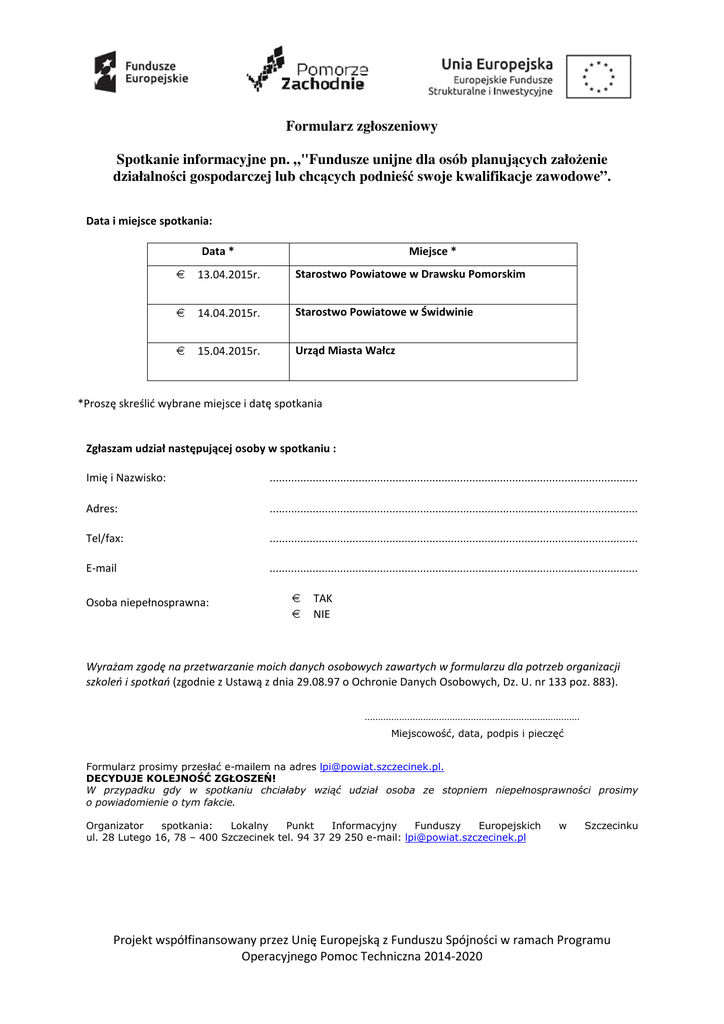 Formularz zgłoszeniowy Spotkanie informacyjne pn. „"Fundusze unijne dla osób planujących założenie działalności gospodarczej lub chcących podnieść swoje kwalifikacje zawodowe”. Data i miejsce spotkania: Data * Miejsce * € 13.04.2015r. Starostwo Powiatowe w Drawsku Pomorskim € 14.04.2015r. Starostwo Powiatowe w Świdwinie € 15.04.2015r. Urząd Miasta Wałcz *Proszę skreślić wybrane miejsce i datę spotkania Zgłaszam udział następującej osoby w spotkaniu : Imię i Nazwisko: ........................................................................................................................ Adres: ........................................................................................................................ Tel/fax: ........................................................................................................................ E-mail ........................................................................................................................ Osoba niepełnosprawna: € € TAK NIE Wyrażam zgodę na przetwarzanie moich danych osobowych zawartych w formularzu dla potrzeb organizacji szkoleń i spotkań (zgodnie z Ustawą z dnia 29.08.97 o Ochronie Danych Osobowych, Dz. U. nr 133 poz. 883). ……………………………………………………………………… Miejscowość, data, podpis i pieczęć Formularz prosimy przesłać e-mailem na adres [email protected]. DECYDUJE KOLEJNOŚĆ ZGŁOSZEŃ! W przypadku gdy w spotkaniu chciałaby wziąć udział osoba ze stopniem niepełnosprawności prosimy o powiadomienie o tym fakcie. Organizator spotkania: Lokalny Punkt Informacyjny Funduszy Europejskich ul. 28 Lutego 16, 78 – 400 Szczecinek tel. 94 37 29 250 e-mail: [email protected] w Szczecinku Projekt współfinansowany przez Unię Europejską z Funduszu Spójności w ramach Programu Operacyjnego Pomoc Techniczna 2014-2020