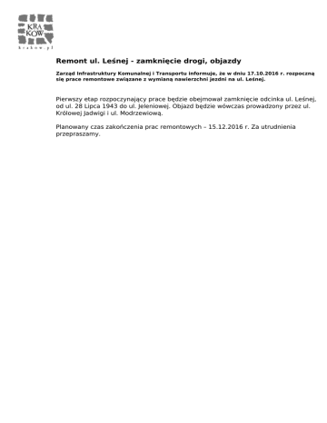 Remont ul. Leśnej - zamknięcie drogi, objazdy Zarząd Infrastruktury Komunalnej i Transportu informuje, że w dniu 17.10.2016 r. rozpoczną się prace remontowe związane z wymianą nawierzchni jezdni na ul. Leśnej. Pierwszy etap rozpoczynający prace będzie obejmował zamknięcie odcinka ul. Leśnej, od ul. 28 Lipca 1943 do ul. Jeleniowej. Objazd będzie wówczas prowadzony przez ul. Królowej Jadwigi i ul. Modrzewiową. Planowany czas zakończenia prac remontowych – 15.12.2016 r. Za utrudnienia przepraszamy. Powered by TCPDF (www.tcpdf.org)