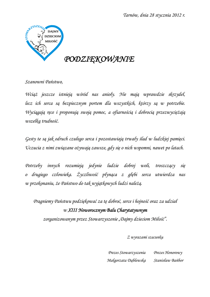 Tarnów, dnia 28 stycznia 2012 r. PODZIĘKOWANIE Szanowni Państwo, Wciąż jeszcze istnieją wśród nas anioły. Nie mają wprawdzie skrzydeł, lecz ich serca są bezpiecznym portem dla wszystkich, którzy są w potrzebie. Wyciągają ręce i proponują swoją pomoc, a ofiarnością i dobrocią przezwyciężają wszelką trudność. Gesty te są jak odruch czułego serca i pozostawiają trwały ślad w ludzkiej pamięci. Uczucia z nimi związane ożywają zawsze, gdy się o nich wspomni, nawet po latach. Potrzeby innych rozumieją jedynie ludzie dobrej woli, troszczący się o drugiego człowieka. Życzliwość płynąca z głębi serca utwierdza nas w przekonaniu, że Państwo do tak wyjątkowych ludzi należą. Pragniemy Państwu podziękować za tę dobroć, serce i hojność oraz za udział w XIII Noworocznym Balu Charytatywnym zorganizowanym przez Stowarzyszenie „Dajmy dzieciom Miłość”. Z wyrazami szacunku Prezes Stowarzyszenia Prezes Honorowy Małgorzata Dąblewska Stanisław Bańbor