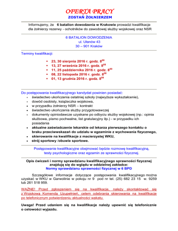 OFERTA PRACY ZOSTAŃ ŻOŁNIERZEM Informujemy, że 6 batalion dowodzenia w Krakowie prowadzi kwalifikacje dla żołnierzy rezerwy - ochotników do zawodowej służby wojskowej oraz NSR 6 BATALION DOWODZENIA ul. Ułanów 43 30 – 901 Kraków Terminy kwalifikacji: 23, 30 sierpnia 2016 r. godz. 800 13, 27 września 2016 r. godz. 800 11, 25 października 2016 r. godz. 800 08, 22 listopada 2016 r. godz. 800 01, 13 grudnia 2016 r. godz. 800 Do postępowania kwalifikacyjnego kandydat powinien posiadać: świadectwo ukończenia ostatniej szkoły (najwyższe wykształcenie), dowód osobisty, książeczka wojskowa, w przypadku żołnierzy NSR – kontrakt świadectwo ukończenia służby przygotowawczej dokumenty opiniodawcze uzyskane po odbyciu służby wojskowej (np.: opinia służbowa, pismo pochwalne, list gratulacyjny itp.) - w przypadku ich posiadania aktualne zaświadczenie lekarskie od lekarza pierwszego kontaktu o braku przeciwwskazań do udziału w egzaminie z wychowania fizycznego, skierowanie na kwalifikacje z macierzystej WKU, strój sportowy /obuwie sportowe. Postępowanie kwalifikacyjne obejmować będzie rozmowę kwalifikacyjną, testy psychologiczne oraz egzamin ze sprawności fizycznej. Opis ćwiczeń i normy sprawdzianu kwalifikacyjnego sprawności fizycznej znajdują się do wglądu w oddzielnej zakładce: Normy sprawdzianu sprawności fizycznej w 6 BPD Szczegółowe informacje dotyczące postępowania kwalifikacyjnego można uzyskać w WKU w Garwolinie w pokoju nr 9 pod nr tel. (25) 682 23 15 w. 9259 lub 261 518 959. WAŻNE! Przed zgłoszeniem się na kwalifikacje, należy skontaktować się z Wojskową Komendą Uzupełnień, celem odebrania skierowania na kwalifikacje po telefonicznym potwierdzeniu aktualności wakatu. Uwaga! Przed udaniem się na kwalifikacje należy upewnić się telefonicznie o celowości wyjazdu. LISTA POTRZEB (WAKATÓW) W 6 BATALIONIE DOWODZENIA (STAN NA DZIEŃ 25.07.2016 R.) NAZWA STANOWISKA LP SW1 podof. 20C25 podof. st. 54D21 podof. 38T21 ZAW. ZAW. 1. INSTRUKTOR 2. PEŁNOMOCNIK DS. OCHRONY INFORMACJI NIEJAWNYCH 3. TECHNIK PODODDZIAŁU 4. KIEROWCA szer./st.szer. 38T65 5. KIEROWCA MAGAZYNIER szer./st.szer. 38T64 SW2 RODZAJ STANOWISKA STE ZAW. 99Z99 38B74 Dla stopni etatowych stanowisk służbowych podoficerów określono następujące stopnie wojskowe: podoficer młodszy (podof. mł.): kapral, starszy kapral, plutonowy: podoficer (podof.): sierżant, starszy sierżant, młodszy chorąży; podoficer starszy (podof. st.): chorąży, starszy chorąży, starszy chorąży sztabowy ZAW. ZAW.