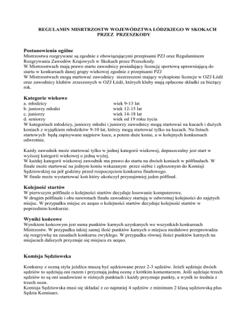 REGULAMIN MISRTRZOSTW WOJEWÓDZTWA ŁÓDZKIEGO W SKOKACH PRZEZ PRZESZKODY Postanowienia ogólne Mistrzostwa rozgrywane są zgodnie z obowiązującymi przepisami PZJ oraz Regulaminem Rozgrywania Zawodów Krajowych w Skokach przez Przeszkody. W Mistrzostwach mają prawo startu zawodnicy posiadający licencję sportową uprawniającą do startu w konkursach danej grupy wiekowej zgodnie z przepisami PZJ W Mistrzostwach mogą startować zawodnicy niezrzeszeni mający wykupione licencje w OZJ Łódź oraz zawodnicy klubów zrzeszonych w OZJ Łódź, których kluby mają opłacone składki za bieżący rok. Kategorie wiekowe a. młodzicy wiek 9-13 lat b. juniorzy młodsi wiek 12-15 lat c. juniorzy wiek 14-18 lat d. seniorzy wiek od 19 roku życia W kategoriach młodzicy, juniorzy młodsi i juniorzy zawodnicy mogą startować na kucach i dużych koniach z wyjątkiem młodzików 9-10 lat, którzy mogą startować tylko na kucach. Na listach startowych będą zapisywane najpierw kuce, a potem duże konie, a w kolejnych konkursach odwrotnie. Każdy zawodnik może startować tylko w jednej kategorii wiekowej, dopuszczalny jest start w wyższej kategorii wiekowej o jedną wyżej. W każdej kategorii wiekowej zawodnik ma prawo do startu na dwóch koniach w półfinałach. W finale może startować na jednym koniu wskazanym przez siebie i zgłoszonym do Komisji Sędziowskiej na pół godziny przed rozpoczęciem konkursu finałowego. W finale może wystartować koń który ukończył przynajmniej jeden półfinał. Kolejność startów W pierwszym półfinale o kolejności startów decyduje losowanie komputerowe. W drugim półfinale i obu nawrotach finału zawodnicy startują w odwrotnej kolejności do zajętych miejsc. W przypadku miejsc ex aequo o kolejności startów decyduje kolejność startów w poprzednim konkursie. Wyniki końcowe Wynikiem końcowym jest suma punktów karnych uzyskanych we wszystkich konkursach Mistrzostw. W przypadku takiej samej ilość punktów karnych o miejsca medalowe przeprowadza się rozgrywkę na zasadach konkursu zwykłego. W przypadku równej ilości punktów karnych na miejscach dalszych przyznaje się miejsca ex aequo. Komisja Sędziowska Konkursy z oceną stylu jeźdźca muszą być sędziowane przez 2-3 sędziów. Jeżeli sędziuje dwóch sędziów to sędziują oni razem i przyznają jedną ocenę z krótkim komentarzem. Jeśli sędziuje trzech sędziów to są oni usadowieni w różnych punktach i każdy przyznaje punkty, a wynik to średnia z trzech ocen. Komisja Sędziowska musi się składać z co najmniej 4 sędziów z minimum 2 klasą sędziowską plus Sędzia Komisarz. -2- Warunki techniczne i rodzaje konkursów dla poszczególnych kategorii wiekowych młodzicy juniorzy młodsi juniorzy seniorzy I półfinał LL 80cm z oceną stylu jęźdźca L z oceną stylu jeźdźca P zwykły N szybkości II półfinał LL 80 cm. z oceną stylu jeźd. L z oceną stylu jeźdźca N zwykły C zwykły I nawrót LL 80cm. z oceną stylu jeźdźca L z oceną stylu jeźdźca N dokładności C dokładności II nawrót LL 90 cm. dokładności L1 dokładności N1 dokładności C1 dokładności FINAŁ Regulamin zatwierdzony przez Zarząd OZJ Łódź dnia 12 kwietnia 2016 r.