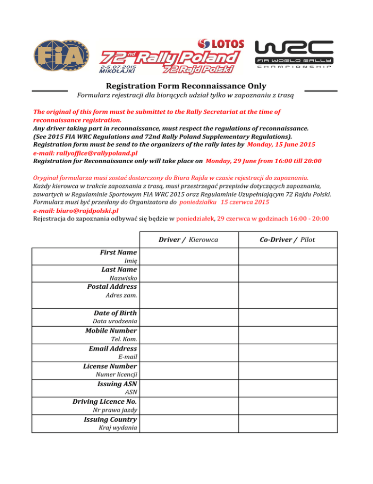 RegistrationFormReconnaissanceOnly Formularzrejestracjidlabiorącychudziałtylkowzapoznaniuztrasą TheoriginalofthisformmustbesubmittettotheRallySecretariatatthetimeof reconnaissanceregistration. Anydrivertakingpartinreconnaissance,mustrespecttheregulationsofreconnaissance. (See2015FIAWRCRegulationsand72ndRallyPolandSupplementaryRegulations). Registrationformmustbesendtotheorganizersoftherallylatesby Monday,15June2015 e‐mail:[email protected] RegistrationforReconnaissanceonlywilltakeplaceon Monday,29Junefrom16:00till20:00 OryginałformularzamusizostaćdostarczonydoBiuraRajduwczasierejestracjidozapoznania. Każdykierowcawtrakciezapoznaniaztrasą,musiprzestrzegaćprzepisówdotyczącychzapoznania, zawartychwRegulaminieSportowymFIAWRC2015orazRegulaminieUzupełniającym72RajduPolski. FormularzmusibyćprzesłanydoOrganizatorado poniedziałku 15czerwca2015 e‐mail:[email protected] Rejestracja do zapoznania odbywać się będzie w poniedziałek, 29 czerwca w godzinach 16:00 - 20:00 Driver/ Kierowca FirstName Imię LastName Nazwisko PostalAddress Adreszam. DateofBirth Dataurodzenia MobileNumber Tel.Kom. EmailAddress E‐mail LicenseNumber Numerlicencji IssuingASN ASN DrivingLicenceNo. Nrprawajazdy IssuingCountry Krajwydania Co‐Driver/ Pilot Detailsofthecar/ Szczegółydotyczącesamochodu RegistrationNumber Make Producent Numerrejestracyjny Model Colour Model Kolor Theundersignedacknowledgethattheyhavedulyread,understoodandagreetobebound bytheabovetermsandcondition. Janiżejpodpisany/azobowiązujesiędoprzestrzeganiapowyższychzasaddotyczących przebieguzapoznaniaztrasą. Driver Kierowca Co‐Driver Pilot RegistrationFee Opłatarejestracyjna Date Data Date Data 800 Euro VATincl. PaymentshouldbedonebySWIFTbanktransfer. Bankdetailsfortransfer/ Danedoprzelewu Bank: Bank Zachodni WBK S.A. 66 o/W‐wa Account Nr: 43 1500 1777 1217 7007 8348 0000 PL 43 1500 1777 1217 7007 8348 0000 IBAN: WBKPPLPP BIC: Account holder: Polski Związek Motorowy ‐ Zarząd Głowny ul. Kazimierzowska 66 PL 02‐518 Warszawa Poland Invoicedetails / Danedofaktury Name/ Nazwa Address/ Adres VATEU/ NIP