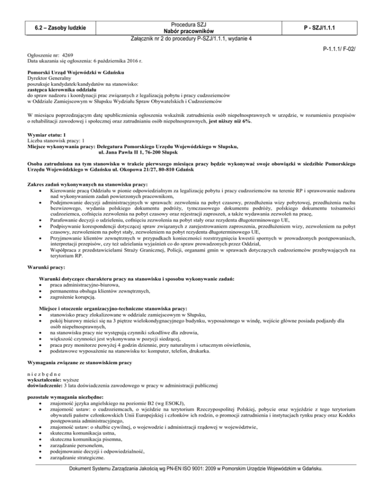 6.2 – Zasoby ludzkie Procedura SZJ Nabór pracowników Załącznik nr 2 do procedury P-SZJ/1.1.1, wydanie 4 P - SZJ/1.1.1 P-1.1.1/ F-02/ Ogłoszenie nr: 4269 Data ukazania się ogłoszenia: 6 października 2016 r. Pomorski Urząd Wojewódzki w Gdańsku Dyrektor Generalny poszukuje kandydatek/kandydatów na stanowisko: zastępca kierownika oddziału do spraw nadzoru i koordynacji prac związanych z legalizacją pobytu i pracy cudzoziemców w Oddziale Zamiejscowym w Słupsku Wydziału Spraw Obywatelskich i Cudzoziemców W miesiącu poprzedzającym datę upublicznienia ogłoszenia wskaźnik zatrudnienia osób niepełnosprawnych w urzędzie, w rozumieniu przepisów o rehabilitacji zawodowej i społecznej oraz zatrudnianiu osób niepełnosprawnych, jest niższy niż 6%. Wymiar etatu: 1 Liczba stanowisk pracy: 1 Miejsce wykonywania pracy: Delegatura Pomorskiego Urzędu Wojewódzkiego w Słupsku, ul. Jana Pawła II 1, 76-200 Słupsk Osoba zatrudniona na tym stanowisku w trakcie pierwszego miesiąca pracy będzie wykonywać swoje obowiązki w siedzibie Pomorskiego Urzędu Wojewódzkiego w Gdańsku ul. Okopowa 21/27, 80-810 Gdańsk Zakres zadań wykonywanych na stanowisku pracy: Kierowanie pracą Oddziału w pionie odpowiedzialnym za legalizację pobytu i pracy cudzoziemców na terenie RP i sprawowanie nadzoru nad wykonywaniem zadań powierzonych pracownikom, Podejmowanie decyzji administracyjnych w sprawach: zezwolenia na pobyt czasowy, przedłużenia wizy pobytowej, przedłużenia ruchu bezwizowego, wydania polskiego dokumentu podróży, tymczasowego dokumentu podróży, polskiego dokumentu tożsamości cudzoziemca, cofnięcia zezwolenia na pobyt czasowy oraz rejestracji zaproszeń, a także wydawania zezwoleń na pracę, Parafowanie decyzji o udzieleniu, cofnięciu zezwolenia na pobyt stały oraz rezydenta długoterminowego UE, Podpisywanie korespondencji dotyczącej spraw związanych z zarejestrowaniem zaproszenia, przedłużeniem wizy, zezwoleniem na pobyt czasowy, zezwoleniem na pobyt stały, zezwoleniem na pobyt rezydenta długoterminowego UE, Przyjmowanie klientów zewnętrznych w przypadkach konieczności rozstrzygnięcia kwestii spornych w prowadzonych postępowaniach, interpretacji przepisów, czy też udzielania wyjaśnień co do spraw prowadzonych przez Oddział, Współpraca z przedstawicielami Straży Granicznej, Policji, organami gmin w sprawach dotyczących cudzoziemców przebywających na terytorium RP. Warunki pracy: Warunki dotyczące charakteru pracy na stanowisku i sposobu wykonywanie zadań: praca administracyjno-biurowa, permanentna obsługa klientów zewnętrznych, zagrożenie korupcją. Miejsce i otoczenie organizacyjno-techniczne stanowiska pracy: stanowisko pracy zlokalizowane w oddziale zamiejscowym w Słupsku, pokój biurowy mieści się na 3 piętrze wielokondygnacyjnego budynku, wyposażonego w windę, wejście główne posiada podjazdy dla osób niepełnosprawnych, na stanowisku pracy nie występują czynniki szkodliwe dla zdrowia, większość czynności jest wykonywana w pozycji siedzącej, praca przy monitorze powyżej 4 godzin dziennie, przy naturalnym i sztucznym oświetleniu, podstawowe wyposażenie na stanowisku to: komputer, telefon, drukarka. Wymagania związane ze stanowiskiem pracy niezbędne wykształcenie: wyższe doświadczenie: 3 lata doświadczenia zawodowego w pracy w administracji publicznej pozostałe wymagania niezbędne: znajomość języka angielskiego na poziomie B2 (wg ESOKJ), znajomość ustaw: o cudzoziemcach, o wjeździe na terytorium Rzeczypospolitej Polskiej, pobycie oraz wyjeździe z tego terytorium obywateli państw członkowskich Unii Europejskiej i członków ich rodzin, o promocji zatrudnienia i instytucjach rynku pracy oraz Kodeks postępowania administracyjnego, znajomość ustaw: o służbie cywilnej, o wojewodzie i administracji rządowej w województwie, skuteczna komunikacja ustna, skuteczna komunikacja pisemna, zarządzanie personelem, podejmowanie decyzji i odpowiedzialność, zarządzanie strategiczne. Dokument Systemu Zarządzania Jakością wg PN-EN ISO 9001: 2009 w Pomorskim Urzędzie Wojewódzkim w Gdańsku. 6.2 – Zasoby ludzkie Procedura SZJ Nabór pracowników Załącznik nr 2 do procedury P-SZJ/1.1.1, wydanie 4 P - SZJ/1.1.1 P-1.1.1/ F-02/ wymagania dodatkowe: wykształcenie wyższe prawnicze lub administracyjne, znajomość innego języka europejskiego obcego na poziomie B2 (wg ESOKJ), Wymagane dokumenty i oświadczenia: życiorys i list motywacyjny, kopia dokumentu potwierdzającego posiadanie polskiego obywatelstwa lub oświadczenie o posiadaniu obywatelstwa polskiego, oświadczenie o wyrażeniu zgody na przetwarzanie danych osobowych do celów rekrutacji, oświadczenie o nieskazaniu prawomocnym wyrokiem za umyślne przestępstwo lub umyślne przestępstwo skarbowe, oświadczenie o korzystaniu z pełni praw publicznych, kopie dokumentów potwierdzających wykształcenie, kopie dokumentów potwierdzających posiadanie wymaganego doświadczenia zawodowego Dokumenty i oświadczenia dodatkowe: kopia dokumentu potwierdzającego niepełnosprawność - w przypadku, gdy kandydatka/kandydat zamierza skorzystać z uprawnienia, o którym mowa w art. 29a ust. 2 ustawy z dnia 21 listopada 2008 r. o służbie cywilnej (Dz. U. z 2016 r. Nr 1345 z późn. zm.), kopie dokumentów potwierdzających spełnienie wymagania dodatkowego w zakresie wykształcenia, kopie dokumentów potwierdzających spełnienie wymagania dodatkowego w zakresie znajomości innego języka europejskiego na poziomie B2 (wg ESOKJ). Termin składania dokumentów: 17 -10-2016 r. Miejsce składania dokumentów: Pomorski Urząd Wojewódzki w Gdańsku Punkt przyjęć korespondencji w holu budynku Urzędu przy wejściu „B” ul. Okopowa 21/27 80-810 Gdańsk Na kopercie i liście motywacyjnym należy umieścić dopisek: 79/16 Inne informacje: O przebiegu naboru kandydaci będą informowani za pośrednictwem poczty elektronicznej, ponadto informacje dotycząc