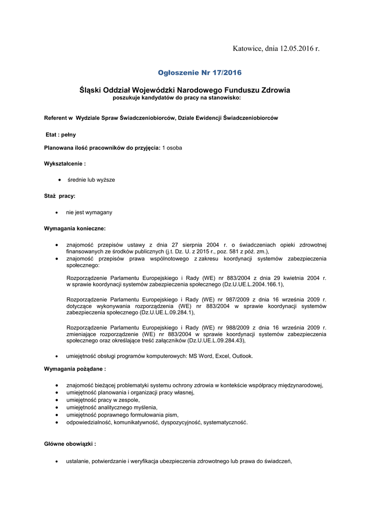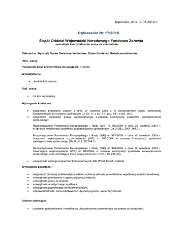 Katowice, dnia 12.05.2016 r. Ogłoszenie Nr 17/2016 Śląski Oddział Wojewódzki Narodowego Funduszu Zdrowia poszukuje kandydatów do pracy na stanowisko: Referent w Wydziale Spraw Świadczeniobiorców, Dziale Ewidencji Świadczeniobiorców Etat : pełny Planowana ilość pracowników do przyjęcia: 1 osoba Wykształcenie : średnie lub wyższe Staż pracy: nie jest wymagany Wymagania konieczne: znajomość przepisów ustawy z dnia 27 sierpnia 2004 r. o świadczeniach opieki zdrowotnej finansowanych ze środków publicznych (j.t. Dz. U. z 2015 r., poz. 581 z póź. zm.), znajomość przepisów prawa wspólnotowego z zakresu koordynacji systemów zabezpieczenia społecznego: Rozporządzenie Parlamentu Europejskiego i Rady (WE) nr 883/2004 z dnia 29 kwietnia 2004 r. w sprawie koordynacji systemów zabezpieczenia społecznego (Dz.U.UE.L.2004.166.1), Rozporządzenie Parlamentu Europejskiego i Rady (WE) nr 987/2009 z dnia 16 września 2009 r. dotyczące wykonywania rozporządzenia (WE) nr 883/2004 w sprawie koordynacji systemów zabezpieczenia społecznego (Dz.U.UE.L.09.284.1), Rozporządzenie Parlamentu Europejskiego i Rady (WE) nr 988/2009 z dnia 16 września 2009 r. zmieniające rozporządzenie (WE) nr 883/2004 w sprawie koordynacji systemów zabezpieczenia społecznego oraz określające treść załączników (Dz.U.UE.L.09.284.43), umiejętność obsługi programów komputerowych: MS Word, Excel, Outlook. Wymagania pożądane : znajomość bieżącej problematyki systemu ochrony zdrowia w kontekście współpracy międzynarodowej, umiejętność planowania i organizacji pracy własnej, umiejętność pracy w zespole, umiejętność analitycznego myślenia, umiejętność poprawnego formułowania pism, odpowiedzialność, komunikatywność, dyspozycyjność, systematyczność. Główne obowiązki : ustalanie, potwierdzanie i weryfikacja ubezpieczenia zdrowotnego lub prawa do świadczeń, wydawanie dokumentów potwierdzających posiadanie ubezpieczenia zdrowotnego, w tym dokumentów potwierdzających prawo do świadczeń na podstawie przepisów o koordynacji systemów zabezpieczenia społecznego, tj. formularzy serii E-100/dokumentów przenośnych, wydawanie dokumentów – poświadczeń – potwierdzających prawo do świadczeń zdrowotnych osobom uprawnionym na podstawie ustawodawstwa innego państwa członkowskiego, tj. formularzy serii E-100/dokumentów przenośnych, prowadzenie procesu wyjaśnień ze świadczeniobiorcami, ZUS/KRUS, płatnikami oraz instytucjami zagranicznymi w zakresie ustalania ubezpieczenia oraz potwierdzania prawa do świadczeń, w tym w świetle przepisów o koordynacji systemów zabezpieczenia społecznego. Ponadto kandydaci do zatrudnienia powinni spełniać wymogi określone dla pracowników NFZ w art. 112 ustawy z dnia 27 sierpnia 2004 r. o świadczeniach opieki zdrowotnej finansowanych ze środków publicznych (j.t. Dz. U. z 2015 r., poz. 581 z póź. zm.) Wymagane dokumenty : list motywacyjny i życiorys (CV) opatrzony własnoręcznym podpisem dokumenty potwierdzające wykształcenie, odbyte kursy i szkolenia (kopie) kwestionariusz osobowy dla osoby ubiegającej się o pracę *wzór do pobrania dokumenty potwierdzające dotychczasowe zatrudnienie - świadectwa/o pracy (a w przypadku pozostawania w zatrudnieniu – aktualne zaświadczenie o zatrudnieniu) oświadczenia kandydata o: wyrażeniu zgody na przetwarzanie danych osobowych zawartych w ofercie pracy w zakresie niezbędnym do przeprowadzenia rekrutacji, korzystaniu w pełni z praw publicznych i o niekaralności za przestępstwo popełnione umyślnie oraz spełnieniu wymogów wynikających z art.112 ustawy z dnia 27 sierpnia 2004r. o świadczeniach opieki zdrowotnej finansowanych ze środków publicznych *wzór do pobrania Inne informacje : Aplikacje należy przesłać lub dostarczyć w terminie do 14 dni od daty ukazania się ogłoszenia na adres: Śląski Oddział Wojewódzki Narodowego Funduszu Zdrowia, 40-844 Katowice, ul. Kossutha 13 Wydział Organizacyjny, Kadr i Szkoleń, pokój 5.21a (Dokumenty należy składać w biurze podawczym na parterze) z dopiskiem: Oferta pracy Nr 17/2016 na stanowisko referenta w Wydziale Spraw Świadczeniobiorców, Dziale Ewidencji Świadczeniobiorców. Informacje telefoniczne pod nr 32/735-15-68 Aplikacje niekompletne, niezgodne z wymogami zawartymi w ogłoszeniu oraz po upływie wyżej określonego terminu nie będą rozpatrywane (liczy się data wpływu do Śląskiego OW NFZ). Kandydaci spełniający wymogi formalne zostaną powiadomieni o terminie spotkania rekrutacyjnego. Dokumentów aplikacyjnych nie zwracamy. Informacja o wynikach naboru zostanie umieszczona w Biuletynie Informacji Publicznej na stronie www.nfz-katowice.pl oraz tablicy ogłoszeń w siedzibie Oddziału, Katowice, ul. Kossutha 13 V p.