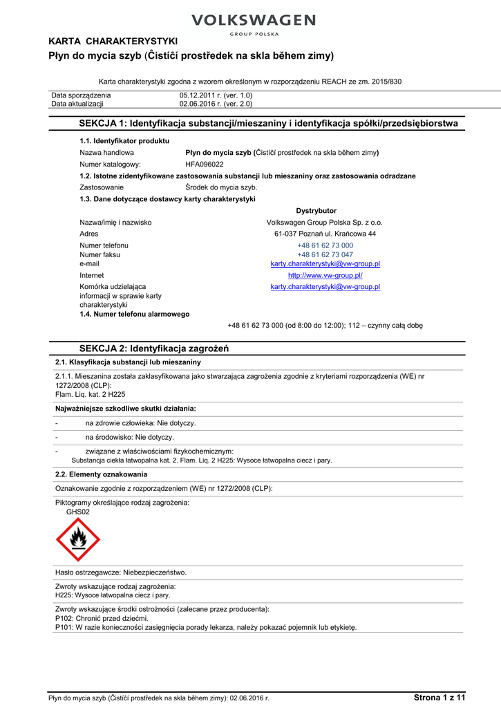 KARTA CHARAKTERYSTYKI Płyn do mycia szyb (Ĉistíĉí prostředek na skla během zimy) Karta charakterystyki zgodna z wzorem określonym w rozporządzeniu REACH ze zm. 2015/830 Data sporządzenia Data aktualizacji 05.12.2011 r. (ver. 1.0) 02.06.2016 r. (ver. 2.0) SEKCJA 1: Identyfikacja substancji/mieszaniny i identyfikacja spółki/przedsiębiorstwa 1.1. Identyfikator produktu Nazwa handlowa Płyn do mycia szyb (Ĉistíĉí prostředek na skla během zimy) Numer katalogowy: HFA096022 1.2. Istotne zidentyfikowane zastosowania substancji lub mieszaniny oraz zastosowania odradzane Zastosowanie Środek do mycia szyb. 1.3. Dane dotyczące dostawcy karty charakterystyki Dystrybutor Nazwa/imię i nazwisko Volkswagen Group Polska Sp. z o.o. 61-037 Poznań ul. Krańcowa 44 Adres Numer telefonu Numer faksu e-mail +48 61 62 73 000 +48 61 62 73 047 [email protected] Internet http://www.vw-group.pl/ Komórka udzielająca informacji w sprawie karty charakterystyki 1.4. Numer telefonu alarmowego [email protected] +48 61 62 73 000 (od 8:00 do 12:00); 112 – czynny całą dobę SEKCJA 2: Identyfikacja zagrożeń 2.1. Klasyfikacja substancji lub mieszaniny 2.1.1. Mieszanina została zaklasyfikowana jako stwarzająca zagrożenia zgodnie z kryteriami rozporządzenia (WE) nr 1272/2008 (CLP): Flam. Liq. kat. 2 H225 Najważniejsze szkodliwe skutki działania: - na zdrowie człowieka: Nie dotyczy. - na środowisko: Nie dotyczy. - związane z właściwościami fizykochemicznym: Substancja ciekła łatwopalna kat. 2. Flam. Liq. 2 H225: Wysoce łatwopalna ciecz i pary. 2.2. Elementy oznakowania Oznakowanie zgodnie z rozporządzeniem (WE) nr 1272/2008 (CLP): Piktogramy określające rodzaj zagrożenia: GHS02 Hasło ostrzegawcze: Niebezpieczeństwo. Zwroty wskazujące rodzaj zagrożenia: H225: Wysoce łatwopalna ciecz i pary. Zwroty wskazujące środki ostrożności (zalecane przez producenta): P102: Chronić przed dziećmi. P101: W razie konieczności zasięgnięcia porady lekarza, należy pokazać pojemnik lub etykietę. Płyn do mycia szyb (Ĉistíĉí prostředek na skla během zimy): 02.06.2016 r. Strona 1 z 11 KARTA CHARAKTERYSTYKI Płyn do mycia szyb (Ĉistíĉí prostředek na skla během zimy) SEKCJA 2: Identyfikacja zagrożeń P501: Zawartość/pojemnik usuwać zgodnie z lokalnymi przepisami. Informacje uzupełniające o zagrożeniach: Nie podano Etykieta powinna zawierać identyfikator produktu, o którym mowa w art. 18 rozp. CLP oraz nazwę, adres i telefon dostawcy danej mieszaniny. Dane identyfikujące wszystkie substancje w mieszaninie , które decydują o jej zaklasyfikowaniu zgodnie z Art. 18 pkt. 3b. Nie dotyczy Zawiera środki powierzchniowo czynne < 5% 2.3. Inne zagrożenia 2.3.1 Ocena PBT lub vPvB zgodnie z zał. XIII REACH – substancje zawarte w mieszaninie nie zostały zakwalifikowane jako PBT lub vPvB. Kryteria PBT i vPvB zawarte są w Aneksie XIII REACH. 2.3.2. Informacje dotyczące innych zagrożeń, które nie powodują zaklasyfikowania, a które mogą przyczynić się do ogólnych zagrożeń powodowanych przez mieszaninę. Nie podano. SEKCJA 3: Skład/informacja o składnikach 3.1. Substancje 3.2. Mieszaniny Opis ogólny: Produkt jest alkoholowym wodnym roztworem zawierającym anionowe środki powierzchniowo-czynne. Spis substancji w mieszaninie: a) Substancje stanowiące zagrożenie dla zdrowia lub środowiska: Etanol: Zawartość: Nr CAS: Nr WE: Nr indeksowy: Nr rejestracji: Klasyfikacja substancji zgodnie z rozporządzeniem (WE) nr 1272/2008 Etano-1,2-diol (glikol etylenowy): Zawartość: Nr CAS: Nr WE: Nr indeksowy: Nr rejestracji: Klasyfikacja substancji zgodnie z rozporządzeniem (WE) nr 1272/2008 Alkohole, C12-14, etoksylowane siarczany, sole sodowe [Alcohols, C12-14, ethoxylated, sulfates, sodium salts]: Zawartość: Nr CAS: Nr WE: Nr indeksowy: Nr rejestracji: Klasyfikacja substancji zgodnie z rozporządzeniem (WE) nr 1272/2008 50-55% 64-17-5 200-578-6 603-002-00-5 01-2119457610-43-xxxx Flam. Liq. 2 H225 20-25% 107-21-1 203-473-3 603-027-00-1 01-2119456816-28-xxxx Acute Tox. 4 H302 STOT RE2 H373 7-10% 68891-38-3 500-234-8 Skin Irrit. 2 H315 Eye Irrit. 2 H319 b) Substancje, dla których istnieją wspólnotowe najwyższe dopuszczalne stężenia w środowisku pracy, które nie zostały zawarte w lit. a): Wszystkie substancje dla których istnieją wspólnotowe najwyższe dopuszczalne stężenia w środowisku pracy wymieniono w lit. a) c) substancje trwałe, wykazujące zdolność do bioakumulacji i toksyczne lub bardzo trwałe i wykazujące bardzo dużą zdolność do bioakumulacji zgodnie z kryteriami zawartymi w załączniku XIII lub substancje zawarte w wykazie sporządzonym zgodnie z art. 59 ust. 1 z powodów innych niż zagrożenia, o których mowa w lit. a): W mieszaninie nie występują ww. substancje. Objaśnienia stosowanych skrótów podano w sekcji 16. Płyn do mycia szyb (Ĉistíĉí prostředek na skla během zimy): 02.06.2016 r. Strona 2 z 11 KARTA CHARAKTERYSTYKI Płyn do mycia szyb (Ĉistíĉí prostředek na skla během zimy) SEKCJA 4: Środki pierwszej pomocy 4.1. Opis środków pierwszej pomocy Narażenie przez drogi oddechowe Wyprowadzić lub wynieść poszkodowanego z zatrutej atmosfery na świeże powietrze. W przypadku utrzymujących się dolegliwości wezwać lekarza. Zapewnić poszkodowanemu ciepło i warunki do odpoczynku. Kontakt ze skórą Umyć skórę dużą ilością wody z mydłem i dobrze spłukać. NIE STOSOWAĆ rozpuszczalników ani rozcieńczalników. Jeśli wystąpi podrażnienie zapewnić konsultację dermatologiczną. Uwaga! Produkt wchłania się przez skórę. Zabrudzoną odzież wyprać przed ponownym użyciem. Kontakt z oczami Usunąć szkła kontaktowe (jeżeli są noszone). Natychmiast przemywać oczy dużą ilością letniej wody, przez co najmniej 15 min. (przy odwiniętych powiekach), unikać silnego strumienia wody ze względu na ryzyko uszkodzenia rogówki, w przypadku zanieczyszczenia jednego oka, chronić w trakcie przemywania