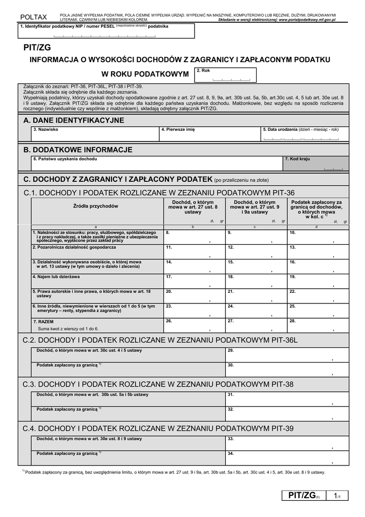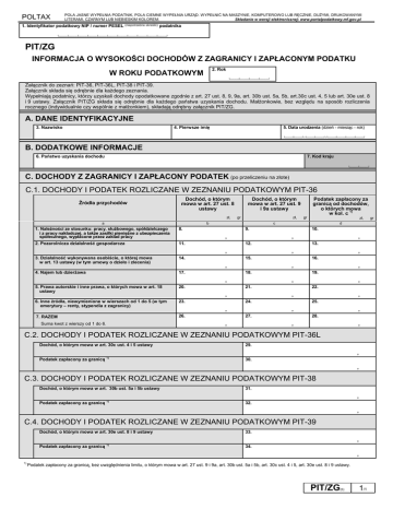 POLA JASNE WYPEŁNIA PODATNIK, POLA CIEMNE WYPEŁNIA URZĄD. WYPEŁNIĆ NA MASZYNIE, KOMPUTEROWO LUB RĘCZNIE, DUŻYMI, DRUKOWANYMI LITERAMI, CZARNYM LUB NIEBIESKIM KOLOREM. Składanie w wersji elektronicznej: www.portalpodatkowy.mf.gov.pl POLTAX 1. Identyfikator podatkowy NIP / numer PESEL (niepotrzebne skreślić) podatnika └────┴────┴────┴────┴────┴────┴────┴────┴────┴────┴────┘ PIT/ZG INFORMACJA O WYSOKOŚCI DOCHODÓW Z ZAGRANICY I ZAPŁACONYM PODATKU 2. Rok W ROKU PODATKOWYM └────┴────┴────┴────┘ Załącznik do zeznań: PIT-36, PIT-36L, PIT-38 i PIT-39. Załącznik składa się odrębnie dla każdego zeznania. Wypełniają podatnicy, którzy uzyskali dochody opodatkowane zgodnie z art. 27 ust. 8, 9, 9a, art. 30b ust. 5a, 5b, art.30c ust. 4, 5 lub art. 30e ust. 8 i 9 ustawy. Załącznik PIT/ZG składa się odrębnie dla każdego państwa uzyskania dochodu. Małżonkowie, bez względu na sposób rozliczenia rocznego (indywidualnie czy wspólnie z małżonkiem), składają odrębny załącznik PIT/ZG. A. DANE IDENTYFIKACYJNE 3. Nazwisko 4. Pierwsze imię 5. Data urodzenia (dzień - miesiąc - rok) └────┴────┘-└────┴────┘-└────┴────┴────┴────┘ B. DODATKOWE INFORMACJE 6. Państwo uzyskania dochodu 7. Kod kraju └────┴────┘ C. DOCHODY Z ZAGRANICY I ZAPŁACONY PODATEK (po przeliczeniu na złote) C.1. DOCHODY I PODATEK ROZLICZANE W ZEZNANIU PODATKOWYM PIT-36 Źródła przychodów Dochód, o którym mowa w art. 27 ust. 8 ustawy a b zł, 1. Należności ze stosunku: pracy, służbowego, spółdzielczego i z pracy nakładczej, a także zasiłki pieniężne z ubezpieczenia społecznego, wypłacone przez zakład pracy 8. 2. Pozarolnicza działalność gospodarcza 11. 3. Działalność wykonywana osobiście, o której mowa w art. 13 ustawy (w tym umowy o dzieło i zlecenia) 14. 4. Najem lub dzierżawa 17. 5. Prawa autorskie i inne prawa, o których mowa w art. 18 ustawy 20. 6. Inne źródła, niewymienione w wierszach od 1 do 5 (w tym emerytury – renty, stypendia z zagranicy) 23. 7. RAZEM 26. Dochód, o którym mowa w art. 27 ust. 9 i 9a ustawy gr zł, zł, c d 9. , 10. , 12. , , 13. , 15. , , 16. , 18. , Suma kwot z wierszy od 1 do 6. gr Podatek zapłacony za granicą od dochodów, o których mowa 1) w kol. c , 19. , 21. , , 22. , 24. , , 25. , 27. , , 28. , , C.2. DOCHODY I PODATEK ROZLICZANE W ZEZNANIU PODATKOWYM PIT-36L Dochód, o którym mowa w art. 30c ust. 4 i 5 ustawy 29. Podatek zapłacony za granicą 1) 30. , , C.3. DOCHODY I PODATEK ROZLICZANE W ZEZNANIU PODATKOWYM PIT-38 Dochód, o którym mowa w art. 30b ust. 5a i 5b ustawy 31. Podatek zapłacony za granicą 1) 32. , , C.4. DOCHODY I PODATEK ROZLICZANE W ZEZNANIU PODATKOWYM PIT-39 Dochód, o którym mowa w art. 30e ust. 8 i 9 ustawy 33. Podatek zapłacony za granicą 1) 34. , , 1) Podatek zapłacony za granicą, bez uwzględnienia limitu, o którym mowa w art. 27 ust. 9 i 9a, art. 30b ust. 5a i 5b, art. 30c ust. 4 i 5, art. 30e ust. 8 i 9 ustawy. PIT/ZG (5) 1/1 gr