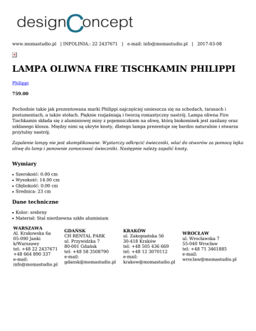 www.momastudio.pl | INFOLINIA.: 22 2437671 | e-mail: [email protected] | 2017-03-08 LAMPA OLIWNA FIRE TISCHKAMIN PHILIPPI Philippi 759.00 Pochodnie takie jak prezentowana marki Philippi najczęściej umieszcza się na schodach, tarasach i postumentach, a także stołach. Pięknie rozjaśniają i tworzą romantyczny nastrój. Lampa oliwna Fire Tischkamin składa się z aluminiowej misy z pojemniczkiem na oliwę, którą biokominek jest zasilany oraz szklanego klosza. Między nimi są ukryte knoty, dlatego lampa prezentuje się bardzo naturalnie i stwarza przytulny nastrój. Zapalenie lampy nie jest skomplikowane. Wystarczy odkręcić świeczniki, wlać do otworów za pomocą lejka oliwę do lamp i ponownie zamocować świeczniki. Następnie należy zapalić knoty. Wymiary ● ● ● ● Szerokość: 0.00 cm Wysokość: 14.00 cm Głębokość: 0.00 cm Średnica: 23 cm Dane techniczne ● ● Kolor: srebrny Materiał: Stal nierdzewna szkło aluminium WARSZAWA Al. Krakowska 6a 05-090 Janki k/Warszawy tel: +48 22 2437671 +48 664 890 337 e-mail: [email protected] GDAŃSK CH RENTAL PARK ul. Przywidzka 7 80-001 Gdańsk tel: +48 58 3508790 e-mail: [email protected] KRAKÓW ul. Zakopiańska 56 30-418 Kraków tel: +48 505 436 669 tel: +48 12 3070112 e-mail: [email protected] WROCŁAW ul. Wrocławska 7 55-040 Wrocław tel: +48 71 3461885 e-mail: [email protected]