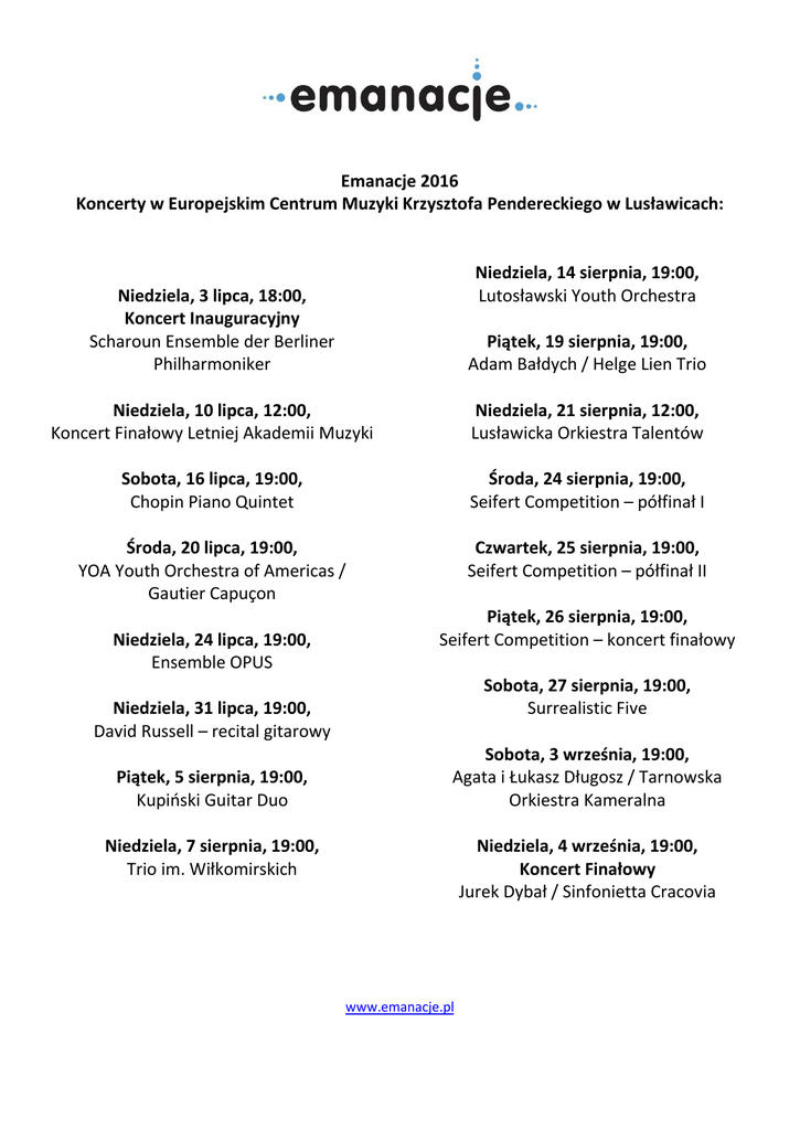 Emanacje 2016 Koncerty w Europejskim Centrum Muzyki Krzysztofa Pendereckiego w Lusławicach: Niedziela, 14 sierpnia, 19:00, Lutosławski Youth Orchestra Niedziela, 3 lipca, 18:00, Koncert Inauguracyjny Scharoun Ensemble der Berliner Philharmoniker Piątek, 19 sierpnia, 19:00, Adam Bałdych / Helge Lien Trio Niedziela, 10 lipca, 12:00, Koncert Finałowy Letniej Akademii Muzyki Niedziela, 21 sierpnia, 12:00, Lusławicka Orkiestra Talentów Sobota, 16 lipca, 19:00, Chopin Piano Quintet Środa, 24 sierpnia, 19:00, Seifert Competition – półfinał I Środa, 20 lipca, 19:00, YOA Youth Orchestra of Americas / Gautier Capuçon Czwartek, 25 sierpnia, 19:00, Seifert Competition – półfinał II Niedziela, 24 lipca, 19:00, Ensemble OPUS Piątek, 26 sierpnia, 19:00, Seifert Competition – koncert finałowy Sobota, 27 sierpnia, 19:00, Surrealistic Five Niedziela, 31 lipca, 19:00, David Russell – recital gitarowy Piątek, 5 sierpnia, 19:00, Kupiński Guitar Duo Sobota, 3 września, 19:00, Agata i Łukasz Długosz / Tarnowska Orkiestra Kameralna Niedziela, 7 sierpnia, 19:00, Trio im. Wiłkomirskich Niedziela, 4 września, 19:00, Koncert Finałowy Jurek Dybał / Sinfonietta Cracovia www.emanacje.pl Koncerty w regionie: Gorlice / Dwór Karwacjanów: 3 lipca, 18:00 Koncert pedagogów Young Arts Masterclass 6 sierpnia, 18:00 Tro im. Wiłkomirskich Dębno / Zamek: 17 lipca, 16:00 Koncert studentów Mistrzowskich Warsztatów Akordeonowych Krzeszowice / Pałac Vauxhall: 17 lipca, 17:00 Bojanowicz / Koziak Duo Nowy Wiśnicz / Zamek: 8 lipca, 19:00 Studenci i pedagodzy LAM 20 sierpnia, 19:00 Lusławicka Orkiestra Talentów Nowy Sącz / MCK Sokół: 26 lipca, 19:00 Korean Young Artists / Ensemble OPUS 28 sierpnia, 19:00 Surrealistic Five Biecz / Kościół Św. Anny: 9 lipca, 18:30 Studenci i pedagodzy LAM Kraków / Dworek Białoprądnicki: 13 sierpnia, 19:00 Koncert laureatek I Międzynarodowego Konkursu im. G. Bacewicz Anne Luisa Kramb, Sławomira WIlga Zakopane / Willa Atma: 9 lipca, 17:00 Ravel Piano Duo Krosno / Rynek: 10 lipca, 19:30 Krzesimir Dębski/ Orkiestra Young Arts Masterclass Kąśna Dolna / Dworek-Centrum Paderewskiego: 15 lipca, 19:00 Won-Sook Hur – recital fortepianowy 5 sierpnia, 19:00 Ratimir Martinović – recital fortepianowy Szczawnica / Dworek Gościnny: 13 sierpnia, 19:00 Bartosz Smorągiewicz Gypsy Jazz Ensemble Stary Sącz / Sokół: 14 sierpnia, 18:00 Bartosz Smorągiewicz Gypsy Jazz Ensemble Sucha Beskidzka / Zamek: 20 sierpnia, 19:00 Diverso Quartet Niepołomice / Zamek Królewski: 15 lipca, 19:00 Chopin Piano Quintet Szymbark / Kasztel: 16 lipca, 18:00 Koncert pedagogów Mistrzowskich Warsztatów Akordeonowych Tarnów / Ratusz: 16 lipca, 18:00 Bojanowicz / Koziak Duo Tuchów / Bazylika: 20 sierpnia, 19:30 Krzysztof Jakowicz – recital skrzypcowy Oświęcim / Zamek: 21 sierpnia, 18:00 Diverso Quartet Lipnica Murowana / Kościół Św. Leonarda: 21 sierpnia, 17:00 Krzysztof Jakowicz – recital skrzypcowy www.emanacje.pl