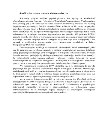 Sposób wykorzystania wzorców międzynarodowych Stworzony program studiów psychologicznych jest zgodny ze standardami sformułowanymi przez European Federation of Psychologist’s Associations. W dokumentach tejże federacji (np. EFPA Declaration on the European Standards of education and training in professional psychology – EuroPsy z czerwca 2006) podkreśla się, iż z uwagi na specyfikę zawodu psychologa (który w Polsce spełnia kryteria zawodu zaufania publicznego, o którym mówi Konstytucja RP) do wykonywania tej profesji upoważniają co najmniej 5-letnie studia uniwersyteckie w pełnym wymiarze (zgromadzenie co najmniej 300 punktów ECTS), ponadto praktyka zawodowa w warunkach superwizji oraz akceptacja zawodowego kodeksu etycznego. EuroPsy obejmuje swoim zasięgiem wszystkie kraje Unii Europejskiej i ma związek z możliwością otrzymywania przez absolwentów psychologii w Polsce Europejskiego Dyplomu Psychologa. Takie wymagania wynikają ze złożoności i różnorodności zadań zawodowych, jakie ma do zrealizowania psycholog (pracuje z osobami potrzebującymi pomocy, świadcząc usługi psychologiczne różnego typu, występuje w roli eksperta, jest nauczycielem, prowadzi badania naukowe, posługuje się wiedzą psychologiczną, wykonując również inne zawody). Ta różnorodność zadań wymaga rozległej i głębokiej wiedzy fachowej, na której nadbudowywane są stopniowo umiejętności dostrzegania i rozwiązywania problemów praktycznych, kompetencje interpersonalne oraz świadomość i wrażliwość etyczna. We wspomnianym dokumencie EFPA stwierdza się, iż w odniesieniu do zawodu psychologa nie jest możliwe zastosowanie reguły wynikającej z Procesu Bolońskiego, zakładającej możliwość przygotowania pracownika na potrzeby rynku pracy w ciągu trzech lat kształcenia w ramach studiów I stopnia. Proces kształcenia psychologicznego musi być odpowiednio dłuższy, a poszczególne etapy ściśle ze sobą powiązane. Innym ważnym dokumentem, na którym opiera się program jest Meta-Code of Ethics zaakceptowany w 2005 roku przez European Federation of Psychologists’ Associations. W dokumencie tym zwraca się uwagę na konieczność kształtowania u psychologów najwyższych standardów etycznych i odpowiedzialności za wykonywaną pracę. Odpowiedzialność ta w znacznym stopniu spoczywa na instytucjach kształcących psychologów i bezpośrednio na nauczycielach akademickich.