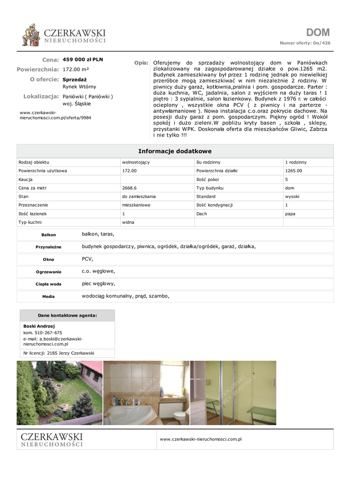 DOM Numer oferty: Do/426 Cena: 459 000 zł PLN Opis: Oferujemy do sprzadaży wolnostojący dom w Paniówkach zlokalizowany na zagospodarowanej działce o pow.1265 m2. Budynek zamieszkiwany był przez 1 rodzinę jednak po niewielkiej przeróbce mogą zamieszkiwać w nim niezależnie 2 rodziny. W piwnicy duży garaż, kotłownia,pralnia i pom. gospodarcze. Parter : duża kuchnia, WC, jadalnia, salon z wyjściem na duży taras ! 1 piętro : 3 sypialnie, salon łazienkowy. Budynek z 1976 r. w całości ocieplony , wszystkie okna PCV ( z piwnicy i na parterze antywłamaniowe ). Nowa instalacja c.o.oraz pokrycie dachowe. Na posesji duży garaż z pom. gospodarczym. Piękny ogród ! Wokół spokój i dużo zieleni.W pobliżu kryty basen , szkoła , sklepy, przystanki WPK. Doskonała oferta dla mieszkańców Gliwic, Zabrza i nie tylko !!! Powierzchnia: 172.00 m² O ofercie: Sprzedaż Rynek Wtórny Lokalizacja: Paniówki ( Paniówki ) woj. Śląskie www.czerkawskinieruchomosci.com.pl/oferta/9984 Informacje dodatkowe Rodzaj obiektu wolnostojący Ilu rodzinny 1 rodzinny Powierzchnia użytkowa 172.00 Powierzchnia działki 1265.00 Ilość pokoi 5 Kaucja Cena za metr 2668.6 Typ budynku dom Stan do zamieszkania Standard wysoki Przeznaczenie mieszkaniowe Ilość kondygnacji 1 Ilość łazienek 1 Dach papa Typ kuchni widna Balkon Przynależne Okna balkon, taras, budynek gospodarczy, piwnica, ogródek, działka/ogródek, garaż, działka, PCV, Ogrzewanie c.o. węglowe, Ciepła woda piec węglowy, Media wodociąg komunalny, prąd, szambo, Dane kontaktowe agenta: Boski Andrzej kom. 510-267-675 e-mail: [email protected] Nr licencji: 2185 Jerzy Czerkawski www.czerkawski-nieruchomosci.com.pl