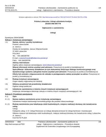 Dz.U./S S56 20/03/2015 97778-2015-PL Państwa członkowskie - Zamówienie publiczne na usługi - Ogłoszenie o zamówieniu - Procedura otwarta 1/6 Niniejsze ogłoszenie w witrynie TED: http://ted.europa.eu/udl?uri=TED:NOTICE:97778-2015:TEXT:PL:HTML Polska-Lubaczów: Usługi udzielania kredytu 2015/S 056-097778 Ogłoszenie o zamówieniu Usługi Dyrektywa 2004/18/WE Sekcja I: Instytucja zamawiająca I.1) Nazwa, adresy i punkty kontaktowe Powiat Lubaczowski ul. Jasna 1 Osoba do kontaktów: Janusz Wojciechowski 37-600 Lubaczów POLSKA Tel.: +48 166328700 E-mail: [email protected] Faks: +48 166328709 Adresy internetowe: Ogólny adres instytucji zamawiającej: www.lubaczow.powiat.pl Więcej informacji można uzyskać pod adresem: Powyższy(-e) punkt(-y) kontaktowy(-e) Specyfikacje i dokumenty dodatkowe (w tym dokumenty dotyczące dialogu konkurencyjnego oraz dynamicznego systemu zakupów) można uzyskać pod adresem: Powyższy(-e) punkt(-y) kontaktowy(-e) Oferty lub wnioski o dopuszczenie do udziału w postępowaniu należy przesyłać na adres: Powyższy(-e) punkt(-y) kontaktowy(-e) I.2) Rodzaj instytucji zamawiającej Organ władzy regionalnej lub lokalnej I.3) Główny przedmiot lub przedmioty działalności Ogólne usługi publiczne I.4) Udzielenie zamówienia w imieniu innych instytucji zamawiających Instytucja zamawiająca dokonuje zakupu w imieniu innych instytucji zamawiających: nie Sekcja II: Przedmiot zamówienia II.1) Opis II.1.1) Nazwa nadana zamówieniu przez instytucję zamawiającą: Udzielenie kredytu bankowego konsolidacyjnego dla powiatu lubaczowskiego. II.1.2) Rodzaj zamówienia oraz lokalizacja robót budowlanych, miejsce realizacji dostawy lub świadczenia usług Usługi Kategoria usług: nr 6: Usługi finansowe a) Usługi ubezpieczeniowe b) Usługi bankowe i inwestycyjne Główne miejsce lub lokalizacja robót budowlanych, miejsce realizacji dostawy lub świadczenia usług: Lubaczów, ul. Jasna 1. Kod NUTS PL324 20/03/2015 S56 http://ted.europa.eu/TED Państwa członkowskie - Zamówienie publiczne na usługi - Ogłoszenie o zamówieniu - Procedura otwarta Suplement do Dziennika Urzędowego Unii Europejskiej 1/6 Dz.U./S S56 20/03/2015 97778-2015-PL Państwa członkowskie - Zamówienie publiczne na usługi - Ogłoszenie o zamówieniu - Procedura otwarta 2/6 II.1.3) Informacje na temat zamówienia publicznego, umowy ramowej lub dynamicznego systemu zakupów (DSZ) Ogłoszenie dotyczy zamówienia publicznego II.1.4) Informacje na temat umowy ramowej II.1.5) Krótki opis zamówienia lub zakupu Przedmiotem zamówienia jest udzielenie kredytu bankowego konsolidacyjnego w kwocie 26 230 557,40 PLN dla powiatu lubaczowskiego z przeznaczeniem na spłatę zobowiązań z tytułu wcześniej zaciągniętego kredytu bankowego. — Kredyt konsolidacyjny nie wpłynie na rachunek bankowy Powiatu, a bank kredytujący dokona bezpośrednio spłat dotychczasowego zadłużenia wobec banku, w którym Powiat ma zaciągnięty kredyt bankowy. — Kredyt konsolidacyjny nie spowoduje zwiększenia zadłużenia Powiatu. — Okres kredytowania: do 31.12.2030. — Spłata kredytu nastąpi w 56 kwartalnych ratach płatnych na ostatni roboczy dzień każdego miesiąca kończącego dany kwartał począwszy od 31.3.2017. — Spłata odsetek od kredytu nastąpi w ratach kwartalnych płatnych ostatniego dnia miesiąca kończącego dany kwartał począwszy od 30.6.2015. — W przypadku spłaty kredytu we wcześniejszym terminie odsetki będą naliczane do dnia spłaty. — Zamawiający przewiduje możliwość zmiany wysokości spłaty rat kapitału w poszczególnych latach kredytowania. — Zamawiający zastrzega sobie prawo do wcześniejszej spłaty kredytu w całości lub w części bez ponoszenia dodatkowych opłat. II.1.6) Wspólny Słownik Zamówień (CPV) 66113000 II.1.7) Informacje na temat Porozumienia w sprawie zamówień rządowych (GPA) Zamówienie jest objęte Porozumieniem w sprawie zamówień rządowych (GPA): nie II.1.8) Części To zamówienie podzielone jest na części: nie II.1.9) Informacje o ofertach wariantowych Dopuszcza się składanie ofert wariantowych: nie II.2) Wielkość lub zakres zamówienia II.2.1) Całkowita wielkość lub zakres: Kredyt bankowy konsolidacyjny w kwocie 26 230 557,40 PLN dla powiatu lubaczowskiego z przeznaczeniem na spłatę zobowiązań z tytułu wcześniej zaciągniętego kredytu bankowego. II.2.2) Informacje o opcjach Opcje: nie II.2.3) Informacje o wznowieniach Jest to zamówienie podlegające wznowieniu: nie II.3) Czas trwania zamówienia lub termin realizacji Rozpoczęcie 20.5.2015. Zakończenie 31.12.2030 Sekcja III: Informacje o charakterze prawnym, ekonomicznym, finansowym i technicznym III.1) Warunki dotyczące zamówienia III.1.1) Wymagane wadia i gwarancje: Każda oferta musi być zabezpieczona wadium w wysokości 300 000 PLN. 20/03/2015 S56 http://ted.europa.eu/TED Państwa członkowskie - Zamówienie publiczne na usługi - Ogłoszenie o zamówieniu - Procedura otwarta Suplement do Dziennika Urzędowego Unii Europejskiej 2/6 Dz.U./S S56 20/03/2015 97778-2015-PL Państwa członkowskie - Zamówienie publiczne na usługi - Ogłoszenie o zamówieniu - Procedura otwarta 3/6 Gwarancja ubezpieczeniowa lub gwarancja bankowa złożona jako zabezpieczenie wadium musi posiadać okres ważności nie krótszy niż okres związania ofertą, pod rygorem wykluczenia Wykonawcy z postępowania. Wadium może być wnoszone w następujących formach: 1) pieniądzu; 2) poręczeniach bankowych lub poręczeniach spółdzielczej kasy oszczędnościowo-kredytowej, z tym że poręczenie kasy jest zawsze poręczeniem pieniężnym; 3) gwarancjach bankowych; 4) gwarancjach ubezpieczeniowych; 5) poręczeniach udzielanych przez podmioty, o których mowa w art. 6b ust. 5 pkt 2 ustawy z 9.11.2000 o utworzeniu Polskiej Agencji Rozwoju Przedsiębiorczości (Dz.U. nr 109, poz. 1158, z późn. zm.). Wadium wnoszone w pieniądzu należy wpłacić przelewem na rachunek bankowy: Powiatowy 