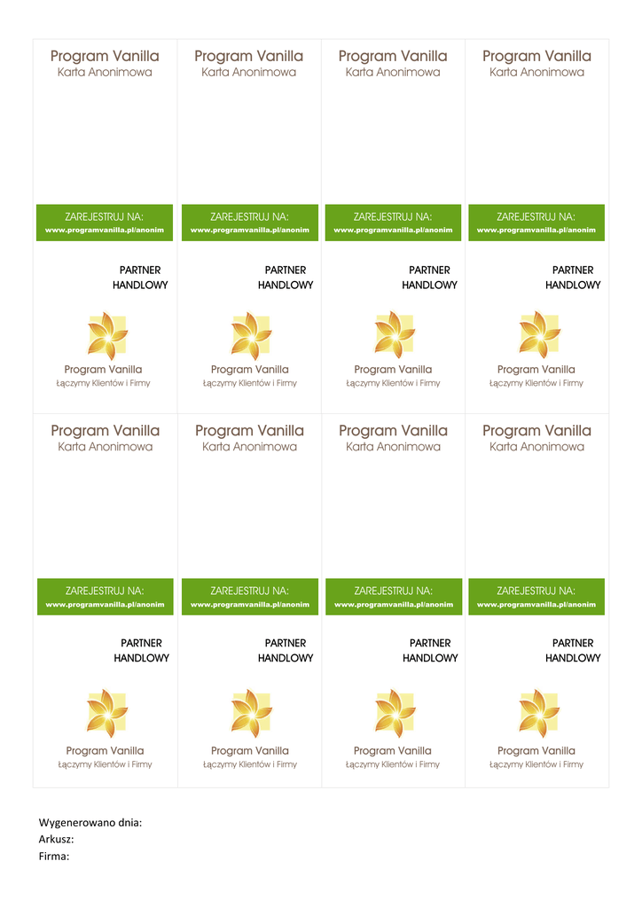 Program Vanilla Program Vanilla Program Vanilla Program Vanilla Karta Anonimowa Karta Anonimowa Karta Anonimowa Karta Anonimowa ZAREJESTRUJ NA: ZAREJESTRUJ NA: ZAREJESTRUJ NA: ZAREJESTRUJ NA: www.programvanilla.pl/anonim www.programvanilla.pl/anonim www.programvanilla.pl/anonim www.programvanilla.pl/anonim PARTNER HANDLOWY PARTNER HANDLOWY PARTNER HANDLOWY PARTNER HANDLOWY Program Vanilla Program Vanilla Program Vanilla Program Vanilla Łączymy Klientów i Firmy Łączymy Klientów i Firmy Łączymy Klientów i Firmy Łączymy Klientów i Firmy Program Vanilla Program Vanilla Program Vanilla Program Vanilla Karta Anonimowa Karta Anonimowa Karta Anonimowa Karta Anonimowa ZAREJESTRUJ NA: ZAREJESTRUJ NA: ZAREJESTRUJ NA: ZAREJESTRUJ NA: ZAREJESTRUJ NA: ZAREJESTRUJ NA: www.programvanilla.pl/anonim www.programvanilla.pl/anonim www.programvanilla.pl/anonim www.programvanilla.pl/anonim PARTNER HANDLOWY PARTNER HANDLOWY PARTNER HANDLOWY PARTNER HANDLOWY Program Vanilla Program Vanilla Program Vanilla Program Vanilla Łączymy Klientów i Firmy Łączymy Klientów i Firmy Łączymy Klientów i Firmy Łączymy Klientów i Firmy Wygenerowano dnia: Arkusz: Firma: