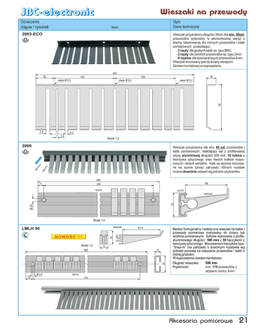 Wieszaki na przewody Oznaczenie Zdjêcie / rysunek Opis Dane techniczne Skala 2003-ECO Wieszak przyœcienny d³ugoœci 26cm dla min. 50szt. przewodów wykonany w ekonomicznej wersji z blachy lakierowanej dla ró¿nych przewodów i kabli pomiarowych posiadaj¹cy: - 2 rzêdy dla grubych kabli np. typu BNC, - 2 rzêdy dla cienkich przewodów np. typu 2mm, - 9 rzêdów dla standardowych przewodów 4mm. Wieszak mocowany jest do œciany wkrêtami. Zestaw monta¿owy w wyposa¿eniu. 260 30 100 16 100 otwór Ø 5.2 otwór Ø 5.2 82 otwór Ø 5.2 5.8 4.2 2.8 Skala 1:2 2000 Wieszak przyœcienny dla min. 60 szt. przewodów i kabli pomiarowych, sk³adaj¹cy siê z profilowanej szyny aluminiowej d³ugoœci 350 mm, 18 haków z tworzywa sztucznego oraz dwóch ko³ków rozporowych i dwóch wkrêtów. Haki s¹ rêcznie mocowane na szynie (przez zatrzask), których rozstaw mo¿na dowolnie ustawiæ wg potrzeb u¿ytownika. 350 328 11 68 szyna szyna Ø 5.6 43 wieszak Skala 1:2 wieszak 61.4 24 LMLH 50 Skala 1:2 13 10 30 500 Ø 4.6 12 Bardzo funkcjonalny i estetyczny wieszak na kable i przewody pomiarowe mocowany do œciany lub wózków pomiarowych. Solidne wykonanie z profilu aluminiowego d³ugoœci 500 mm z 30 haczykami z tworzywa sztucznego. Mocowaniem haczyków typu “Snap-In” (na zatrzask) o dowolnym rozstawie wg potrzeb pozwala na wieszanie przewodów i kabli o ró¿nej gruboœci. W wyposa¿eniu zestaw monta¿owy. D³ugoœæ wieszaka: 500 mm Pojemnoœæ: min. 170 przewodów z wtykami normy 4mm szyna 476 Akcesoria pomiarowe 21 Stojaki pomiarowe na rolkach Oznaczenie Zdjêcie / rysunek Opis Dane techniczne / Skala Bardzo praktyczne stojaki na rolkach z wieszakami na przewody i kable pomiarowe. Stojaki sk³adaj¹ siê z pojemnika, który mo¿e byæ wykorzystywany na przyrz¹dy pomiarowe oraz akcesoria typu chwytaki, krokodylki, sondy probiercze, dwóch lub czterech przymocowanych do pojemnika wieszaków na przewody typu 2000 lub 2003-ECO (dok³adny opis na s¹siedniej stronie), niklowanego statywu z regulacj¹ wysokoœci stojaka od 100 cm do 180 cm oraz piêcioramiennej podstawy na rolkach, które pozwalaj¹ na swobodne przemieszczanie stojaka. Opis czêœci sk³adowych stojaka z wieszakami na przewody pomiarowe 2001-ECO 2002-ECO 1 - Piêcioramienna, stabilna podstawa stojaka z rolkami do swobodnego 2 3 3 4 4 przemieszczania. - Dwuczêœciowy statyw teleskopowy z pokrêt³em blokuj¹cym, umo¿liwiaj¹cy regulacjê wysokoœci pojemnika z wieszakami w zakresie od 1 m do 1,8 m. - Pojemnik z twardego tworzywa o wymiarach 36 × 26 cm i g³êbokoœci 7cm, przeznaczony na przyrz¹dy pomiarowe lub akcesoria po³¹czeniowe. - Wieszaki na przewody pomiarowe wystêpuj¹ce w czterech wersjach wykonañ: 2001-ECO - dwa wieszaki w wersji ekonomicznej 2003-ECO, 2002-ECO - cztery wieszaki w wersji ekonomicznej 2003-ECO, 2001 - dwa wieszaki w wersji przesuwnych haków na szynie aluminiowej, 2002 - cztery wieszaki w wersji przesuwnych haków na szynie aluminiowej. 2001 2 2002-ECO - stojak na przewody w wersji z czterema wieszakami typu 2003-ECO 1 2001-ECO Widok z góry 2002-ECO 1:10 Stojak na rolkach z pojemnikiem na sprzêt pomiarowy (jak w ogólnym opisie) oraz z zamontowanymi dwoma wieszakami typu 2003-ECO na min. 100szt. przewodów i kabli pomiarowych. Wieszaki s¹ wykonane z lakierowanej blachy profilowanej ze szczelinami o ró¿nej szerokoœci. 22 Widok z góry 2001 1:10 Stojak na rolkach z pojemnikiem na sprzêt pomiarowy (jak w ogólnym opisie) oraz z zamontowanymi czterema wieszakami typu 2003-ECO na min. 200szt. przewodów i kabli pomiarowych. Wieszaki s¹ wykonane z lakierowanej blachy profilowanej ze szczelinami o ró¿nej szerokoœci. Akcesoria pomiarowe Widok z góry 1:10 Stojak na rolkach z pojemnikiem na sprzêt pomiarowy (jak w ogólnym opisie) oraz z zamontowanymi dwoma wieszakami typu 2000 na min. 120szt. przewodów i kabli pomiarowych. Wieszaki sk³adaj¹ siê 36 haków z tworzywa sztucznego mocowane na zatrzask w dwóch szynach z lakierowanego profilu aluminiowego. Szerokoœæ szczelin mo¿na dowolnie regulowaæ.