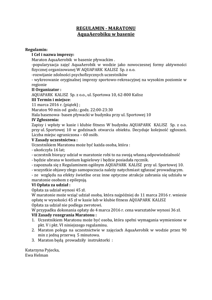 REGULAMIN - MARATONU AquaAerobiku w basenie Regulamin: I Cel i nazwa imprezy: Maraton AquaAerobik w basenie pływackim . -popularyzacja zajęć AquaAerobik w wodzie jako nowoczesnej formy aktywności fizycznej organizowanej W AQUAPARK KALISZ Sp. z o.o. -rozwijanie zdolności psychofizycznych uczestników - wykreowanie oryginalnej imprezy sportowo-rekreacyjnej na wysokim poziomie w regionie II Organizator : AQUAPARK KALISZ Sp. z o.o., ul. Sportowa 10, 62-800 Kalisz III Termin i miejsce: 11 marca 2016 r. (piątek) ; Maraton 90 min od godz.: godz. 22:00-23:30 Hala basenowa- basen pływacki w budynku przy ul. Sportowej 10 IV Zgłoszenia: Zapisy i wpłaty w kasie i klubie fitness W budynku AQUAPARK KALISZ Sp. z o.o. przy ul. Sportowej 10 w godzinach otwarcia obiektu. Decyduje kolejność zgłoszeń. Liczba miejsc ograniczona – 60 osób. V Zasady uczestnictwa : Uczestnikiem Maratonu może być każda osoba, która : - ukończyła 16 lat; - uczestnik biorący udział w maratonie robi to na swoją własną odpowiedzialność - będzie ubrana w kostium kąpielowy i będzie posiadała ręcznik. - zapoznała się z Regulaminem ogólnym AQUAPARK KALISZ przy ul. Sportowej 10. - wszystkie objawy złego samopoczucia należy natychmiast zgłaszać prowadzącym. - ze względu na efekty świetlne oraz inne optyczne atrakcje zabrania się udziału w maratonie osobom z epilepsją. VI Opłata za udział : Opłata za udział wynosi 45 zł. W maratonie może wziąć udział osoba, która najpóźniej do 11 marca 2016 r. wniesie opłatę w wysokości 45 zł w kasie lub w klubie fitness AQUAPARK KALISZ Opłata za udział nie podlega zwrotowi. W przypadku dokonania opłaty do 4 marca 2016 r. cena warsztatów wynosi 36 zł. VII Zasady rozegrania Maratonu : 1. Uczestnikiem Maratonu może być osoba, która spełni wymagania wymienione w pkt. V i pkt. VI niniejszego regulaminu. 2. Maraton polega na uczestnictwie w zajęciach AquaAerobik w wodzie przez 90 min z jedną przerwą 5 minutowa. 3. Maraton będą prowadziły instruktorki : Katarzyna Pyjecka, Ewa Helman VIII Uczestnicy biorący udział w zajęciach wyrażają zgodę na publikację swojego wizerunku utrwalonego w czasie zajęć w formie zdjęć lub filmów w gazetach, czasopismach okresowych, czasopismach okazjonalnych, folderach, bilbordach, publikacjach elektronicznych, stronach www, wystawach etc. IX Postanowienia końcowe: Organizator zastrzega sobie prawo do odwołania Maratonu bez podania przyczyny. Organizator zapewnia szatnie, natryski i toalety. Dla każdego uczestnika podczas trwania maratonu Organizator zapewnia drobne upominki.
