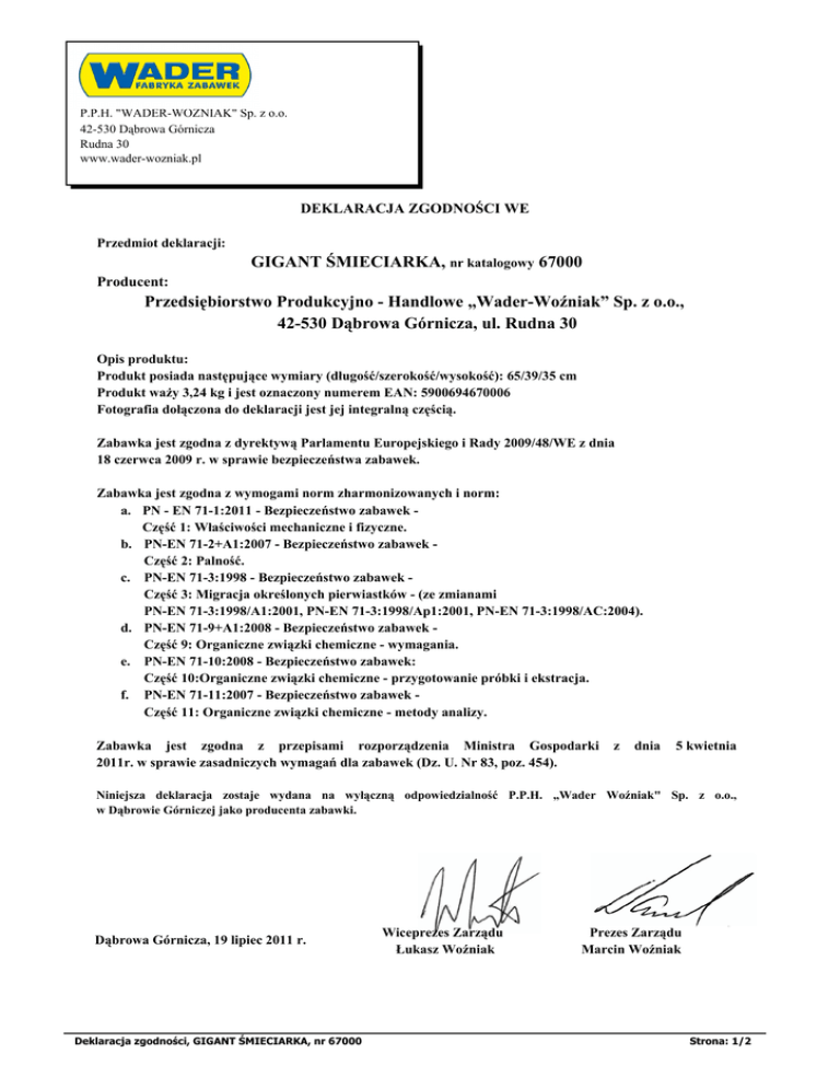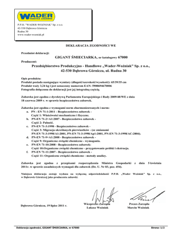 P.P.H. "WADER-WOŹNIAK" Sp. z o.o. 42-530 Dąbrowa Górnicza Rudna 30 www.wader-wozniak.pl DEKLARACJA ZGODNOŚCI WE Przedmiot deklaracji: GIGANT ŚMIECIARKA, nr katalogowy 67000 Producent: Przedsiębiorstwo Produkcyjno - Handlowe „Wader-Woźniak” Sp. z o.o., 42-530 Dąbrowa Górnicza, ul. Rudna 30 Opis produktu: Produkt posiada następujące wymiary (długość/szerokość/wysokość): 65/39/35 cm Produkt waży 3,24 kg i jest oznaczony numerem EAN: 5900694670006 Fotografia dołączona do deklaracji jest jej integralną częścią. Zabawka jest zgodna z dyrektywą Parlamentu Europejskiego i Rady 2009/48/WE z dnia 18 czerwca 2009 r. w sprawie bezpieczeństwa zabawek. Zabawka jest zgodna z wymogami norm zharmonizowanych i norm: a. PN - EN 71-1:2011 - Bezpieczeństwo zabawek Część 1: Właściwości mechaniczne i fizyczne. b. PN-EN 71-2+A1:2007 - Bezpieczeństwo zabawek Część 2: Palność. c. PN-EN 71-3:1998 - Bezpieczeństwo zabawek Część 3: Migracja określonych pierwiastków - (ze zmianami PN-EN 71-3:1998/A1:2001, PN-EN 71-3:1998/Ap1:2001, PN-EN 71-3:1998/AC:2004). d. PN-EN 71-9+A1:2008 - Bezpieczeństwo zabawek Część 9: Organiczne związki chemiczne - wymagania. e. PN-EN 71-10:2008 - Bezpieczeństwo zabawek: Część 10:Organiczne związki chemiczne - przygotowanie próbki i ekstracja. f. PN-EN 71-11:2007 - Bezpieczeństwo zabawek Część 11: Organiczne związki chemiczne - metody analizy. Zabawka jest zgodna z przepisami rozporządzenia Ministra Gospodarki 2011r. w sprawie zasadniczych wymagań dla zabawek (Dz. U. Nr 83, poz. 454). z dnia 5 kwietnia Niniejsza deklaracja zostaje wydana na wyłączną odpowiedzialność P.P.H. „Wader Woźniak" Sp. z o.o., w Dąbrowie Górniczej jako producenta zabawki. Dąbrowa Górnicza, 19 lipiec 2011 r. Deklaracja zgodności, GIGANT ŚMIECIARKA, nr 67000 Wiceprezes Zarządu Łukasz Woźniak Prezes Zarządu Marcin Woźniak Strona: 1/2 P.P.H. "WADER-WOŹNIAK" Sp. z o.o. 42-530 Dąbrowa Górnicza Rudna 30 www.wader-wozniak.pl DEKLARACJA ZGODNOŚCI WE GIGANT ŚMIECIARKA, nr katalogowy 67000 Deklaracja zgodności, GIGANT ŚMIECIARKA, nr 67000 Strona: 2/2
